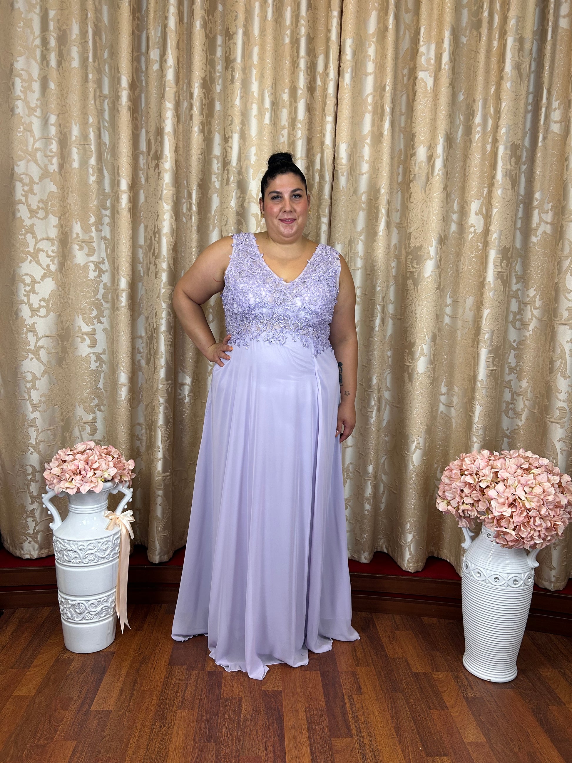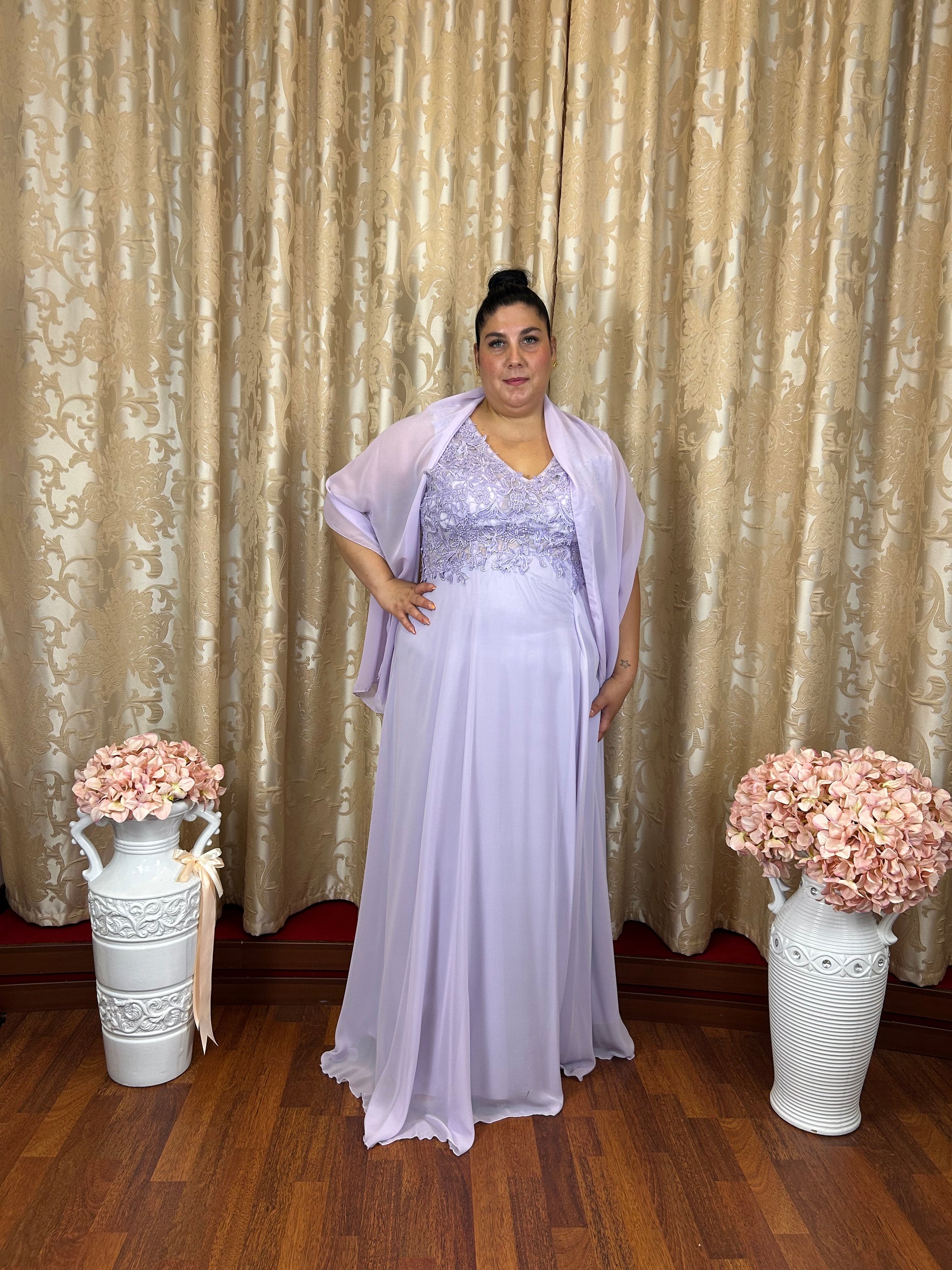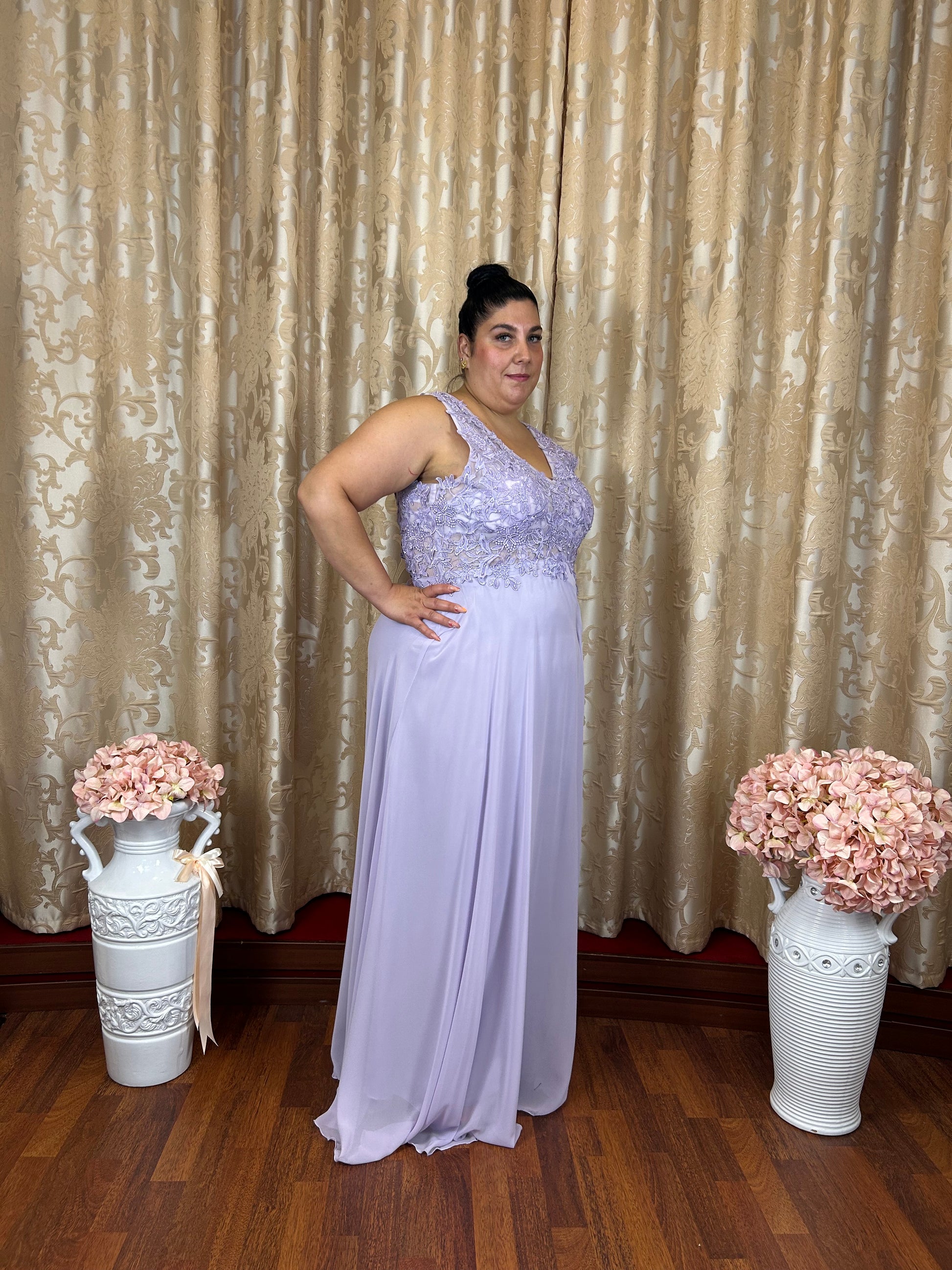 Raffinato abito da cerimonia curvy in delicata tonalità lavanda, perfetto per valorizzare la femminilità con eleganza e leggerezza.