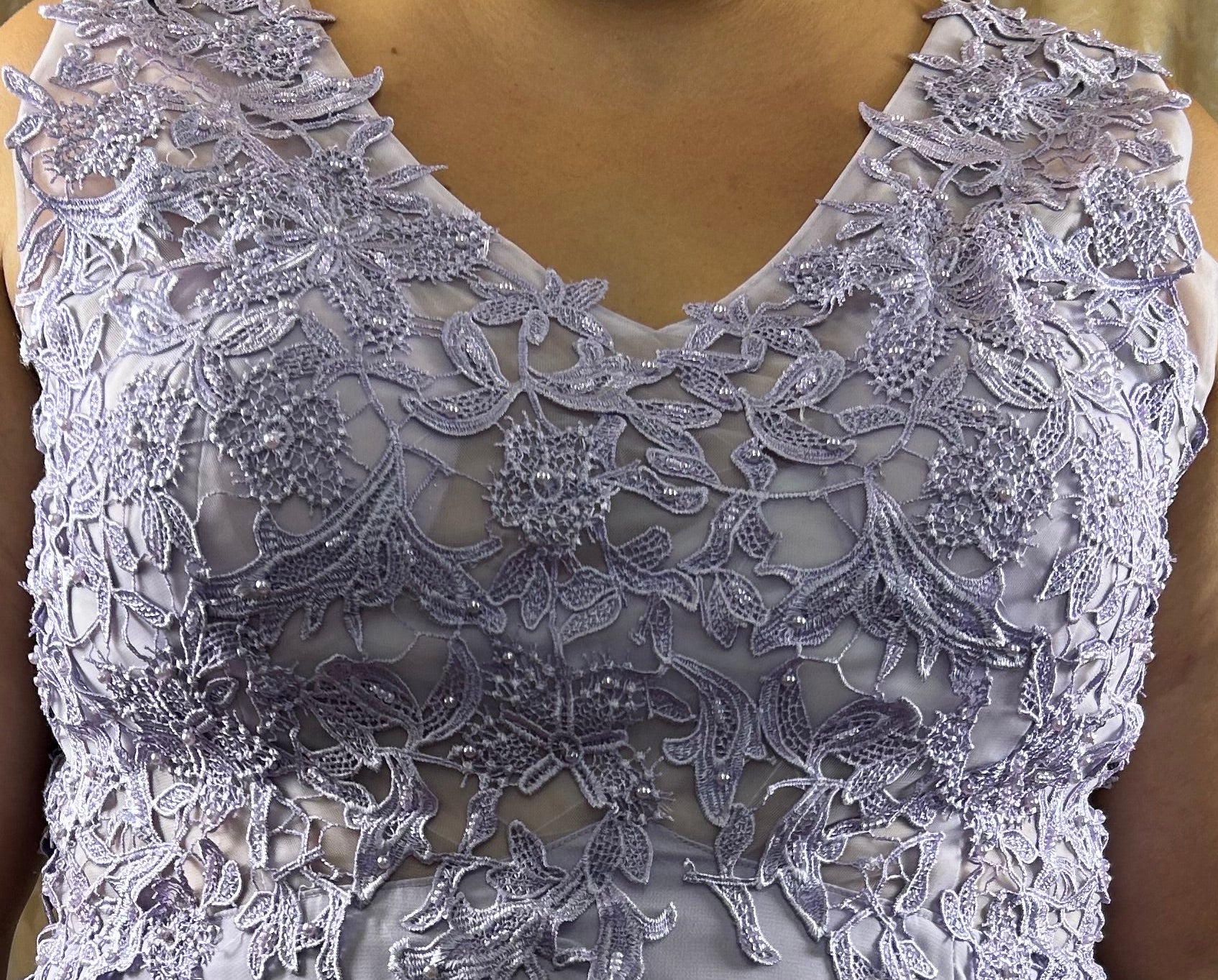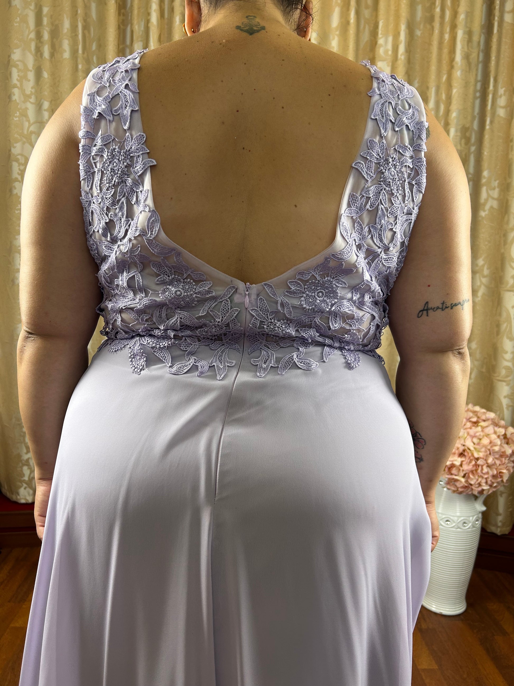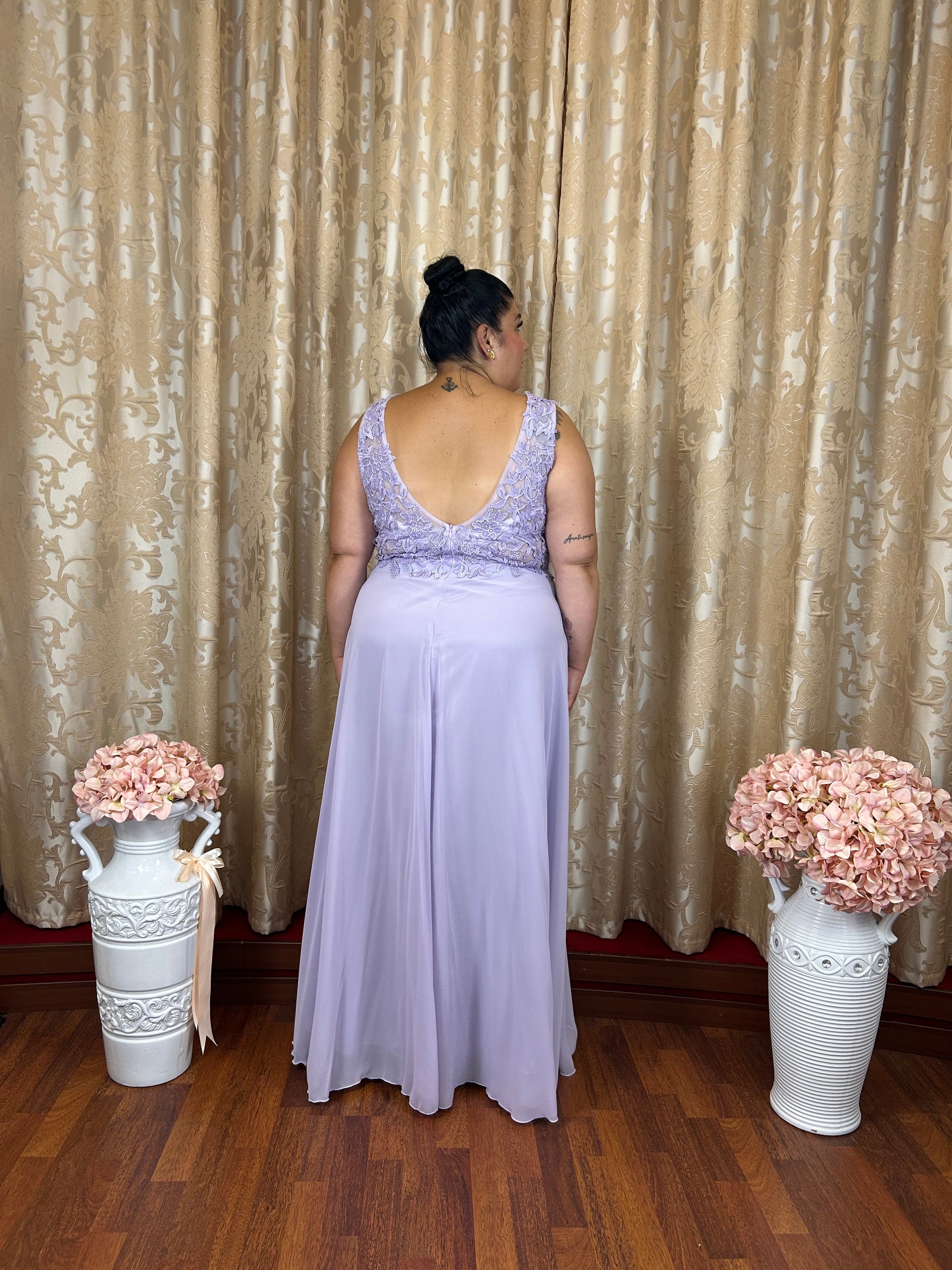 Raffinato abito da cerimonia curvy in delicata tonalità lavanda, perfetto per valorizzare la femminilità con eleganza e leggerezza.