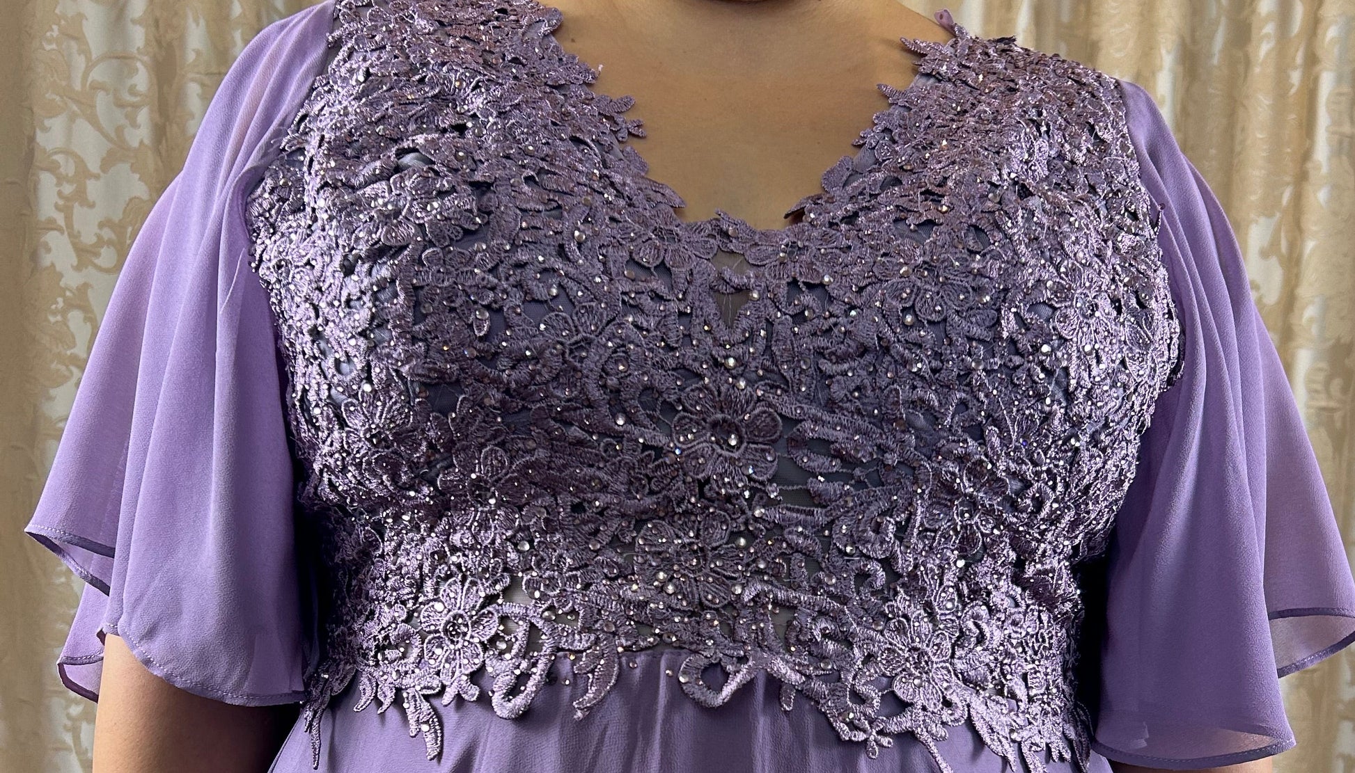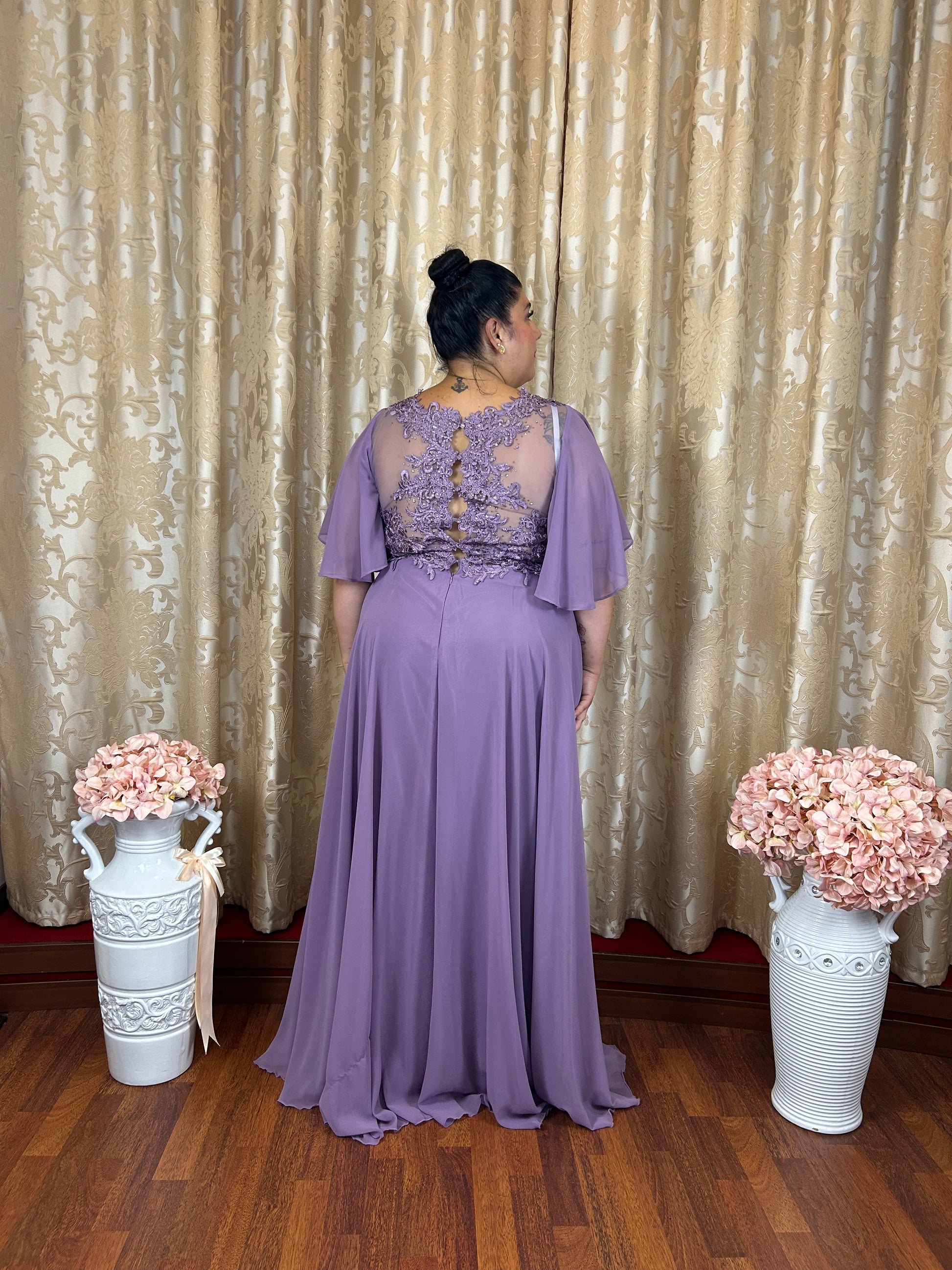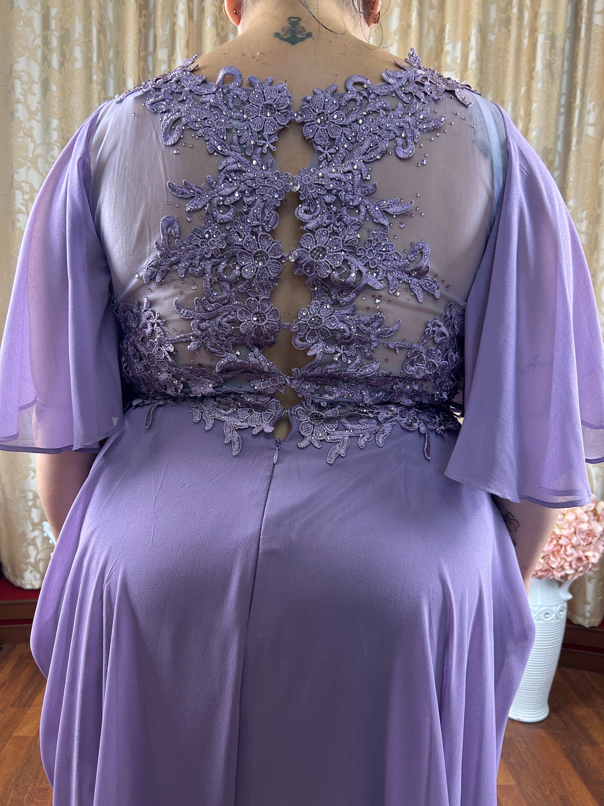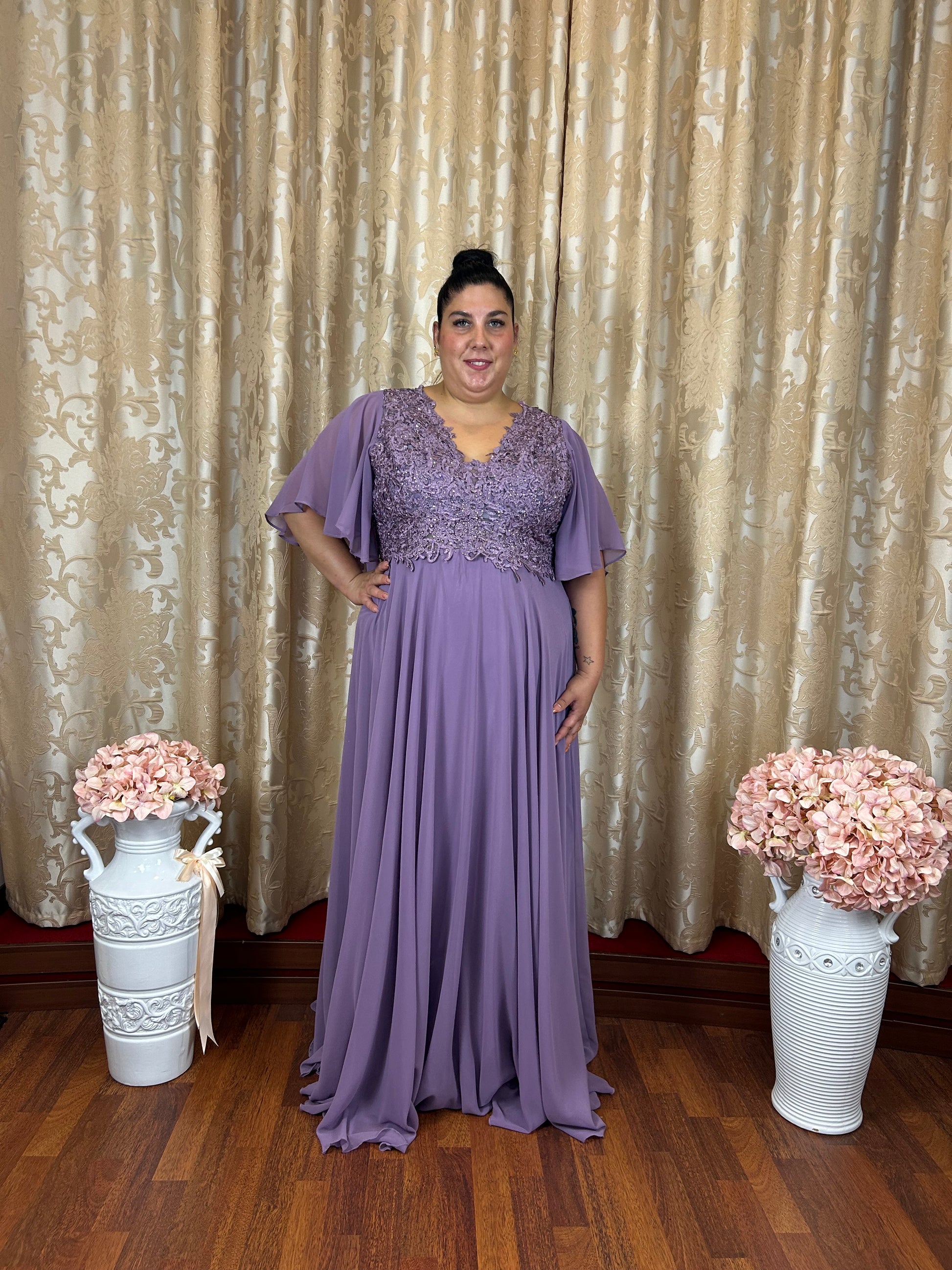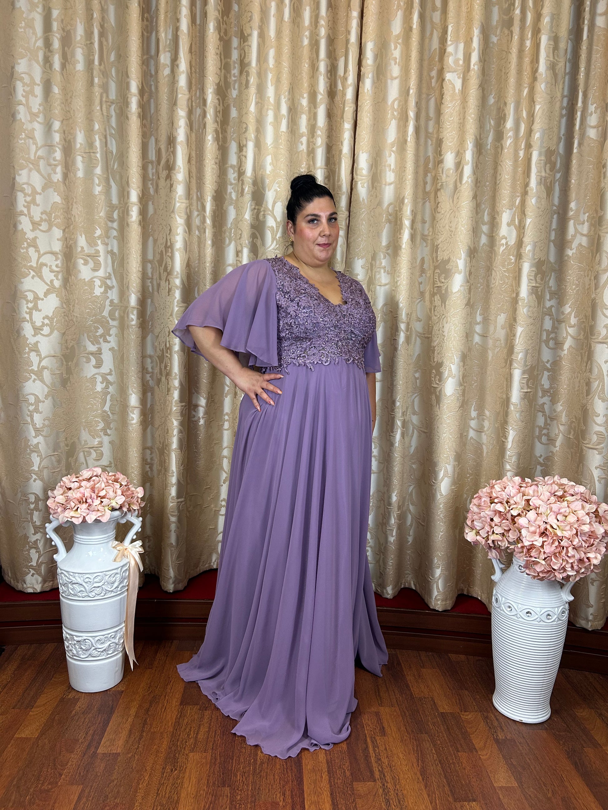 Raffinato ed etereo, questo abito da cerimonia in delicato Lavanda scuro è pensato per esaltare con grazia le silhouette curvy. Il corpetto in tulle impreziosito da ricami in pizzo dona un tocco romantico e sofisticato, mentre le maniche a mantello, leggere e fluttuanti, accarezzano dolcemente le braccia regalando movimento e leggerezza.