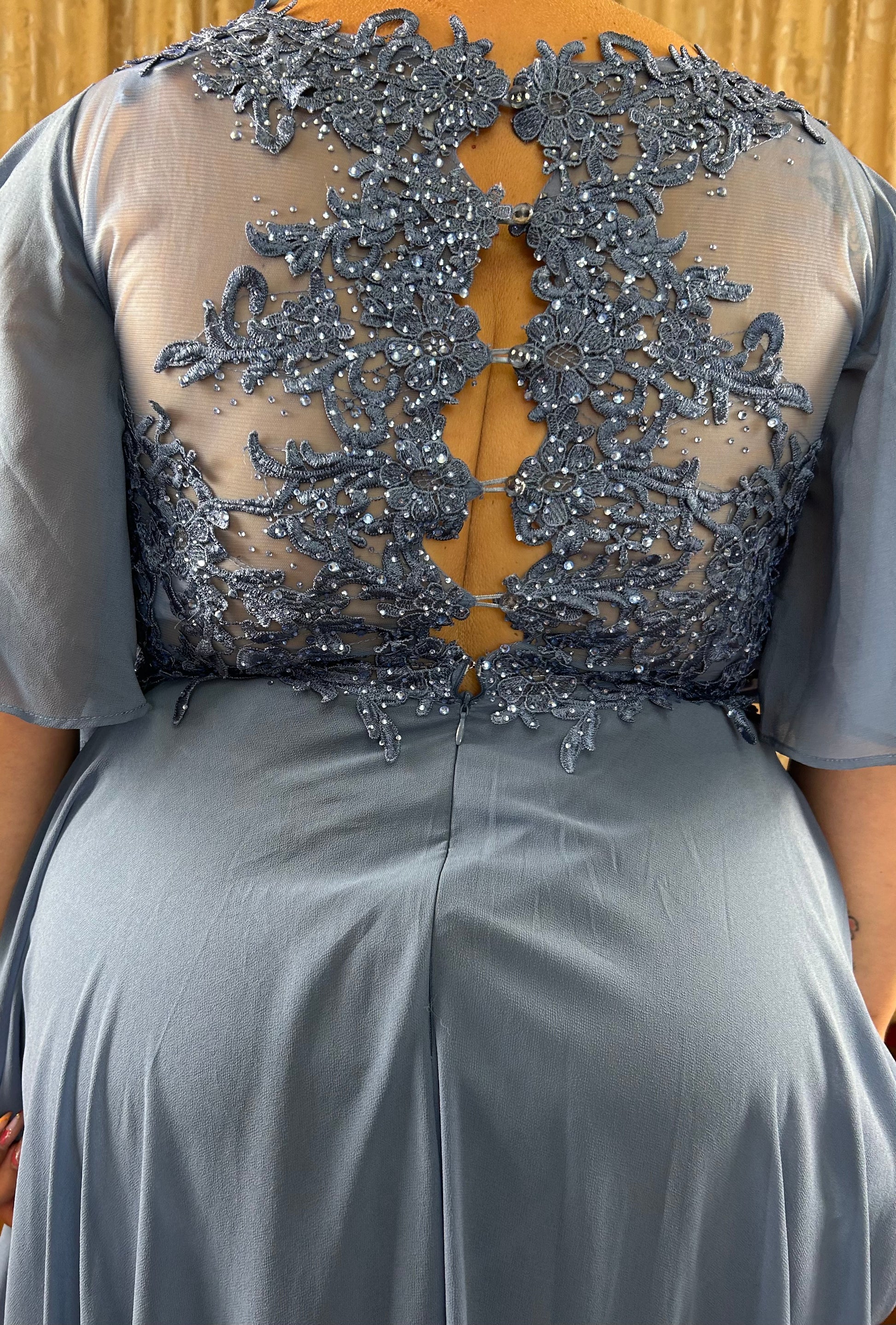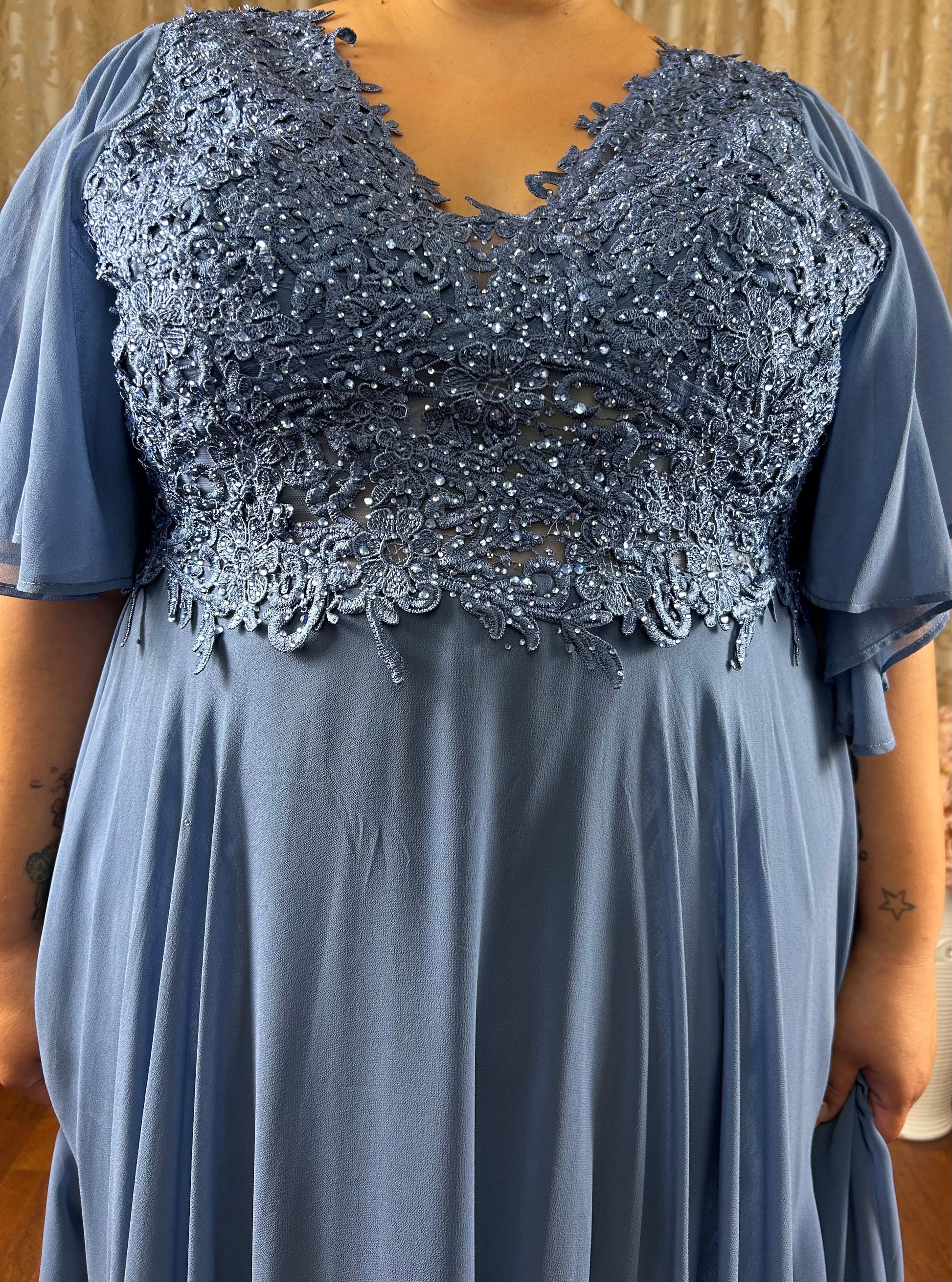 Raffinato ed etereo, questo abito da cerimonia in delicato Avion è pensato per esaltare con grazia le silhouette curvy. Il corpetto in tulle impreziosito da ricami in pizzo dona un tocco romantico e sofisticato, mentre le maniche a mantello, leggere e fluttuanti, accarezzano dolcemente le braccia regalando movimento e leggerezza.