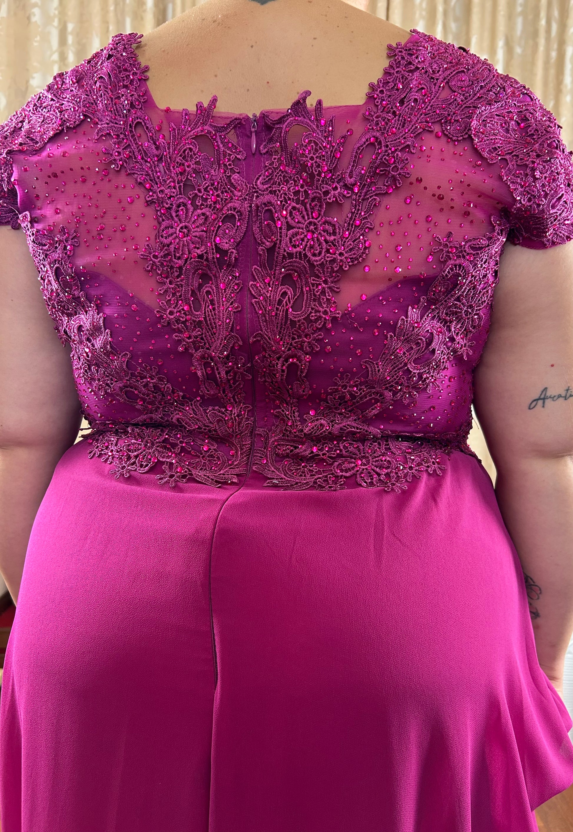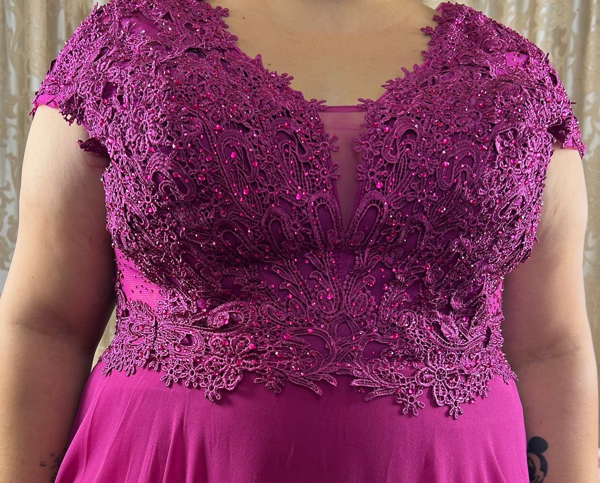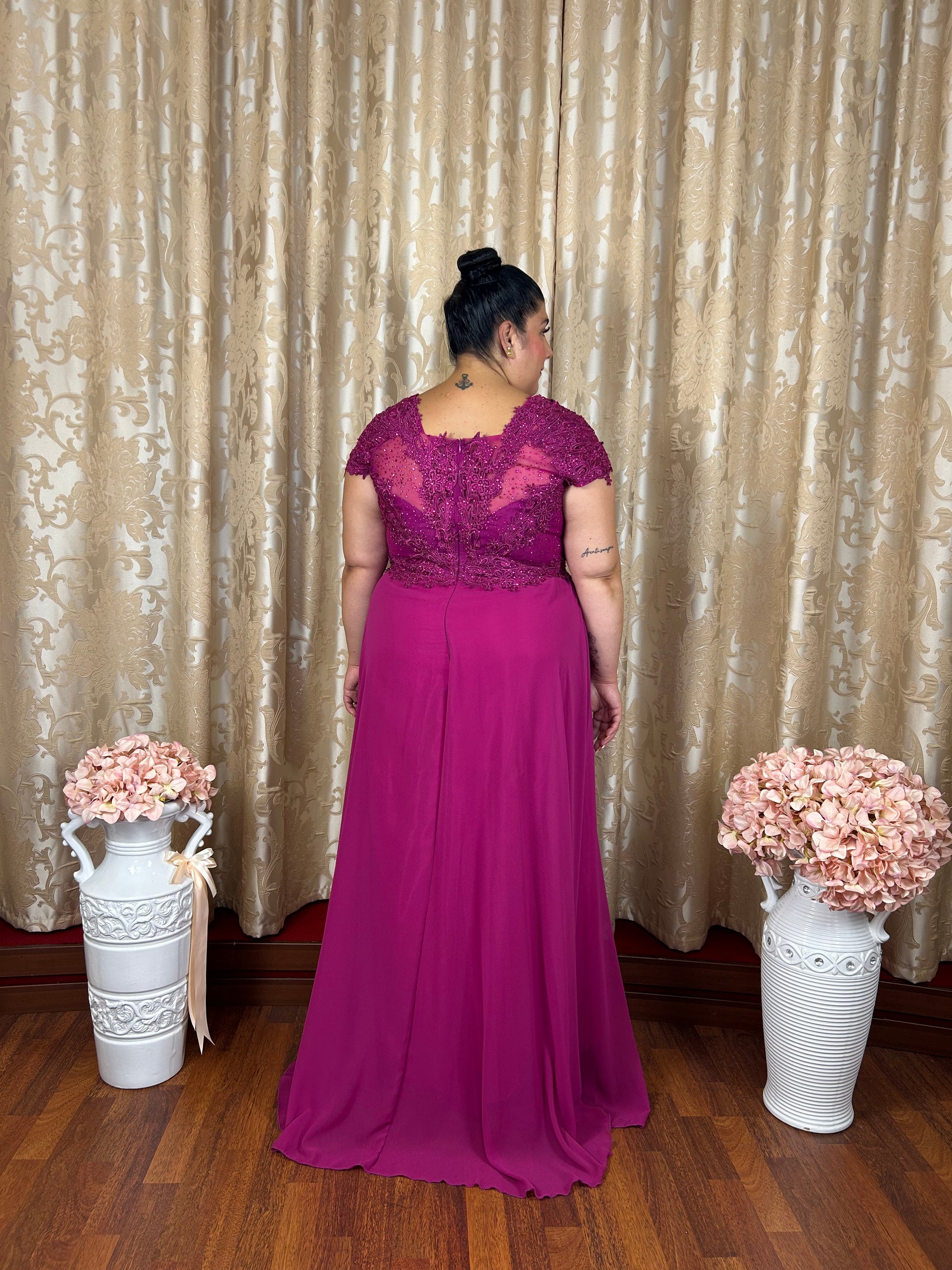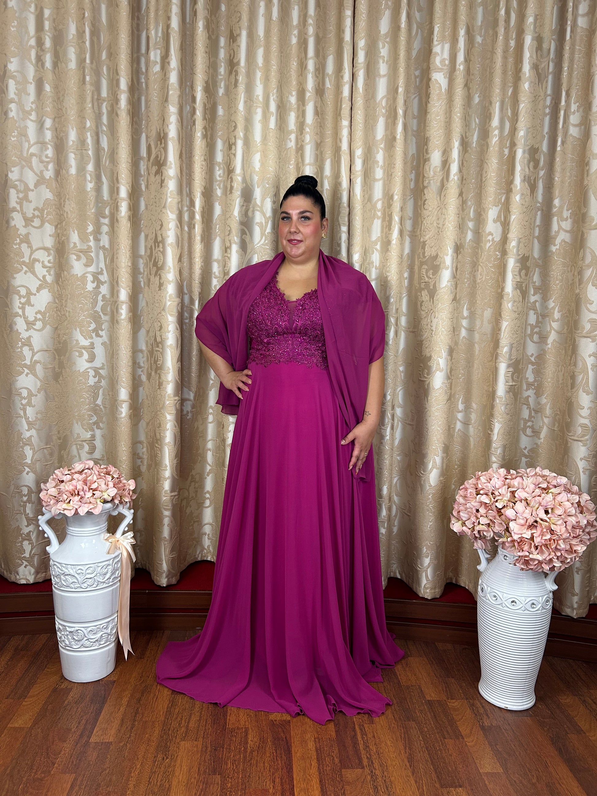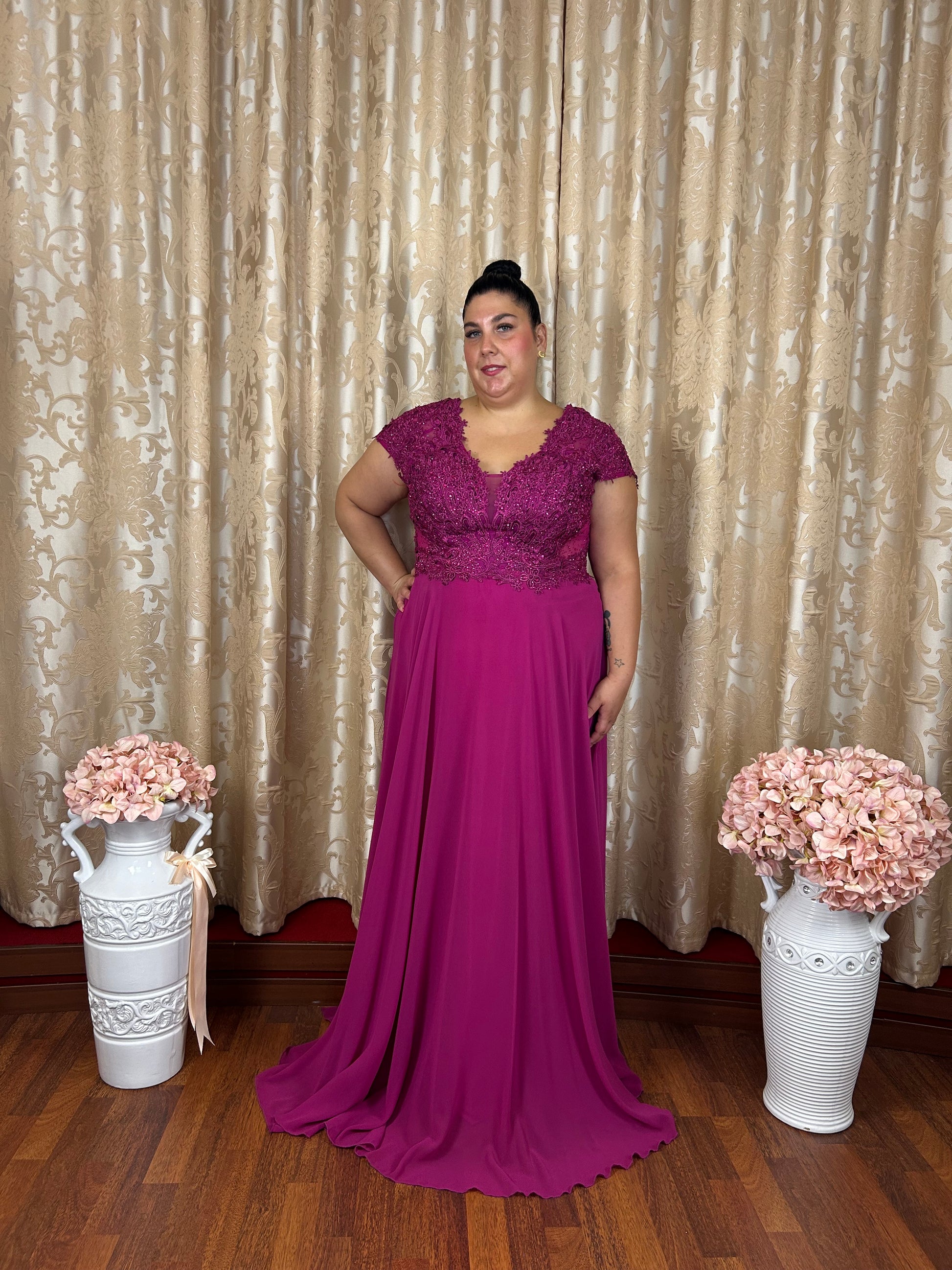 Abito da cerimonia linea curvy, con stola ciclamino elegante e raffinato, caratterizzato da un corpino in tulle e pizzo impreziosito da delicati ricami che valorizzano la silhouette con giochi di trasparenze e dettagli femminili. La gonna in georgette a taglio trapezio cade morbida e fluida, creando un movimento leggero e armonioso, ideale per slanciare la figura e garantire comfort per tutta la giornata. Perfetto per cerimonie e occasioni speciali, unisce romanticismo e stile senza rinunciare alla vestibilità.