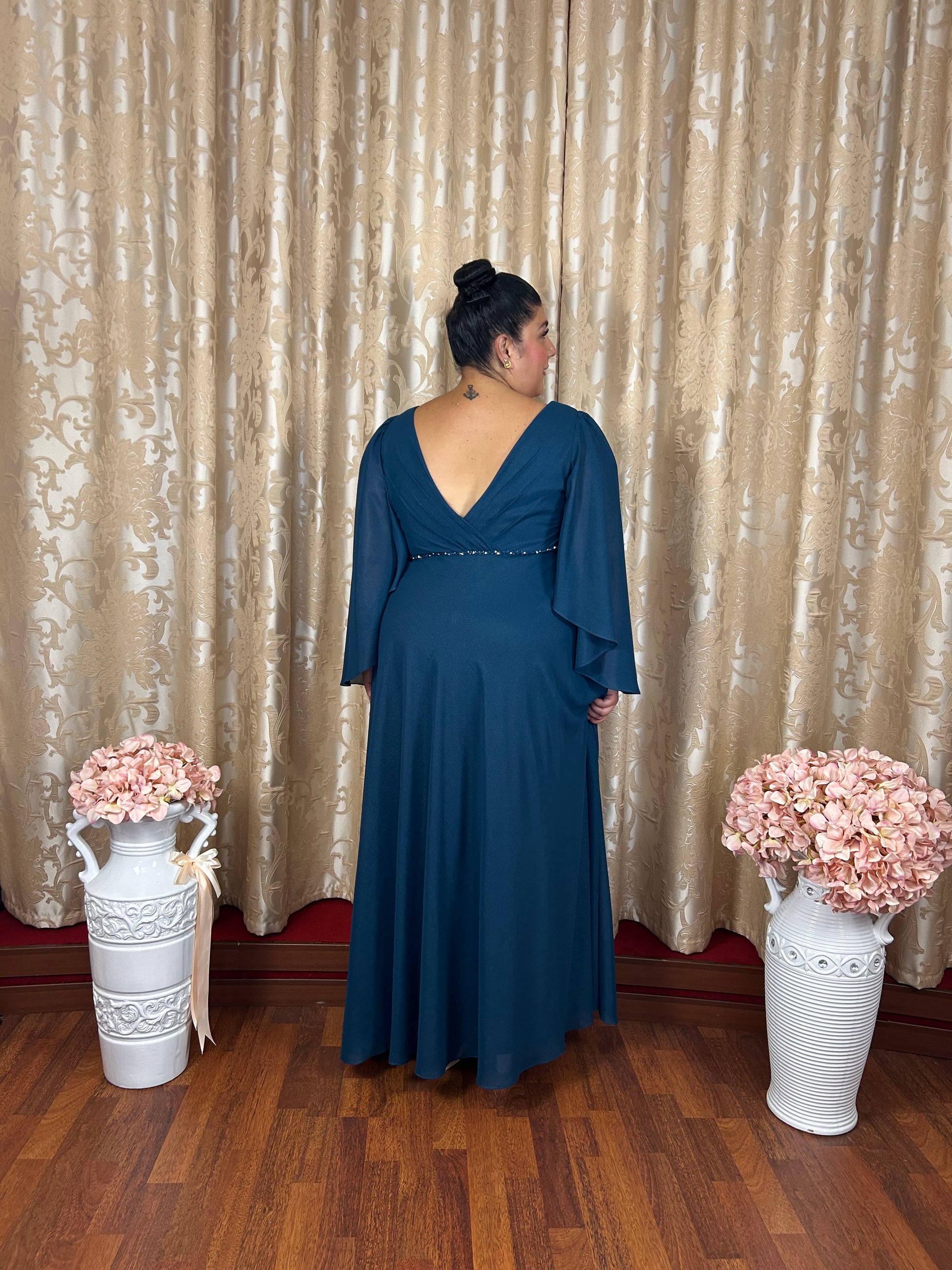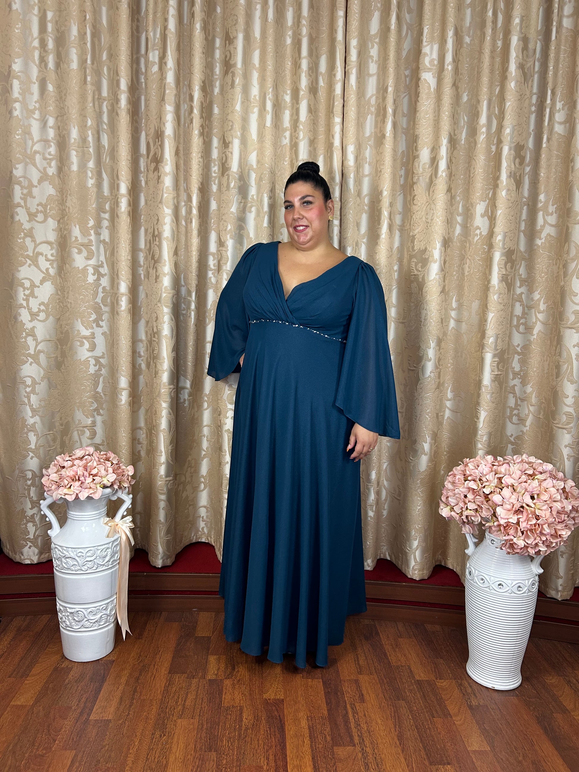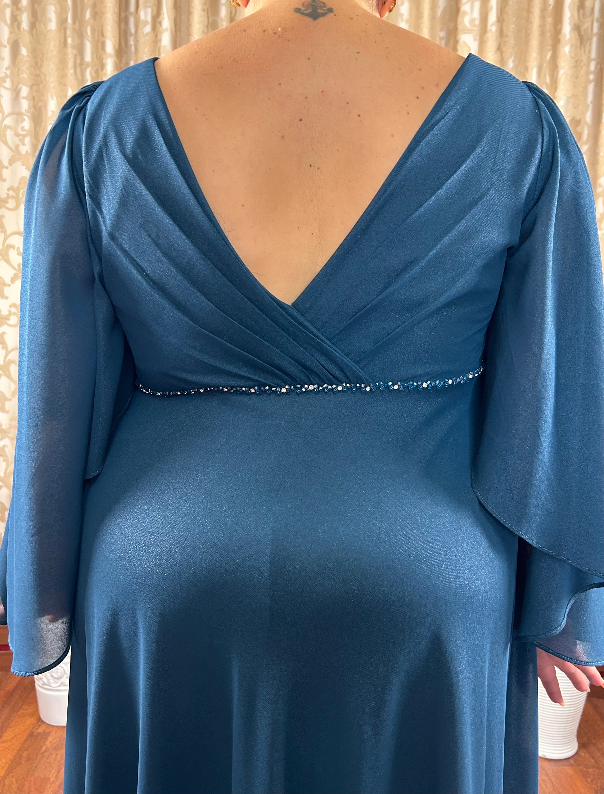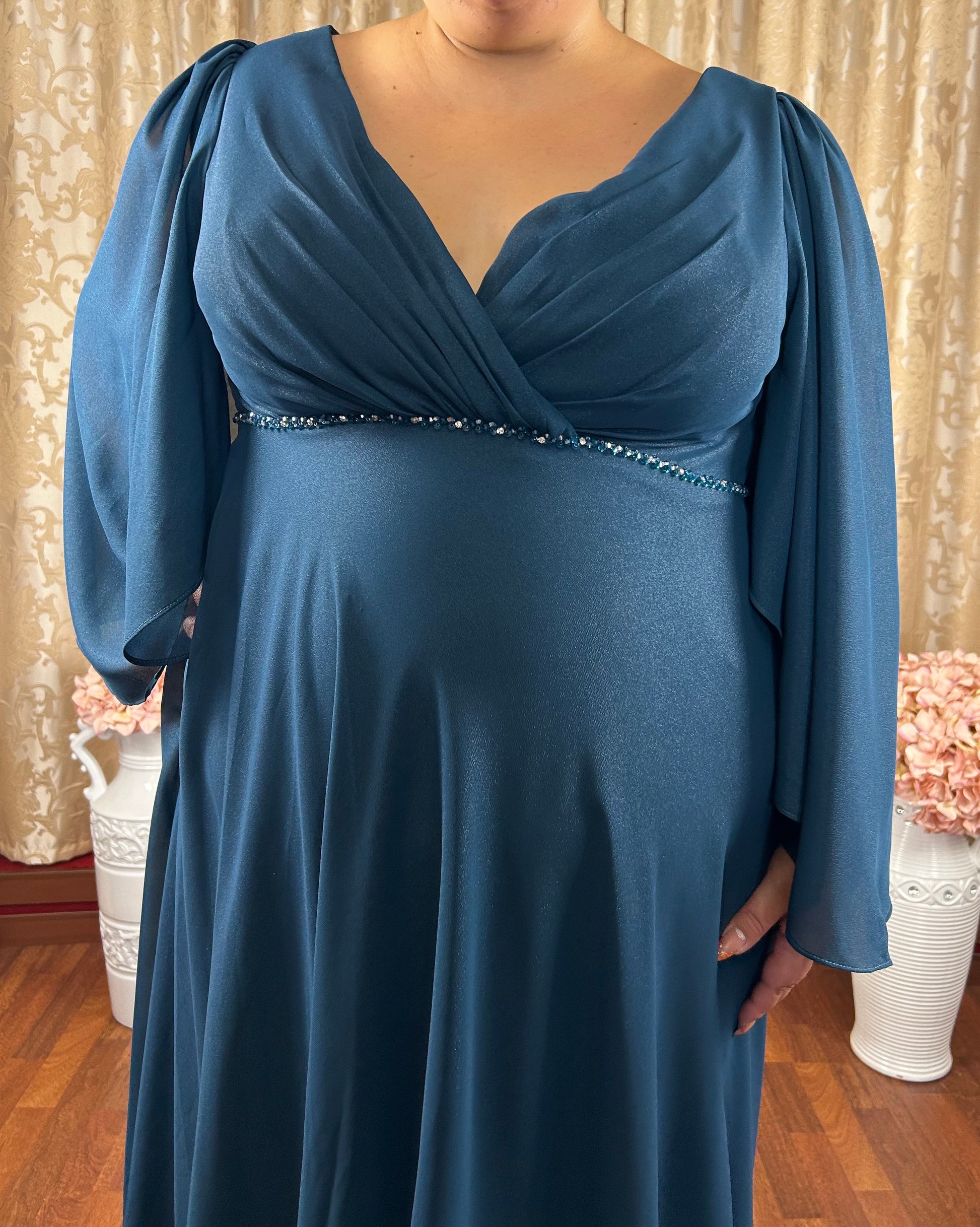 Abito da cerimonia linea curvy verde in brillante georgette verde, pensato per esaltare la silhouette con grazia e leggerezza. Il **corpino plissettato con scollo a v si apre delicatamente sotto il seno, mettendo in risalto il décolleté con discrezione e raffinatezza.