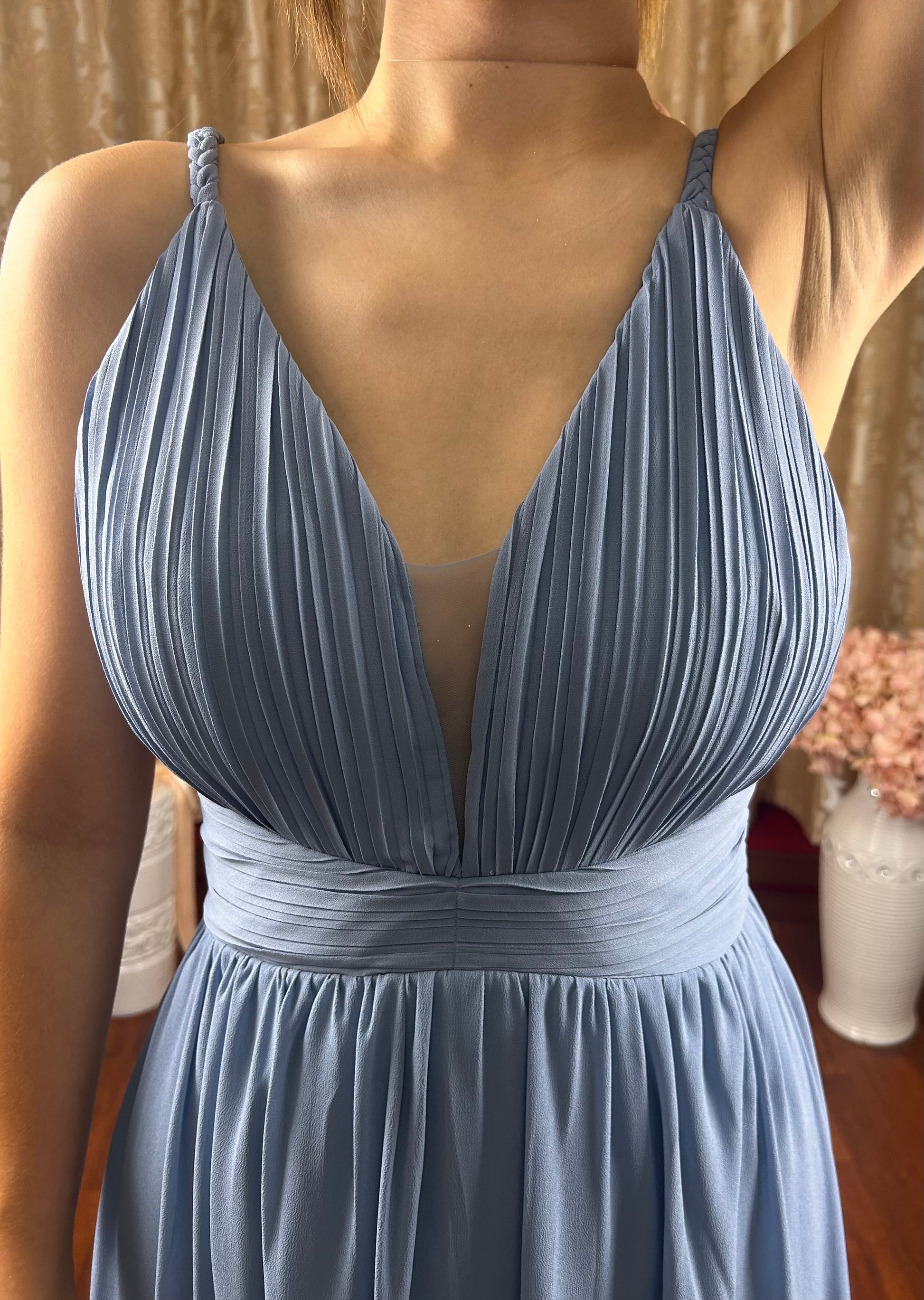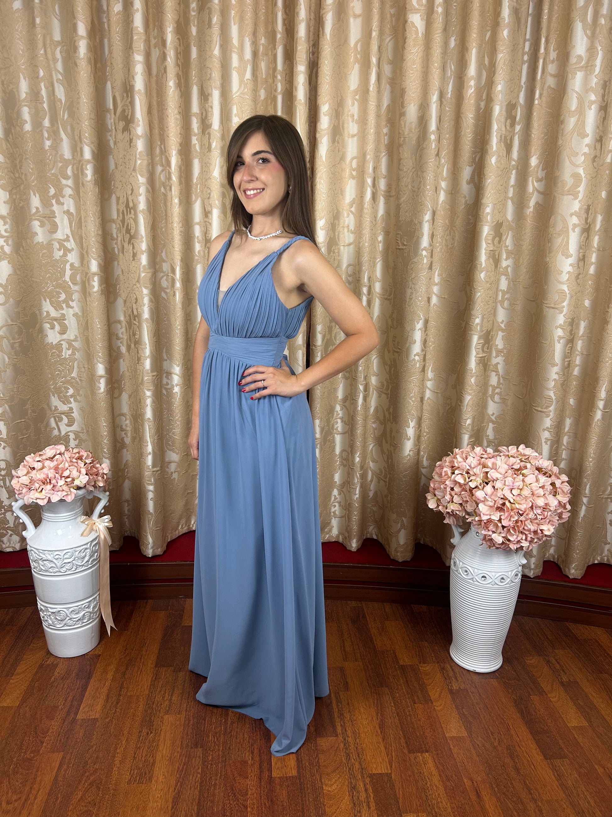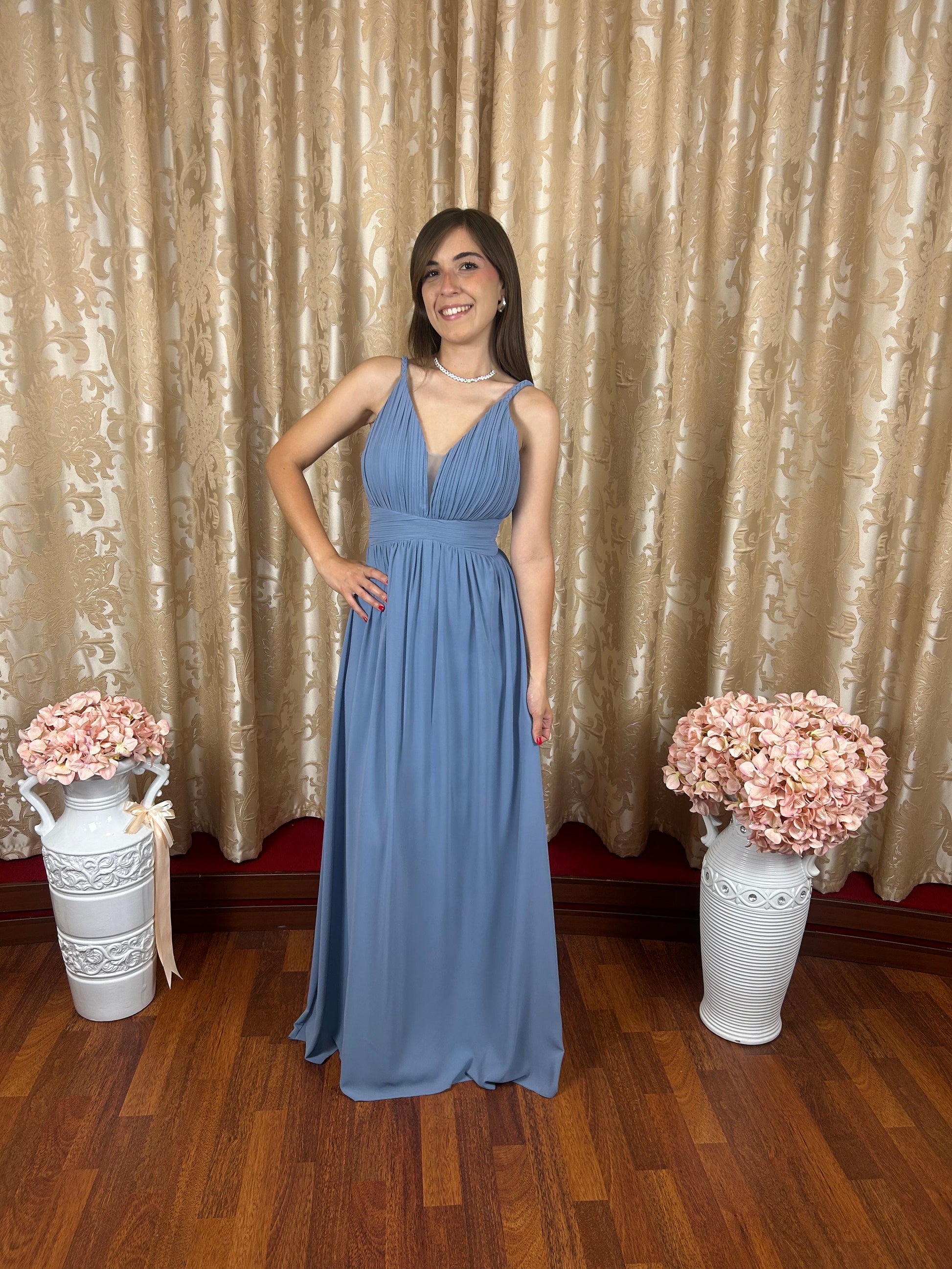 Un’eleganza senza tempo si svela in questo raffinato abito da cerimonia morbido georgette color avion, pensato per valorizzare con delicatezza ogni silhouette. Il corpino con scollo a V è finemente **plissettato**, creando un gioco di pieghe che slancia la figura, mentre lo stile impero sottolinea con grazia il punto vita grazie a un delicato arriccio centrale.