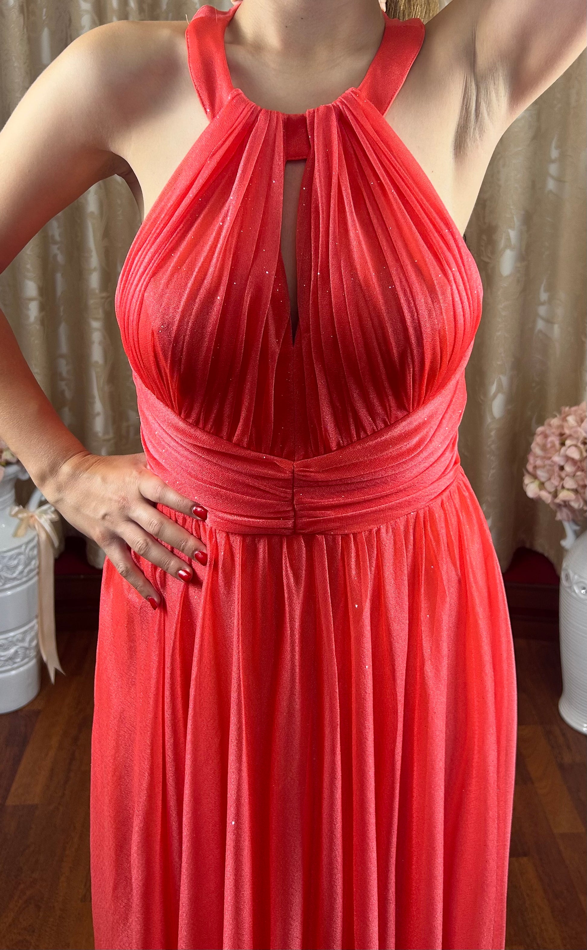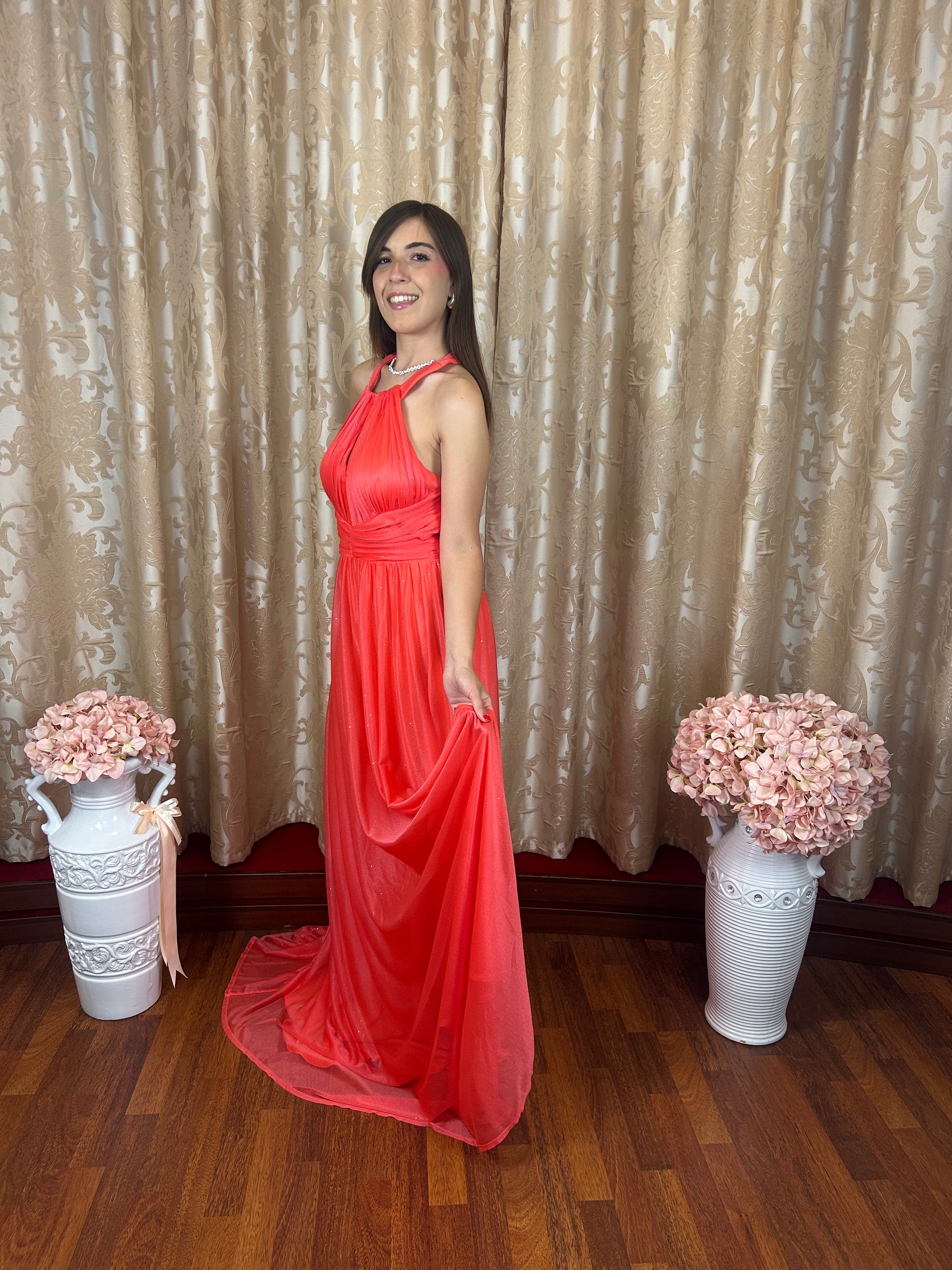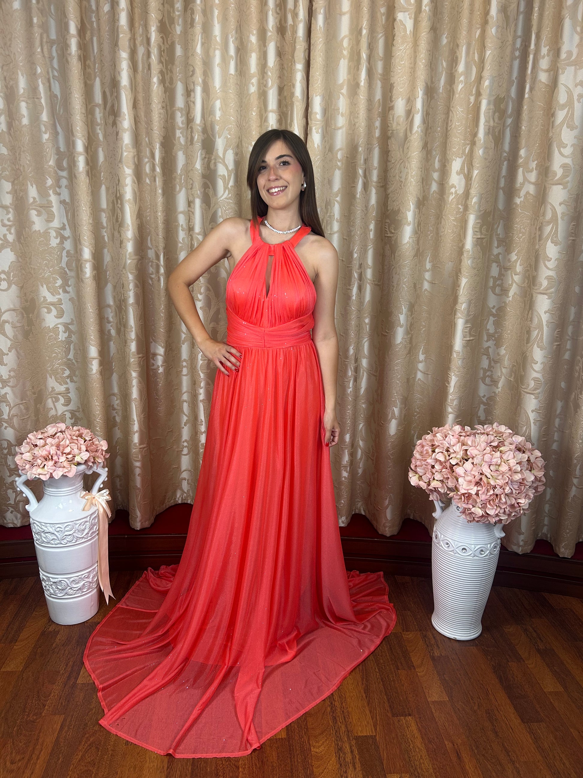 Abito da cerimonia color corallo con glitter argento