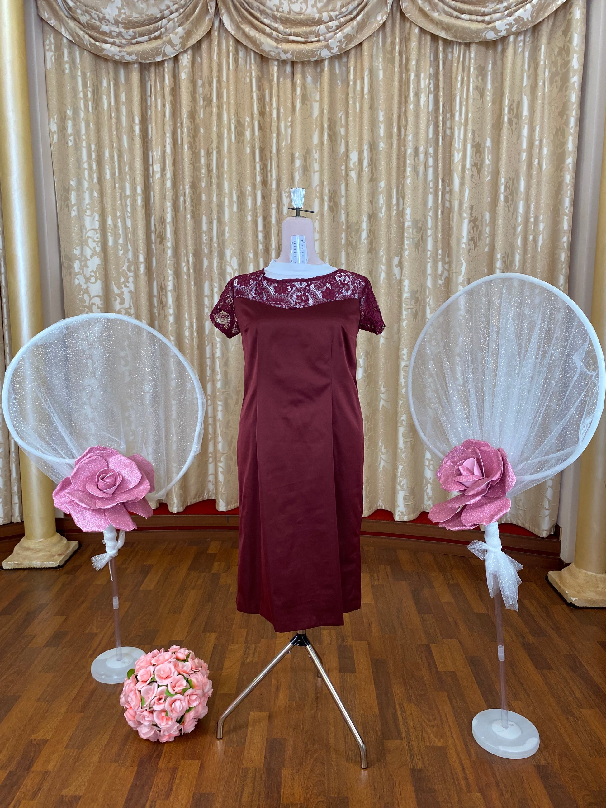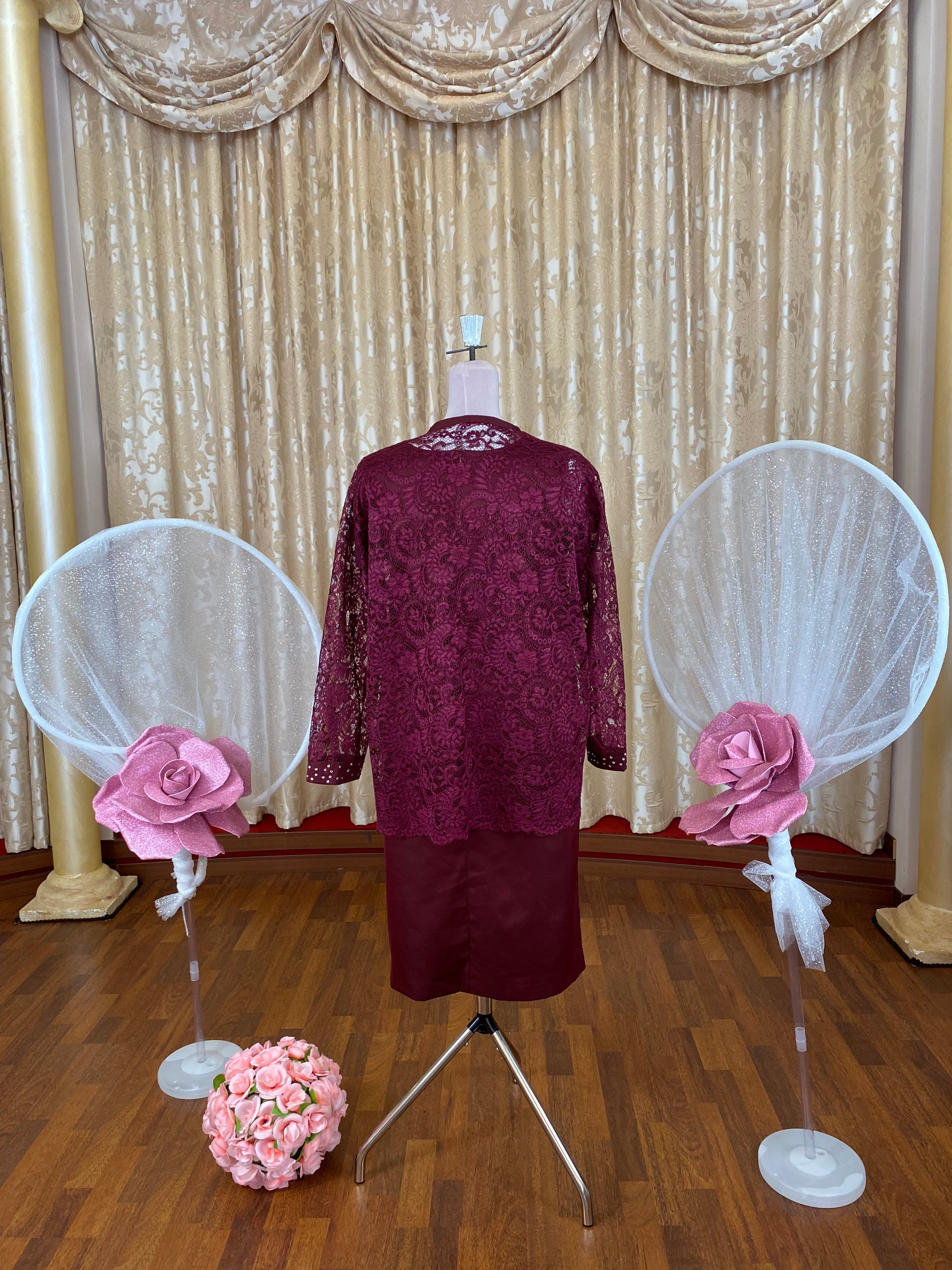 Abito tubino corto Sartoriale pezzo unico in **cady elasticizzato** color **bordeaux**, con pizzo sul corpino e maniche dal taglio morbido ma al tempo stesso avvolgente, pensato per valorizzare con stile ogni silhouette. La linea sobria e raffinata si accompagna a uno **spolverino in pizzo** leggero, impreziosito da delicate **applicazioni di cristalli** che regalano preziosi punti luce ad ogni movimento.