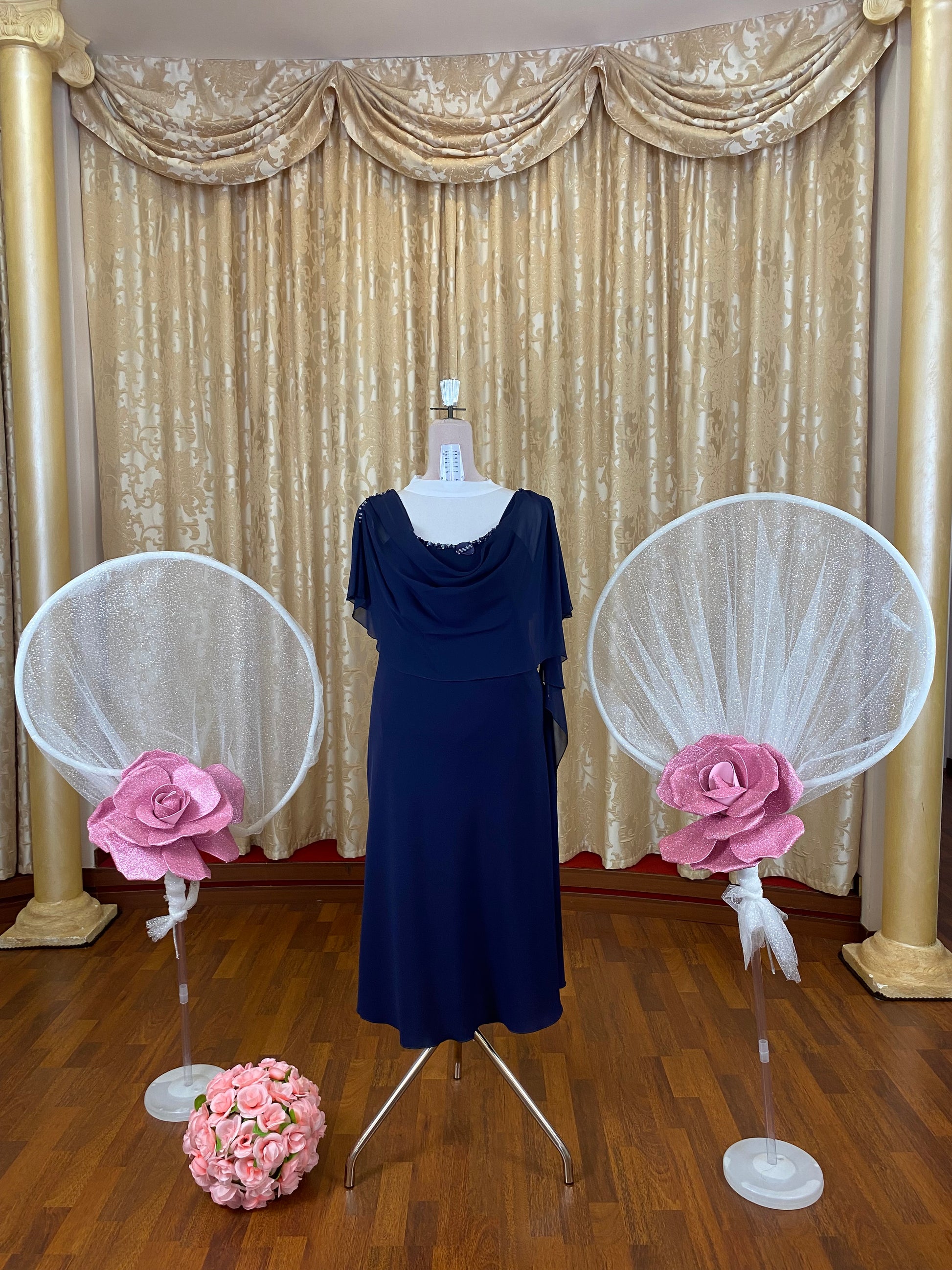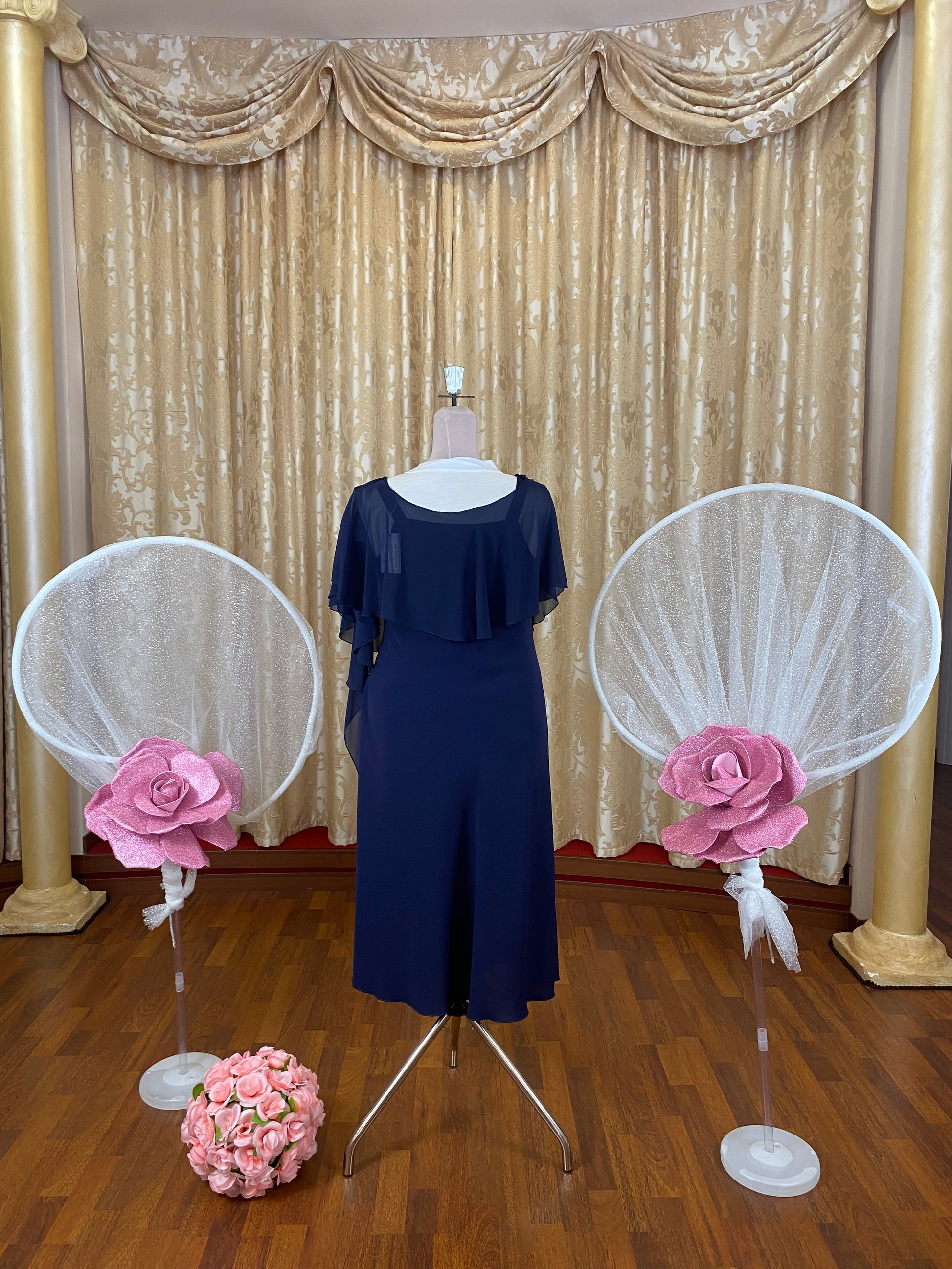 La linea dell’abito è **sfasata e fluida**, con movimento armonioso che valorizza la figura con naturalezza. Perfetto per occasioni speciali, mantiene uno stile sofisticato ma moderno