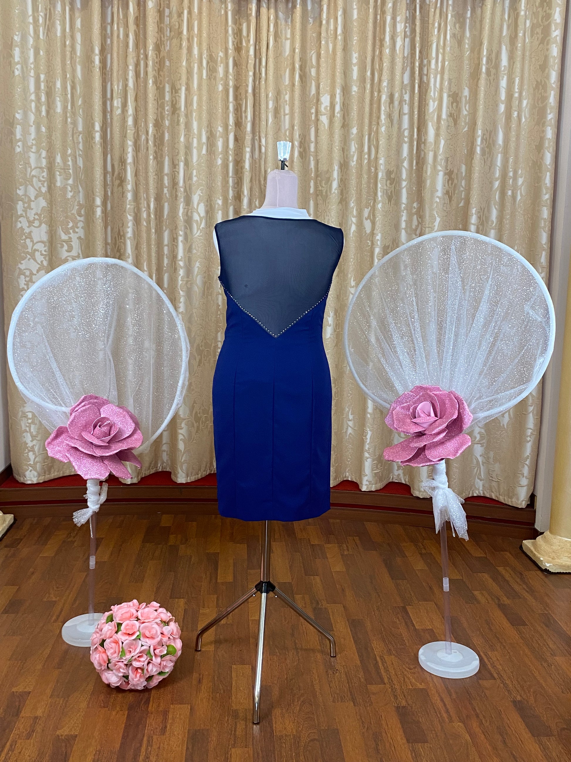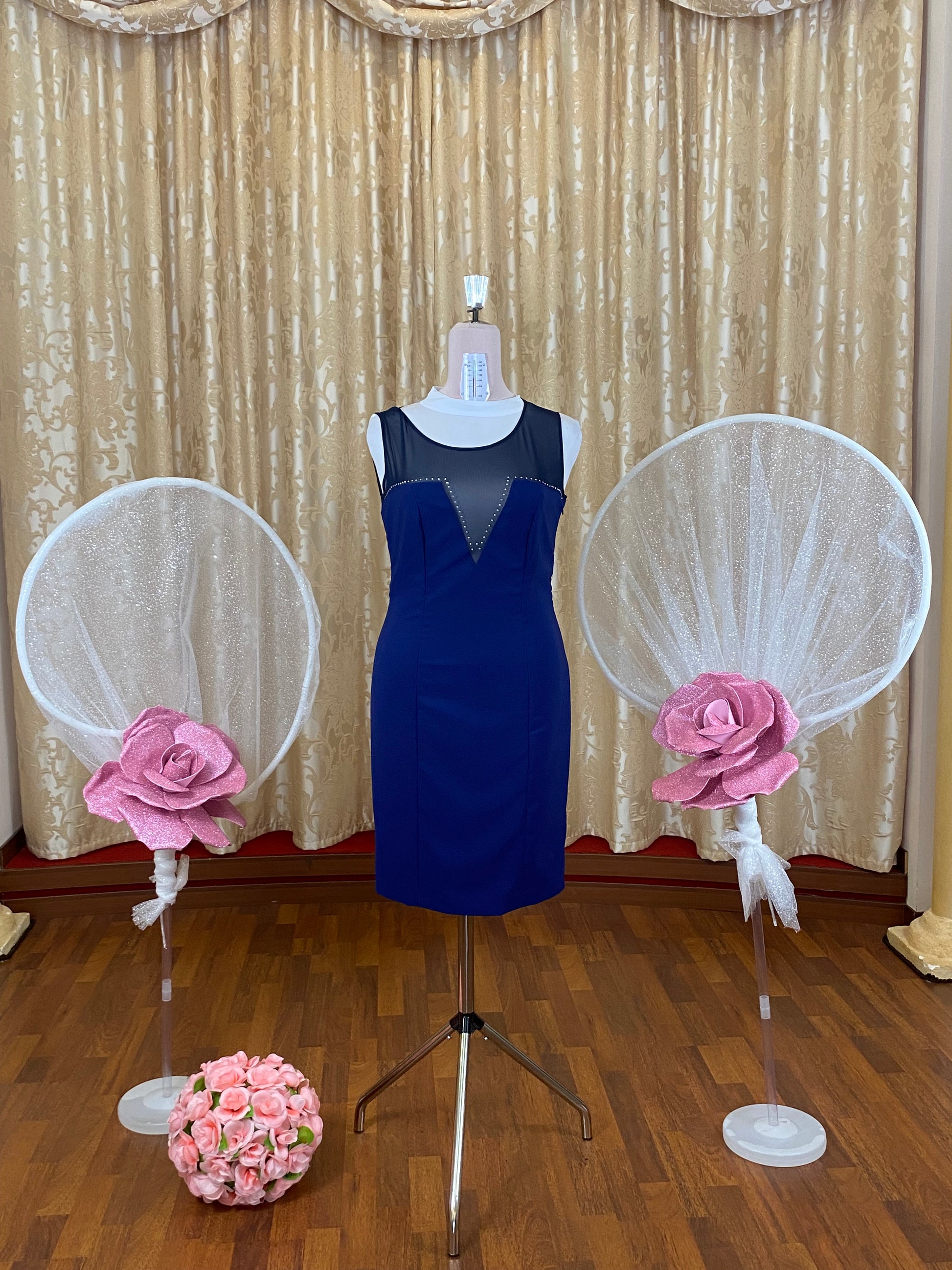 Abito da cerimonia corto in **blu chiaro**, realizzato con maestria sartoriale in **tessuto Cady elasticizzato**, che avvolge la silhouette con raffinatezza e comfort.