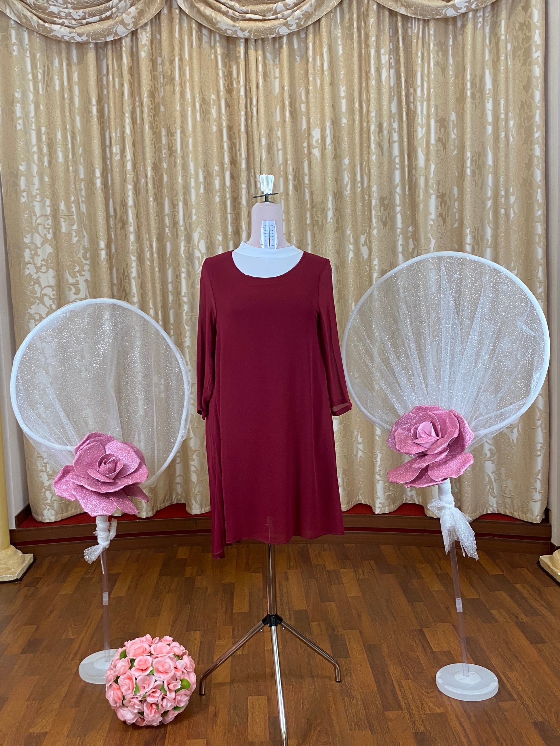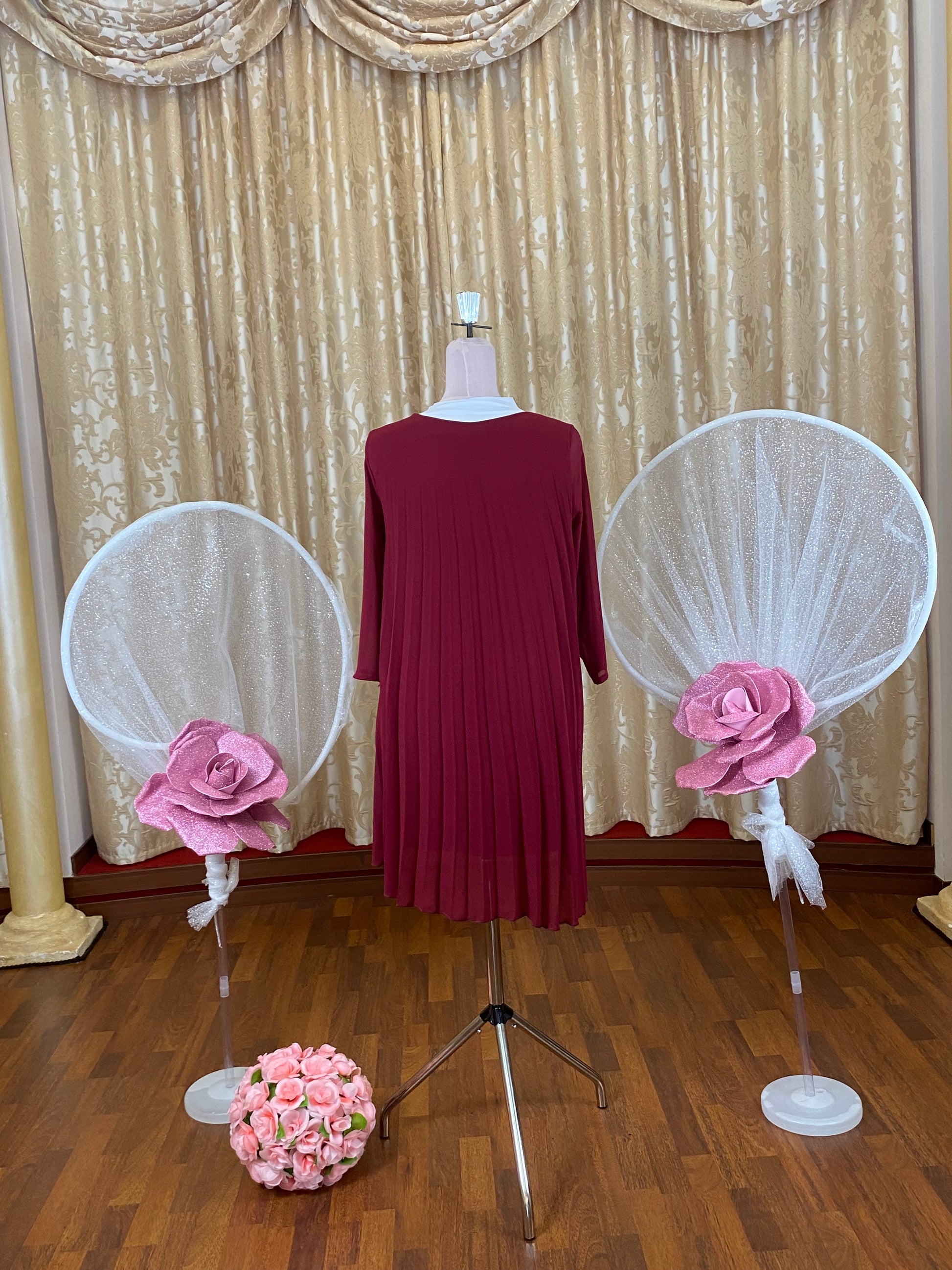 Abito da cerimonia Linea Curvy in **georgette bordeaux**, raffinato e fluido. Il design presenta uno **scollo rotondo** che valorizza con semplicità la scollatura, mentre le **maniche svasate** donano leggerezza e movimento. La **gonna a trapezio** cade morbida, slanciando la figura con armonia. Sul retro, la lavorazione **plissettata** aggiunge un dettaglio ricercato, che rende l’abito unico e sofisticato.
