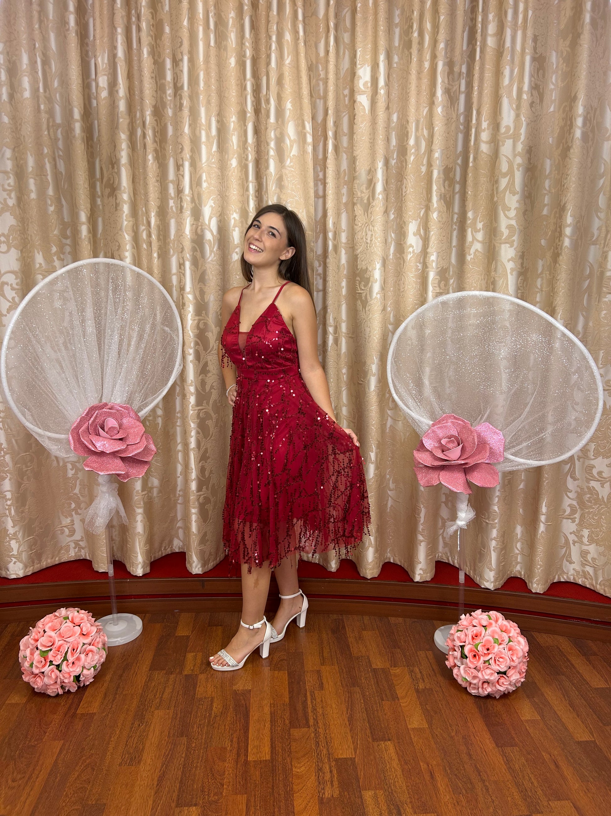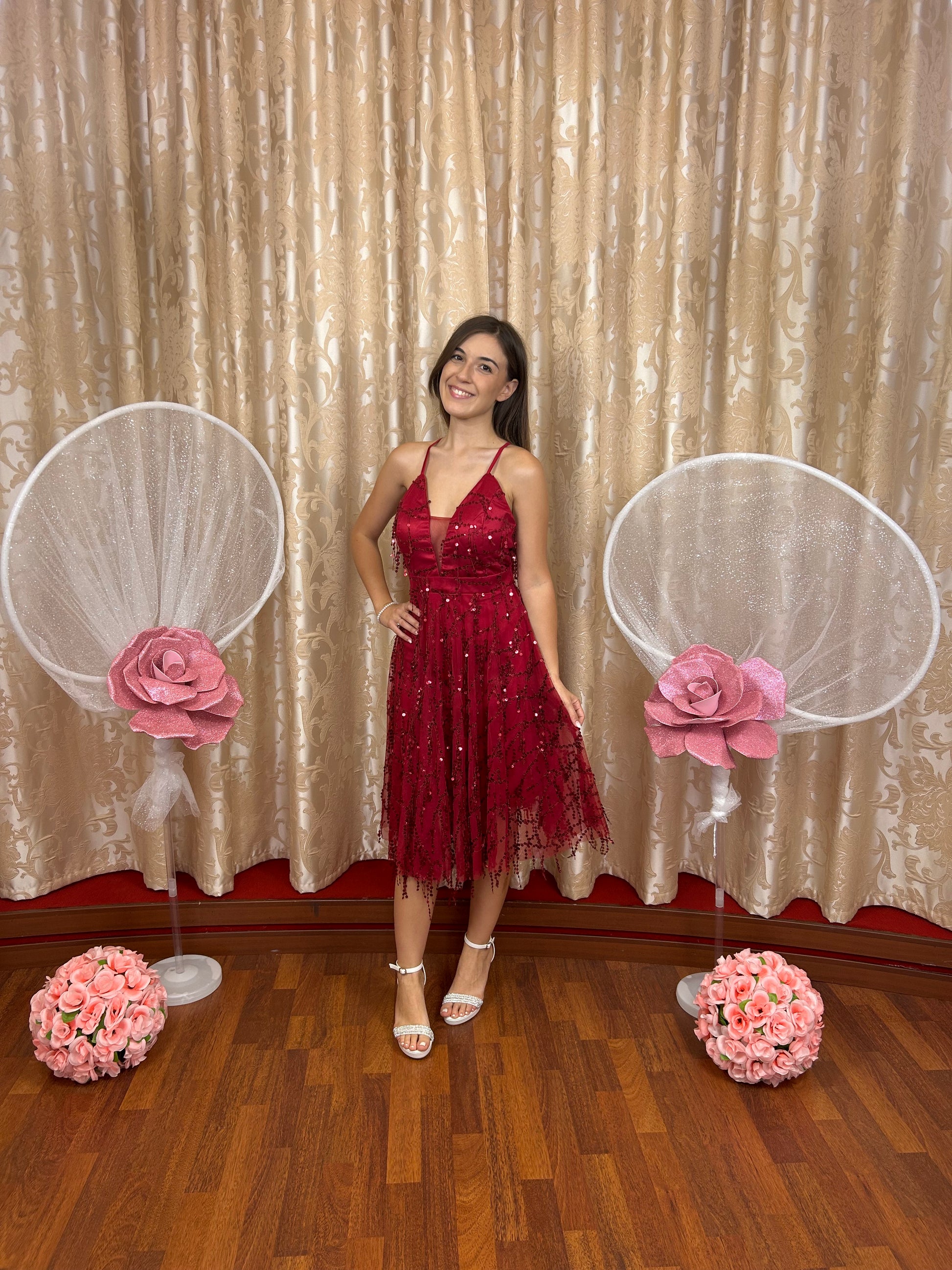 Il **corpino con scollo a V** sul davanti dona slancio e femminilità, mentre la **scollatura sulla schiena** aggiunge un dettaglio sensuale e sofisticato. La **gonna svasata con applicazioni di paillettes** crea un movimento armonioso ad ogni passo, esaltando la silhouette con grazia.
