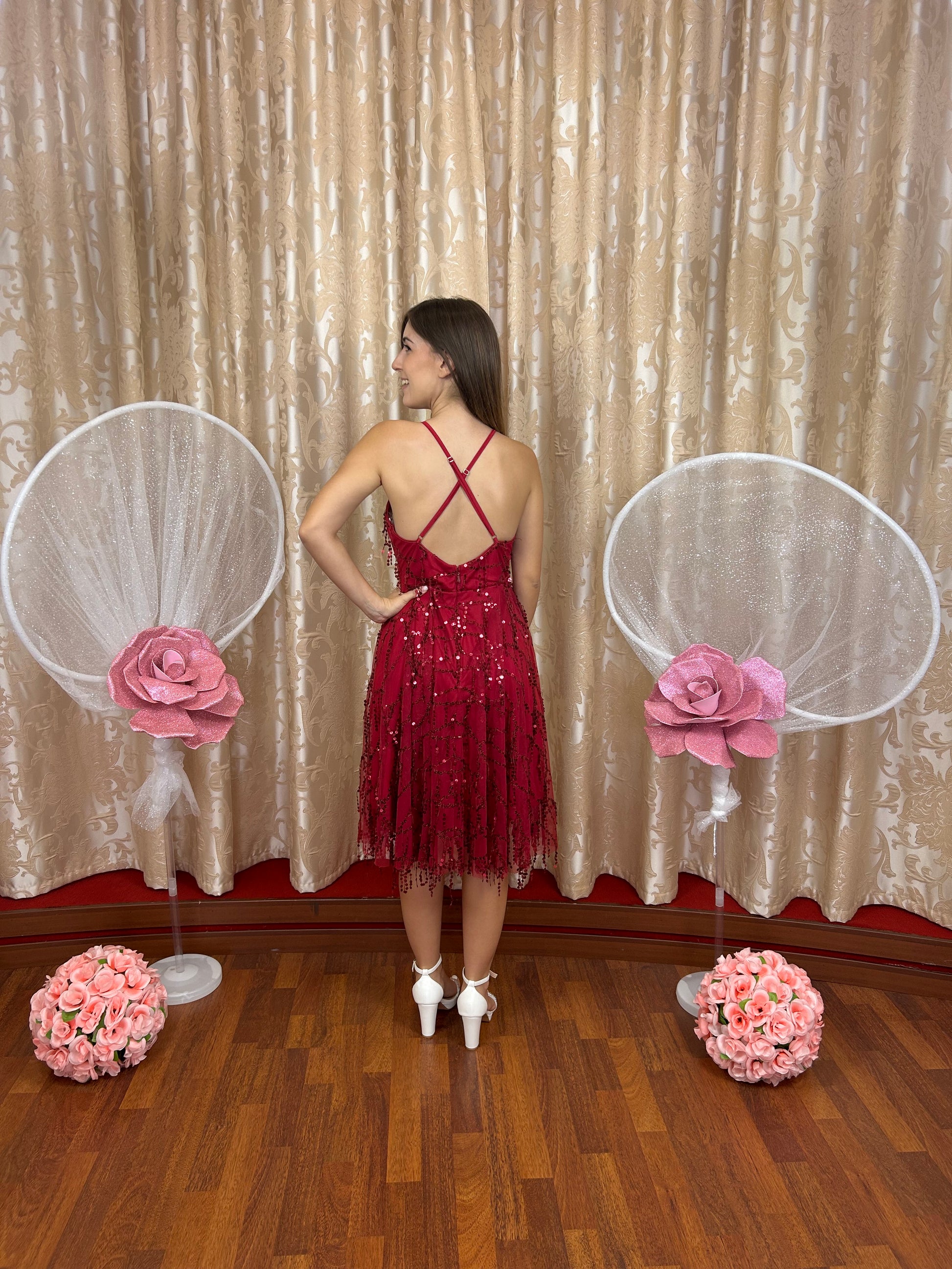 ✨ Abito elegante e senza tempo, pensato per valorizzare con raffinatezza ogni occasione speciale. Realizzato in **Tulle bordeaux**, fluido e leggero, si arricchisce di un prezioso ricamo di **perline tono su tono** che richiama lo stile intramontabile del **charleston**.