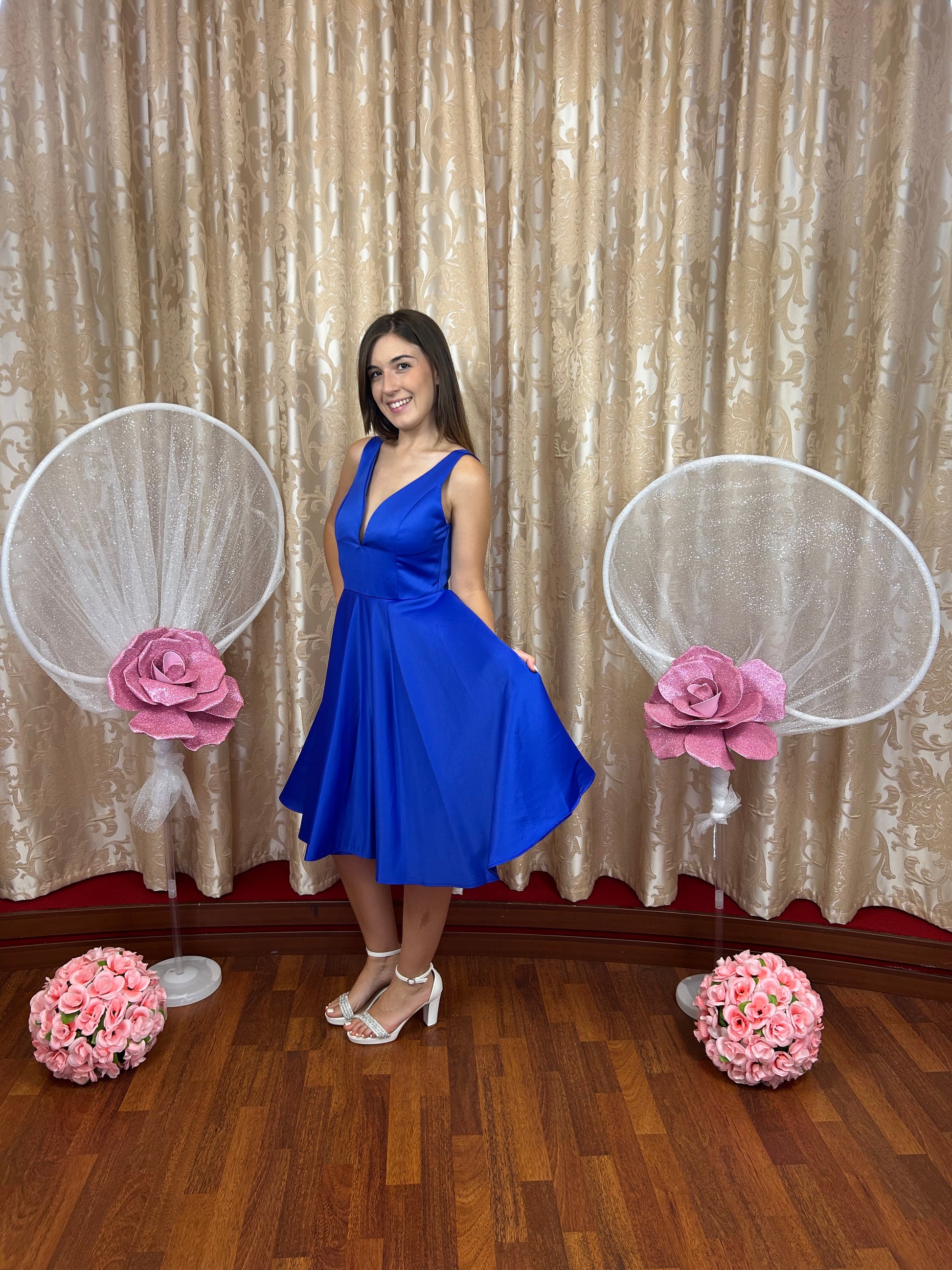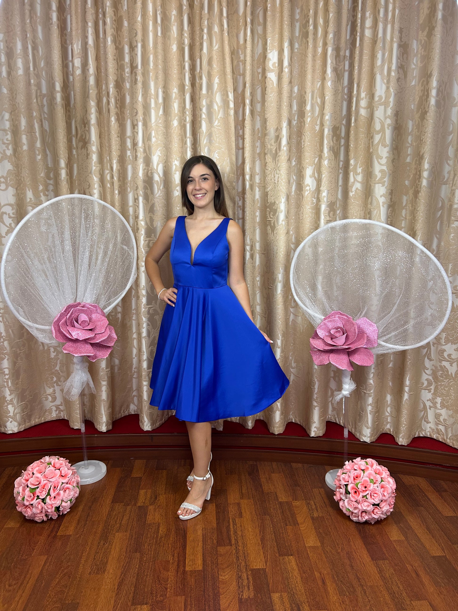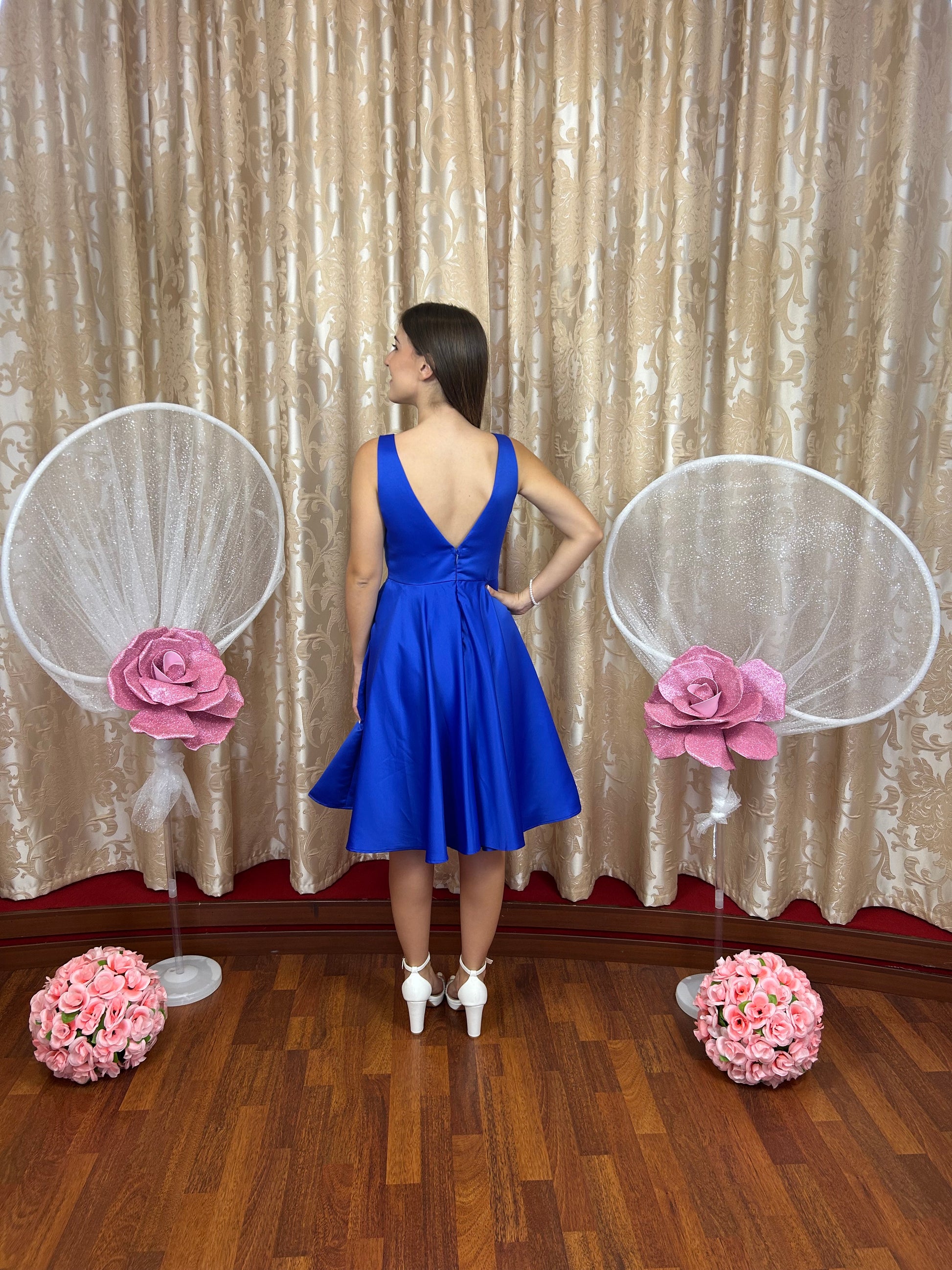 Abito corto in raso, pensato per accompagnarti con stile in ogni occasione speciale. Realizzato in duchesse di raso bluette, si distingue per la sua lucentezza e per la struttura elegante del tessuto.
