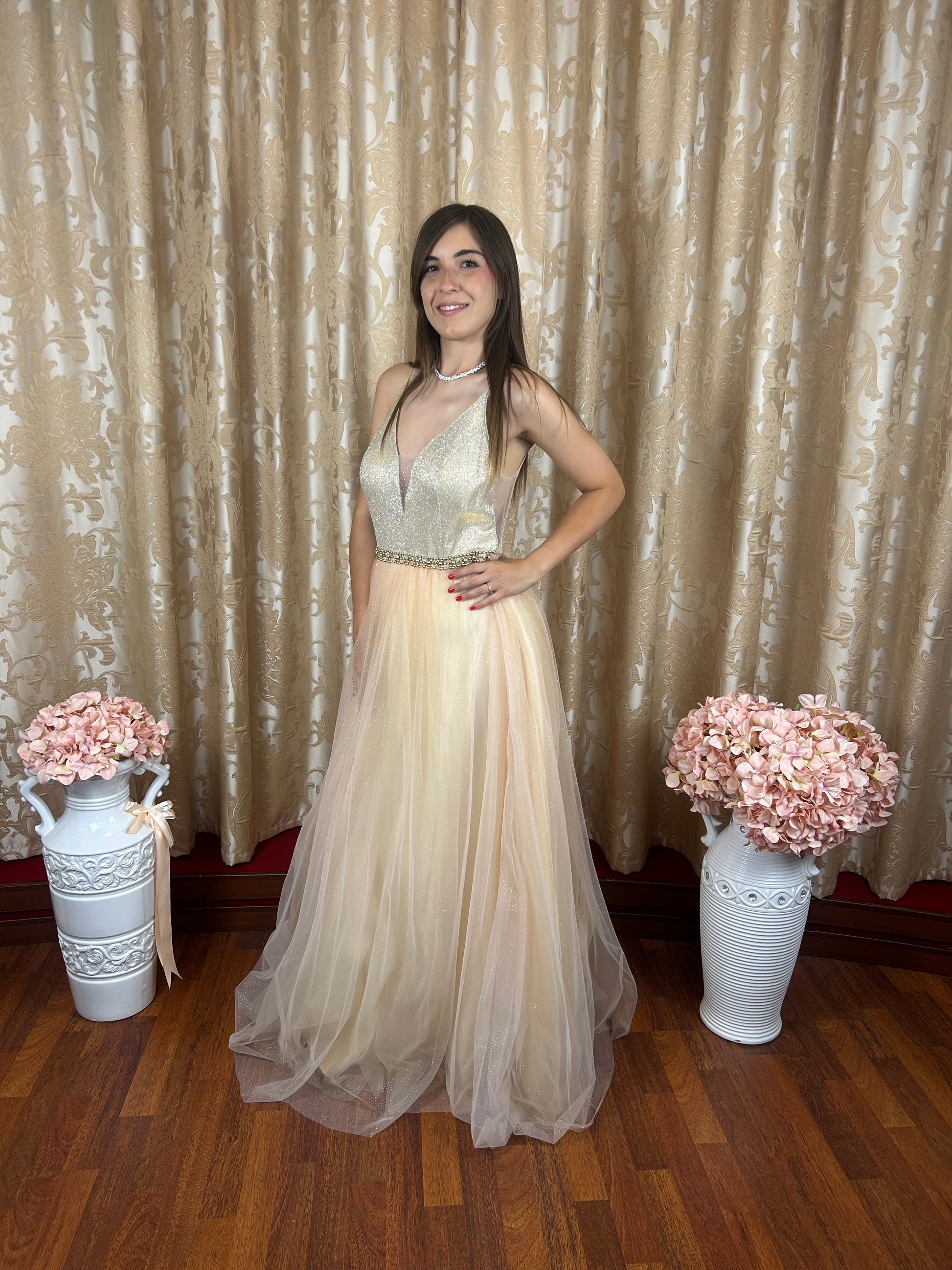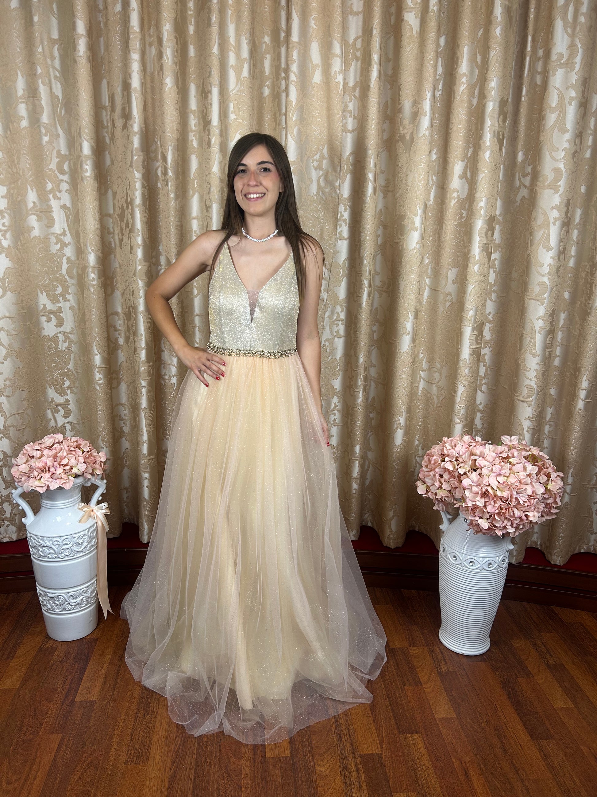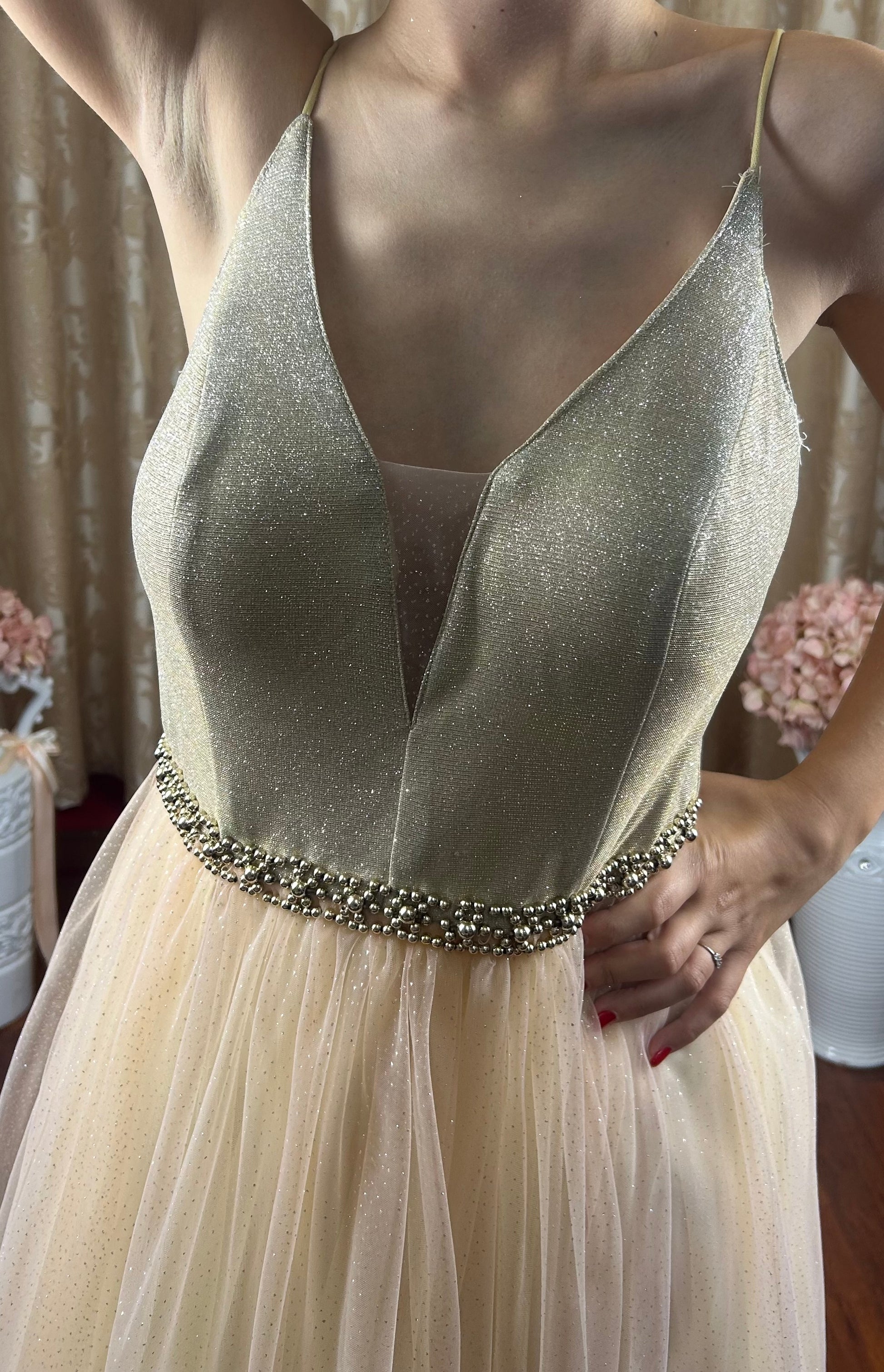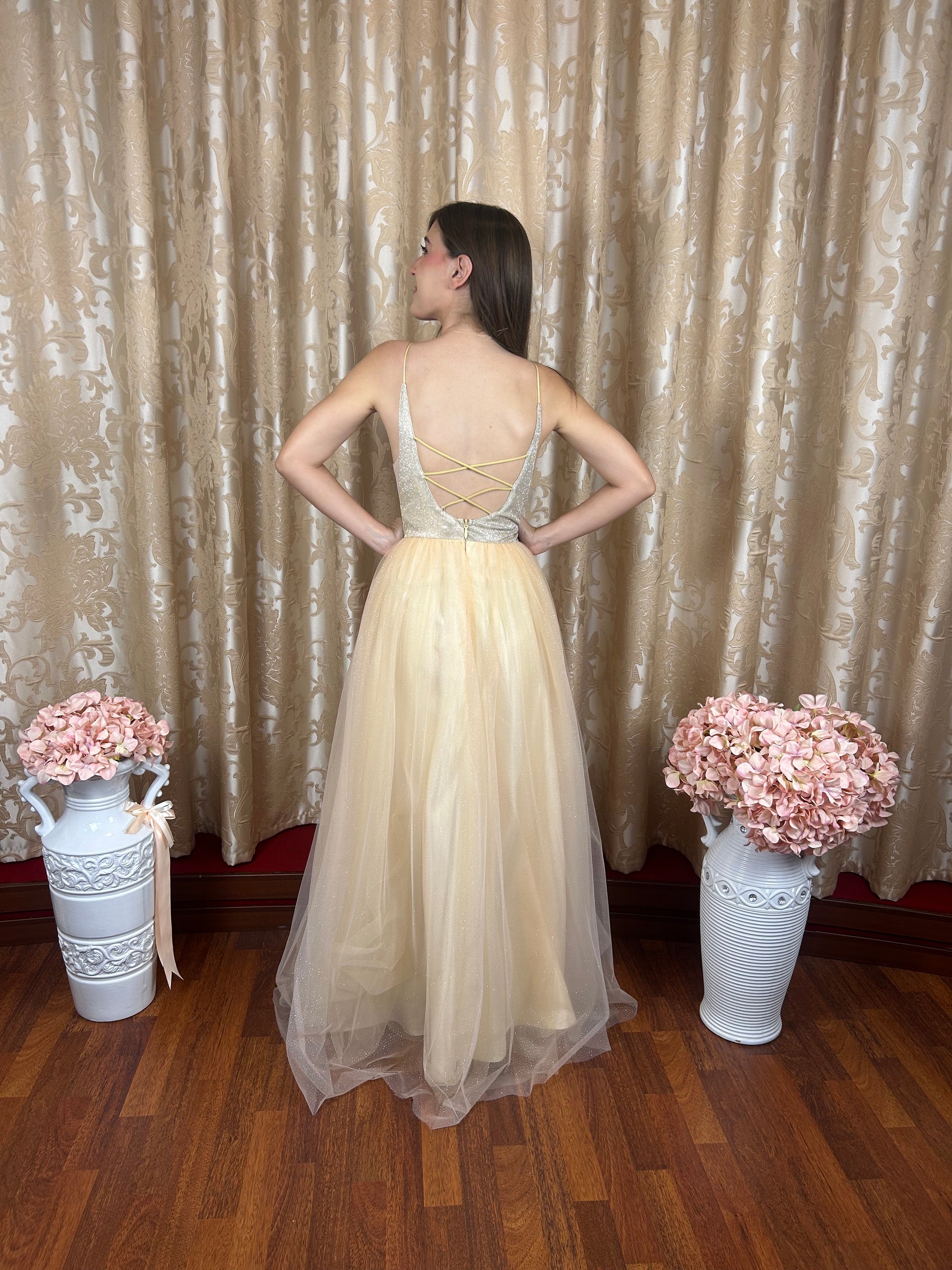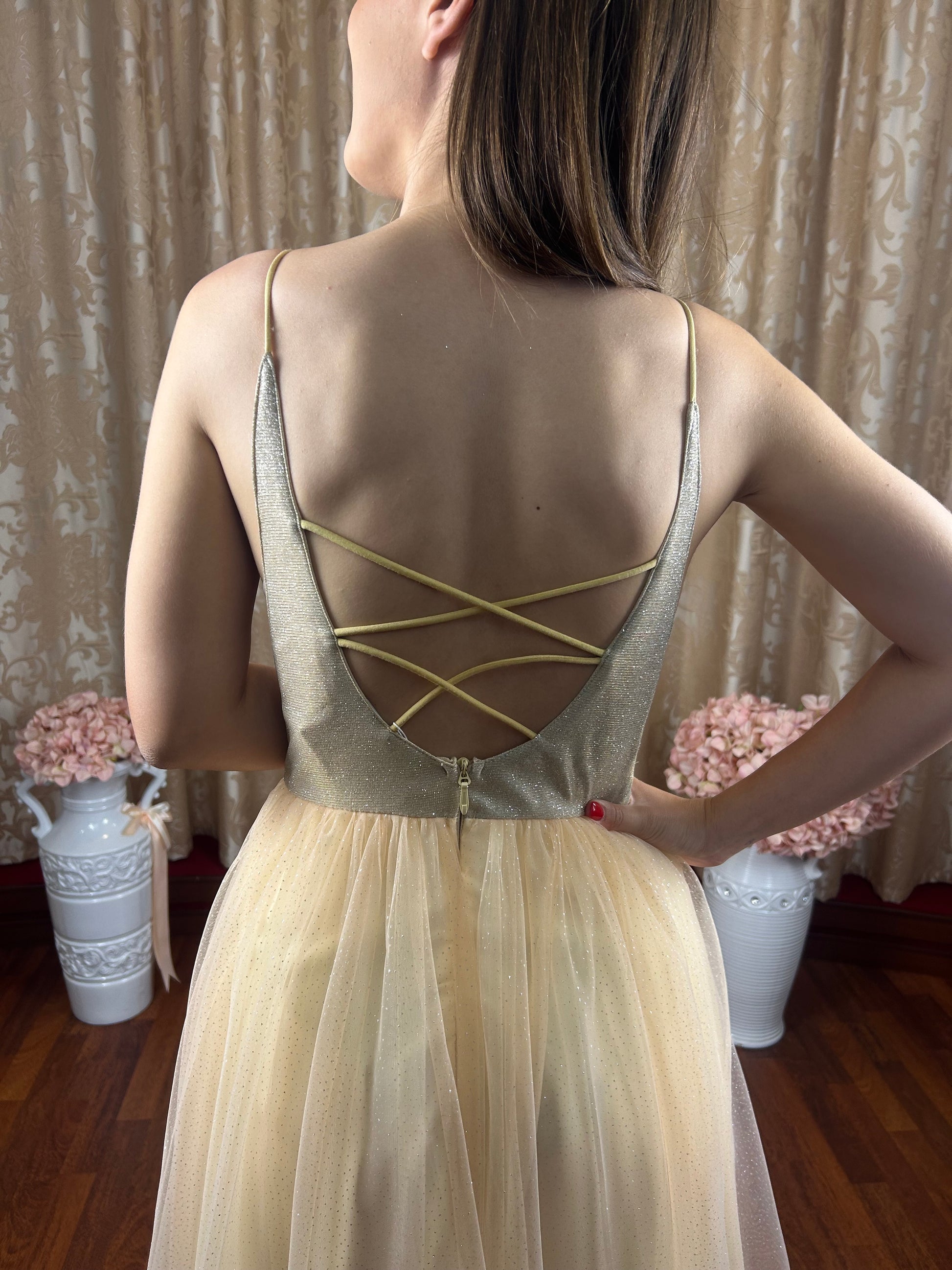 Un sogno scintillante prende vita con questo meraviglioso abito da cerimonia color oro, pensato per far brillare chi lo indossa. Il **corpino glitterato** avvolge il busto con grazia, impreziosito da un scollo a che valorizza il décolleté e da bretelle sottili che si incrociano elegantemente sulla schiena, creando un raffinato gioco di linee.