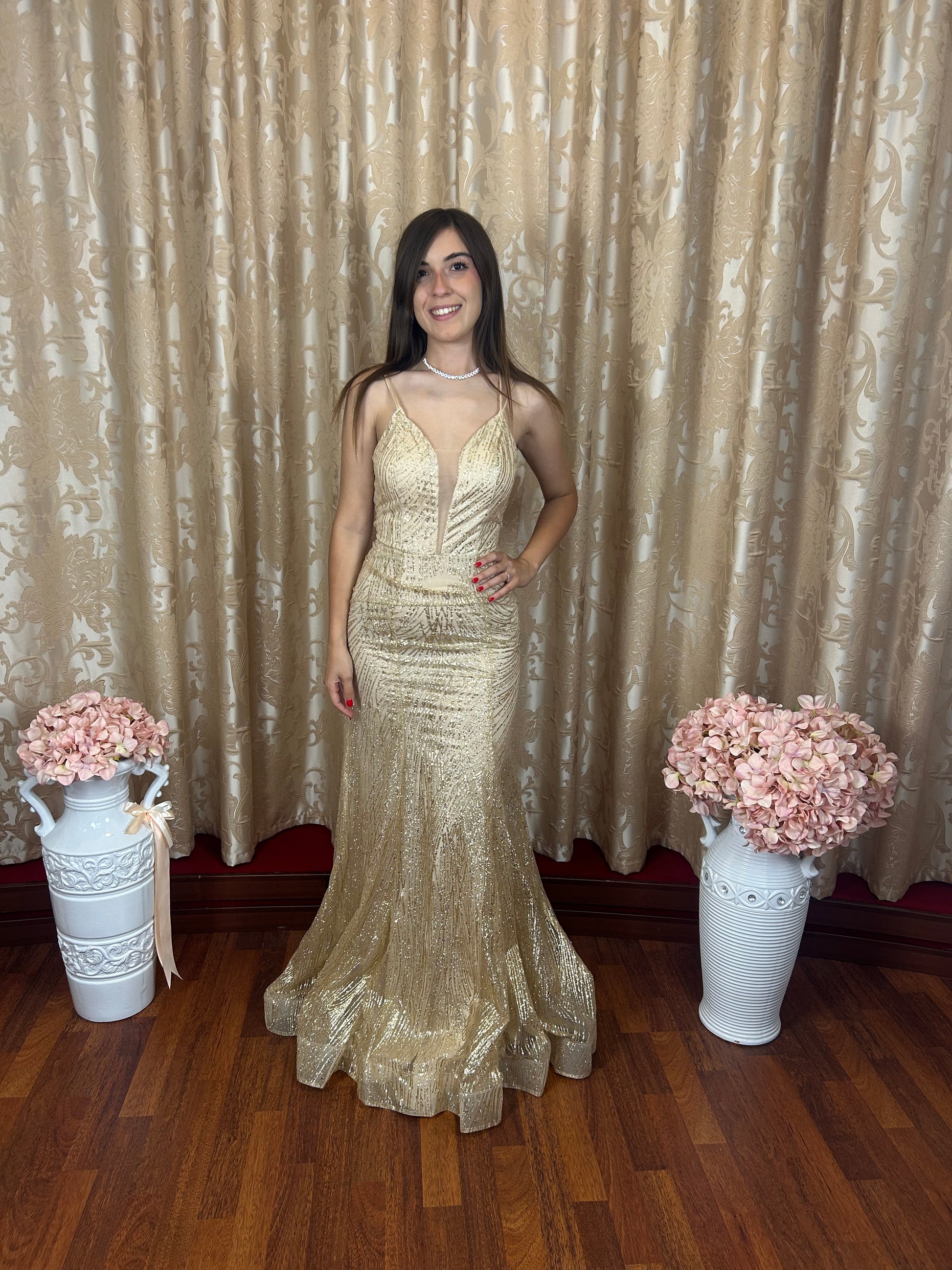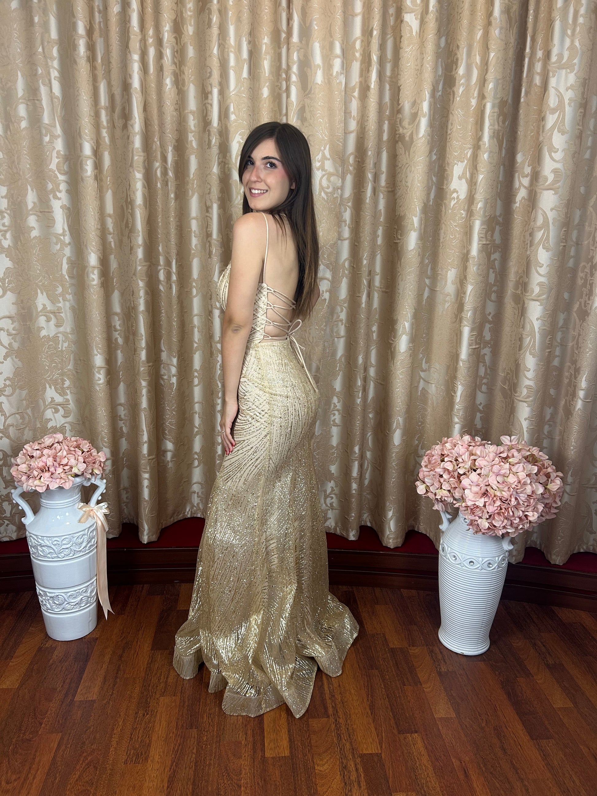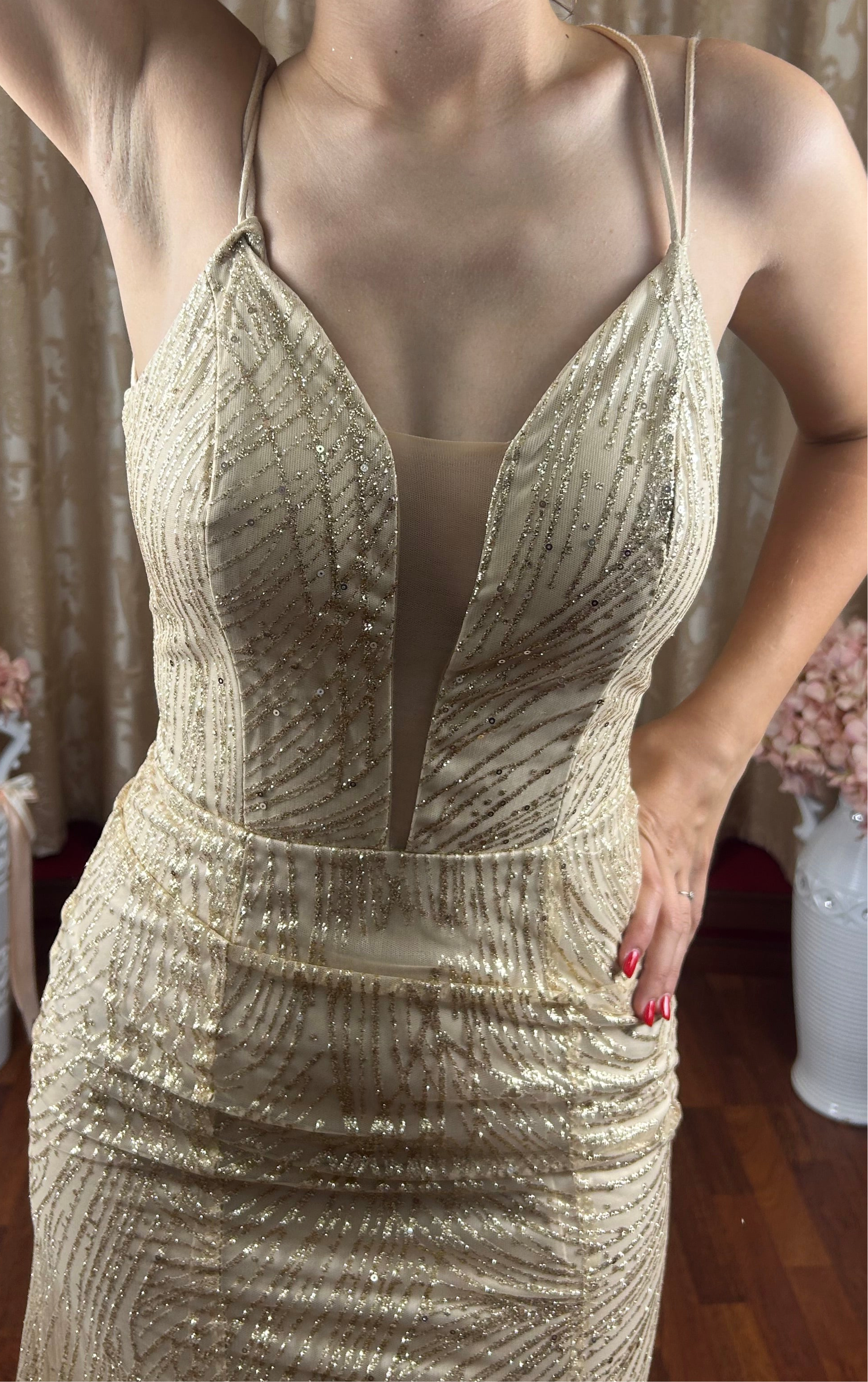 Un'eleganza che incanta al primo sguardo. Questo abito da cerimonia a **sirena** è realizzato in tulle glitterato color oro, un tessuto leggero che accarezza la silhouette e la valorizza con riflessi luminosi ad ogni movimento.