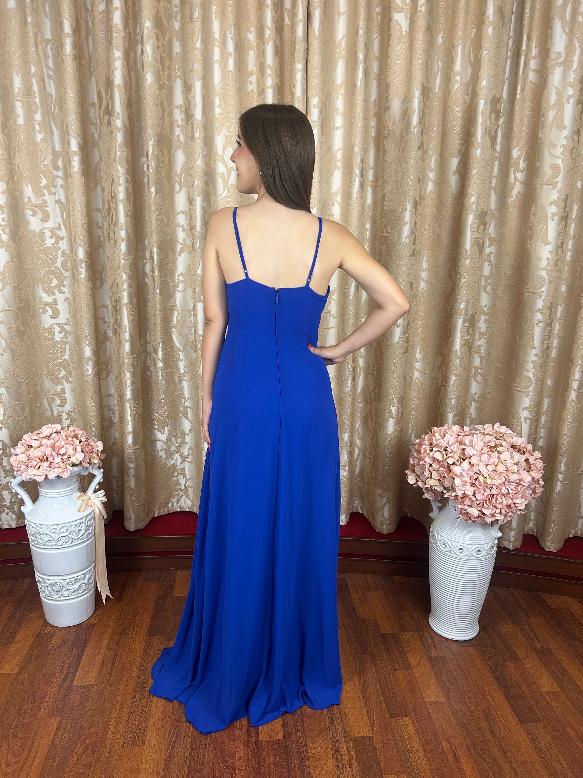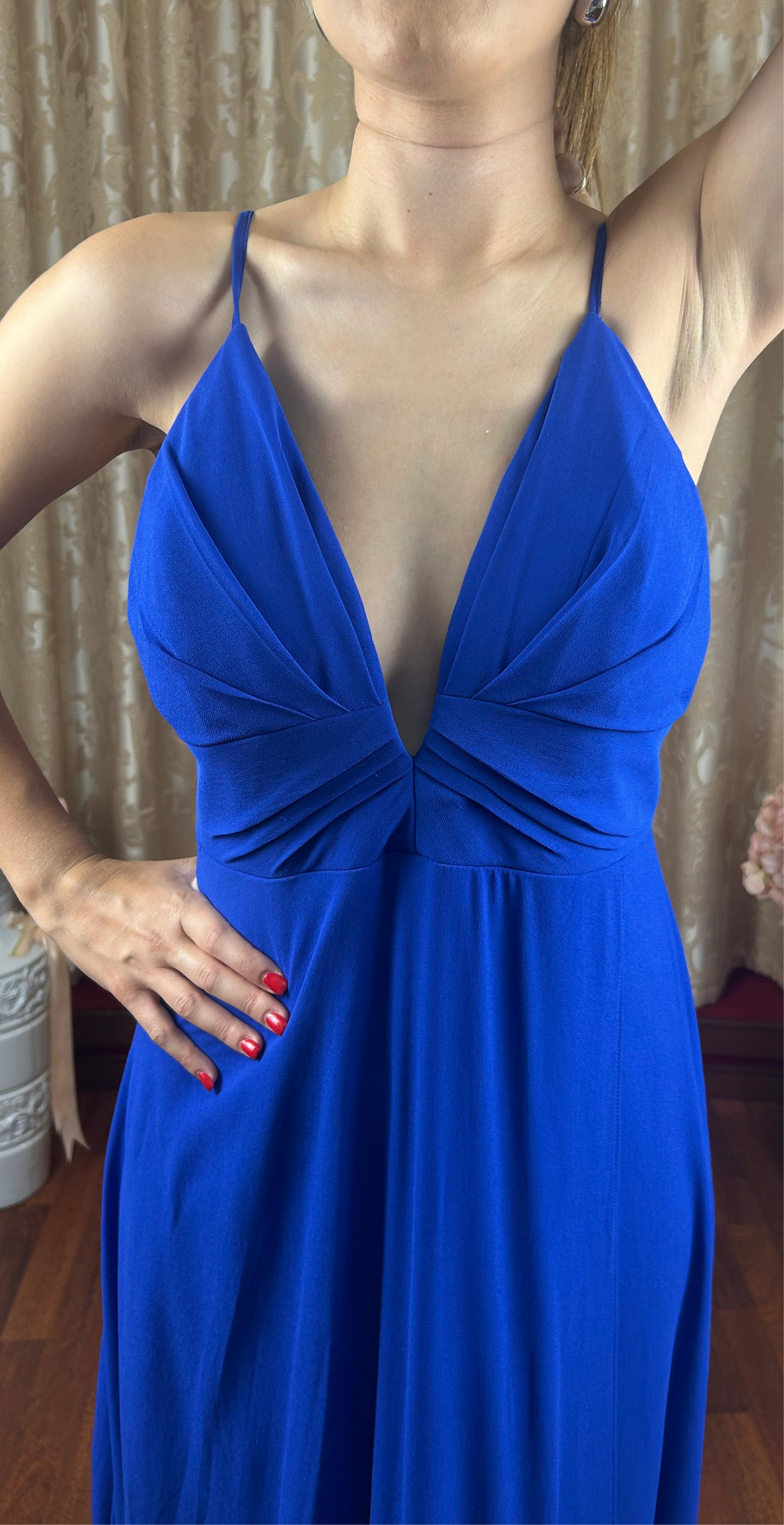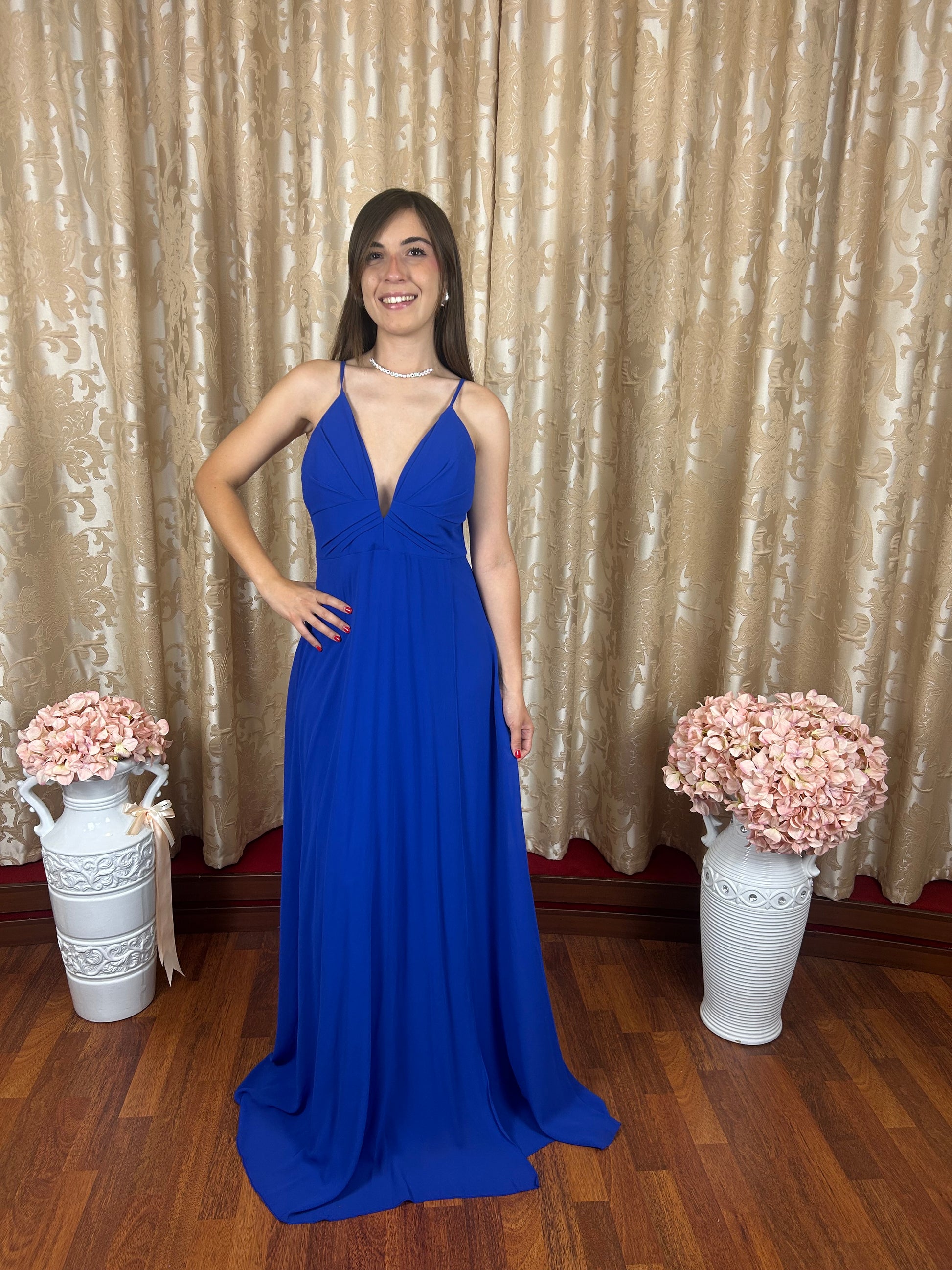 Raffinato e femminile, questo abito da cerimonia in georgette leggero conquista per la sua linea **stile impero**, pensata per valorizzare con dolcezza la figura. Il corpino plissettato a V crea un effetto snellente e slancia il décolleté con discreta eleganza, mentre la gonna fluida scende morbida accarezzando le forme senza segnare. Il colore bluette, intenso e luminoso, dona un tocco di classe e rende questo modello perfetto per cerimonie estive o eventi serali.