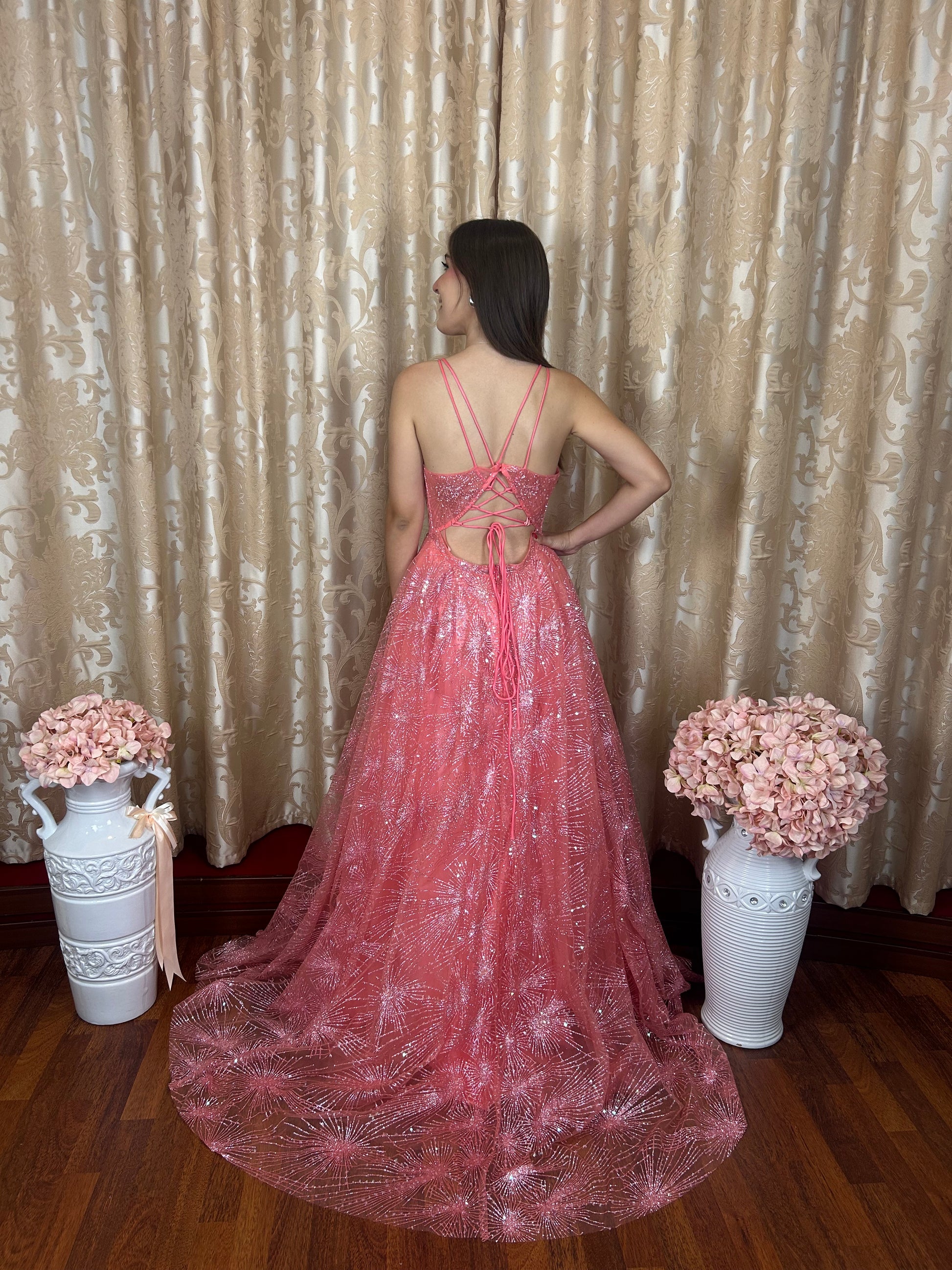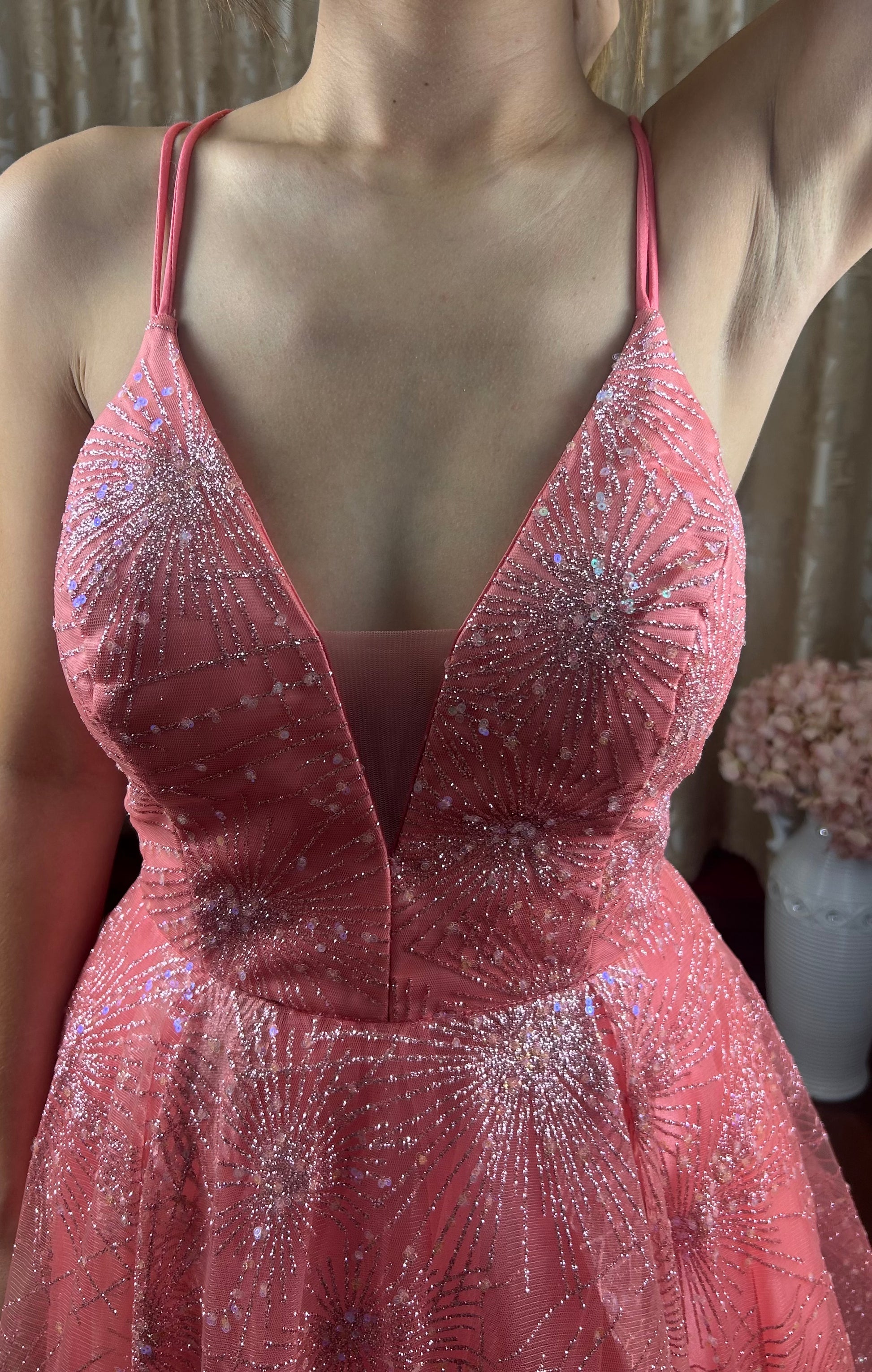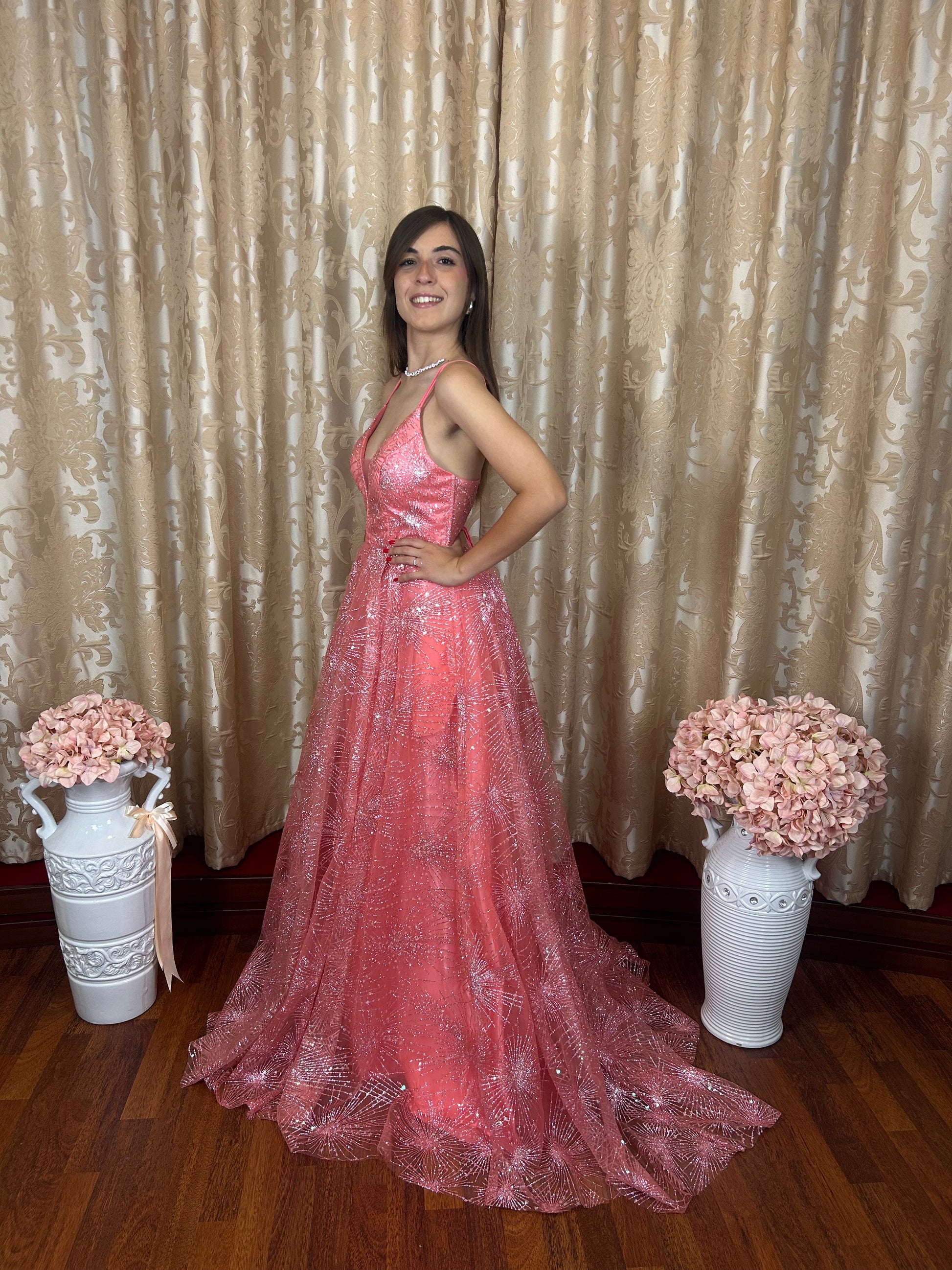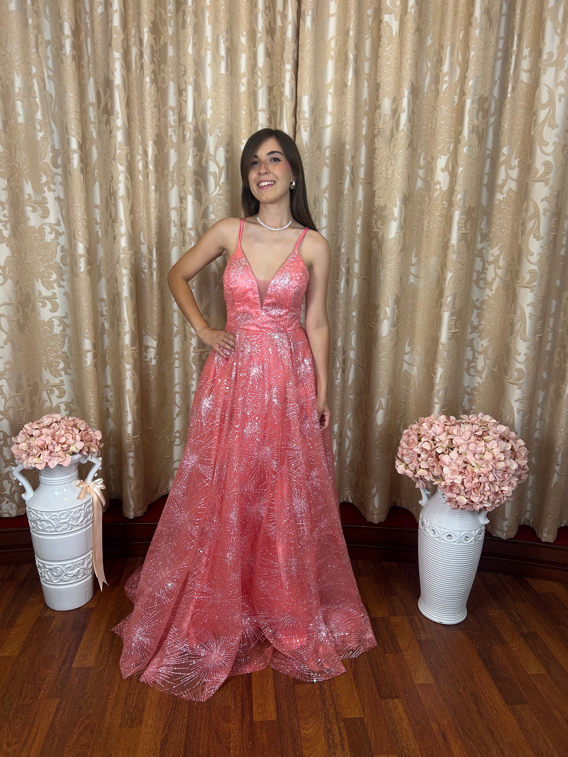 Un sogno a occhi aperti per chi ama la magia delle grandi occasioni. Questo abito da cerimonia stile principesco è realizzato in un raffinato tulle glitterato color corallo, che cattura la luce ad ogni movimento con delicati riflessi. Il corpino con scollo a V incrociato sul retro dona un tocco romantico e sensuale, mentre la gonna ampia e arricciata anch’essa glitterata, regala volume e leggerezza per un effetto fiabesco.