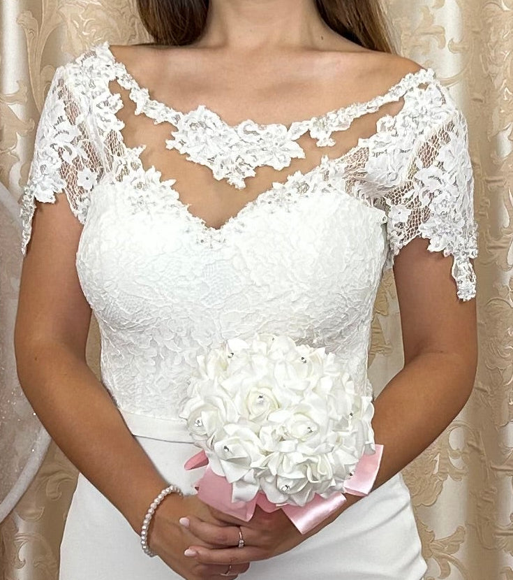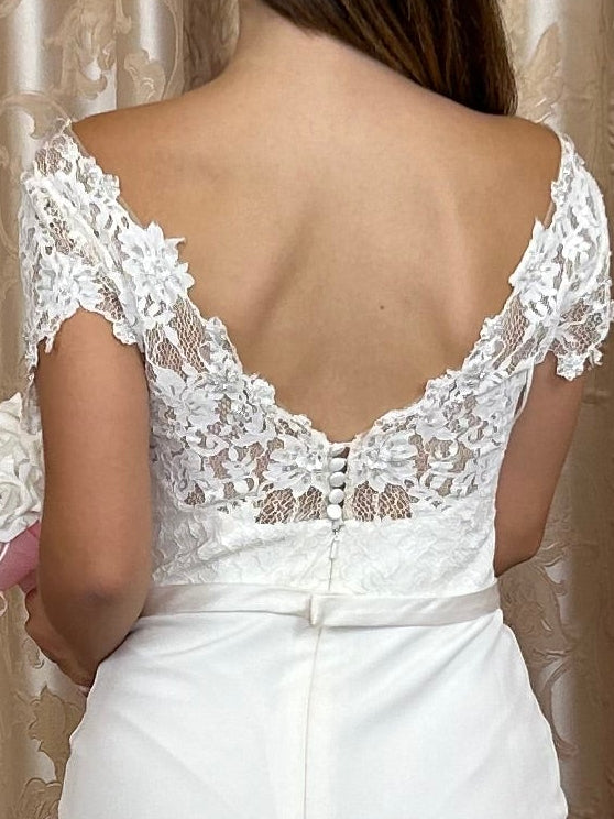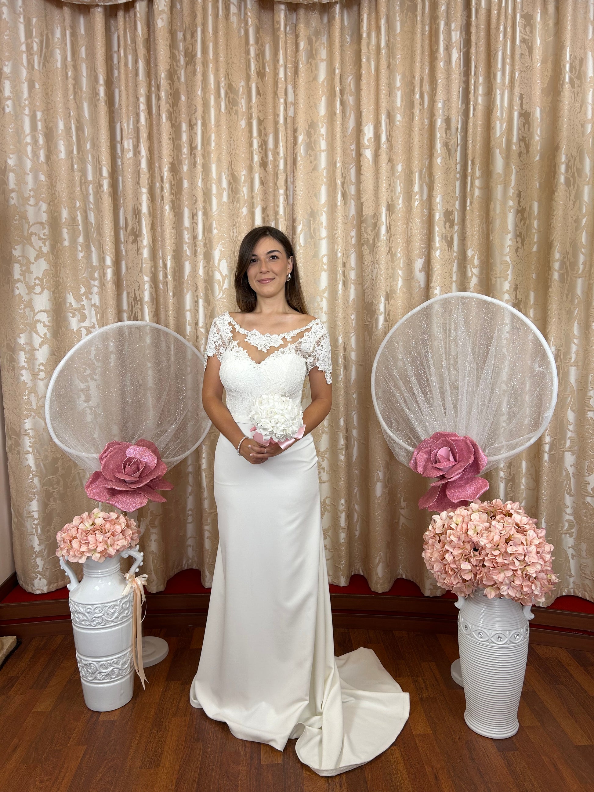 Abito da Sposa in Georgette bianco seta dal fascino raffinato e senza tempo. Il **corpino steccato** con **scollo a V** valorizza la silhouette, mentre le corpino in pizzo macramè impreziosite da ricami e cristalli donano un tocco di luce e romanticismo La **gonna a trapezio** scivola morbida fino a una **coda rotonda**, creando un movimento fluido e armonioso. A completare l’insieme, una **cinta in vita** sottolinea con grazia le forme, regalando un’eleganza regale in ogni passo.