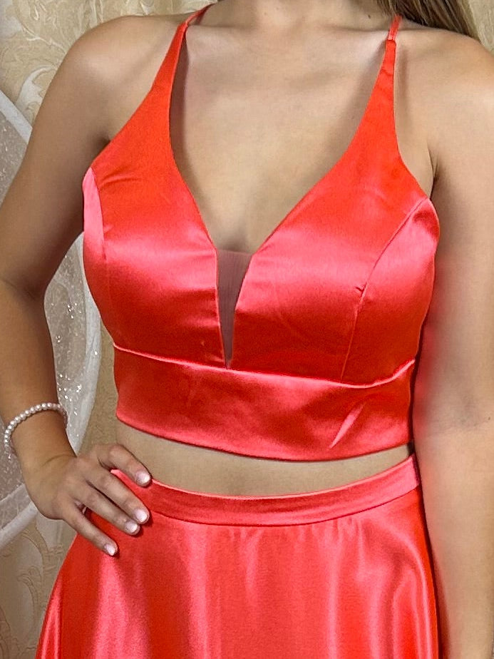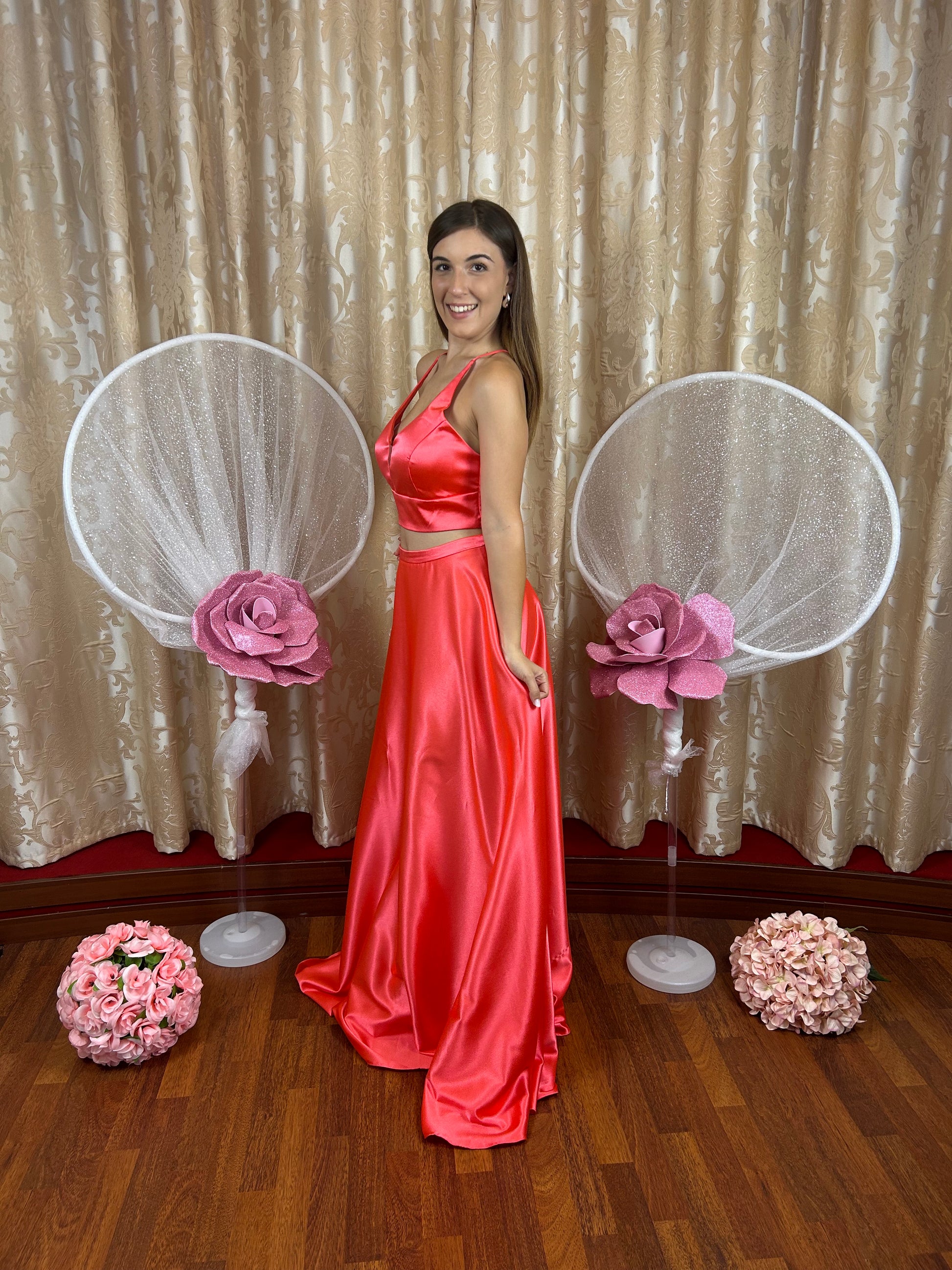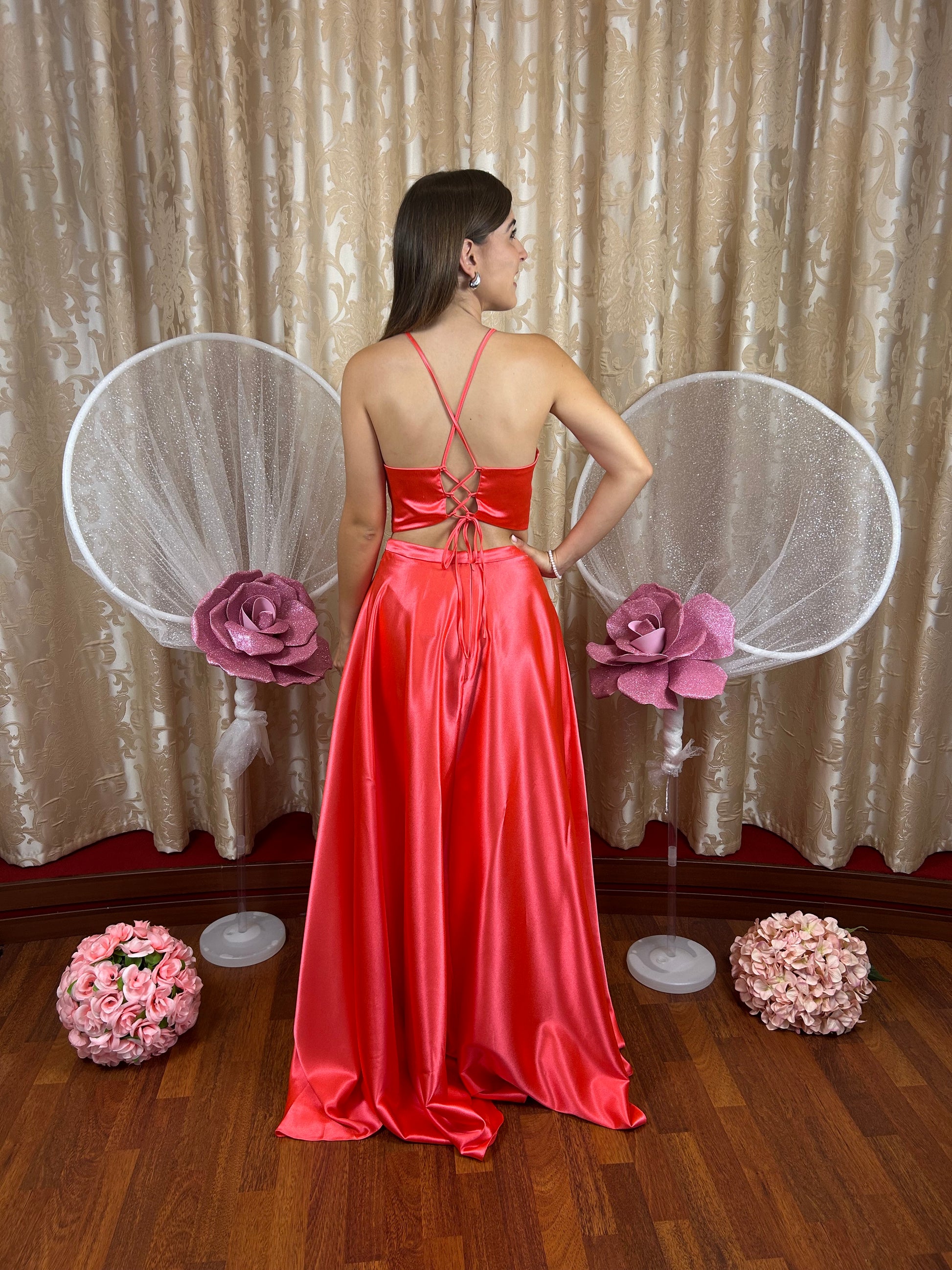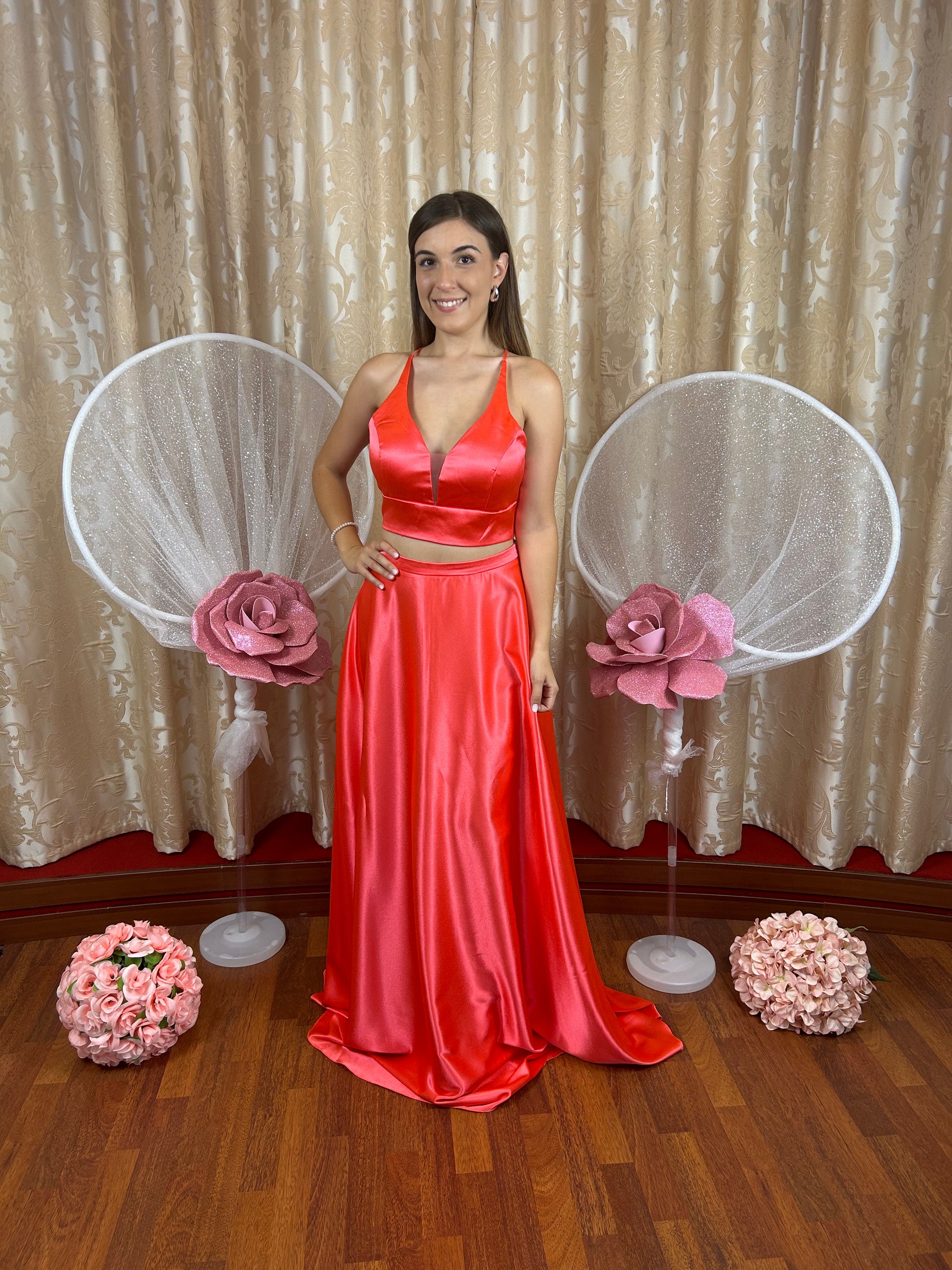 Raffinato abito da cerimonia in **morbido tessuto rasettone**, proposto in un elegante tono **aragosta**. Il modello è composto da **due pezzi**: un sofisticato **corpino con scollo a V** sia sul davanti che sul retro, impreziosito da un romantico **intreccio posteriore** che dona un tocco di femminilità e fascino. La **gonna a trapezio** scivola leggera, valorizzando la silhouette e regalando un’eleganza senza tempo.