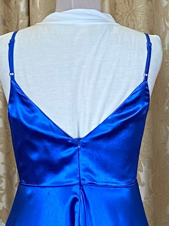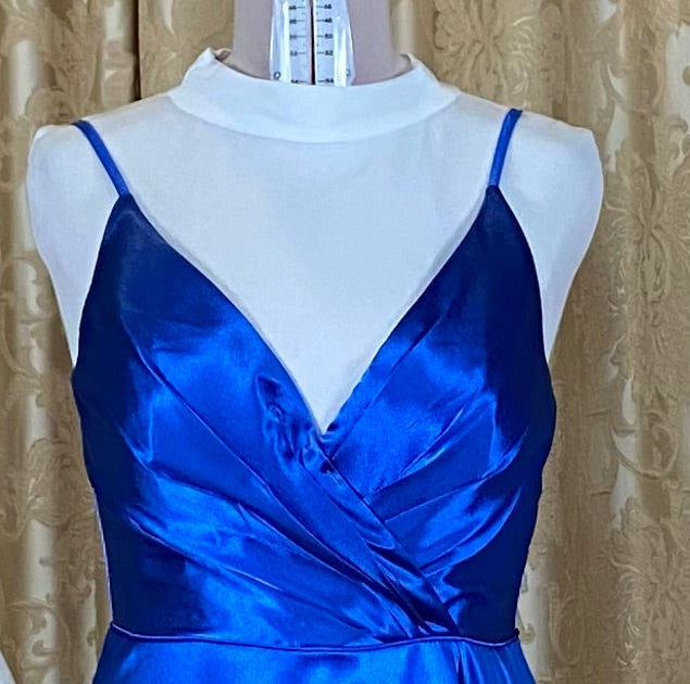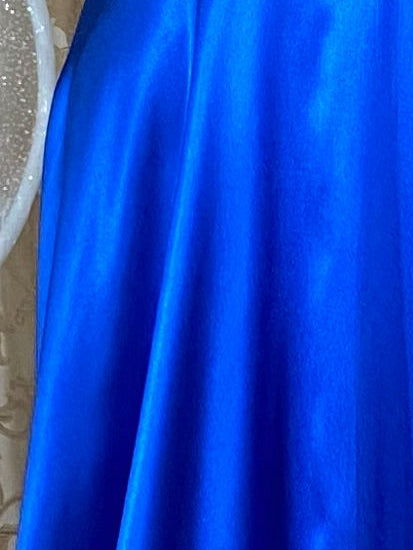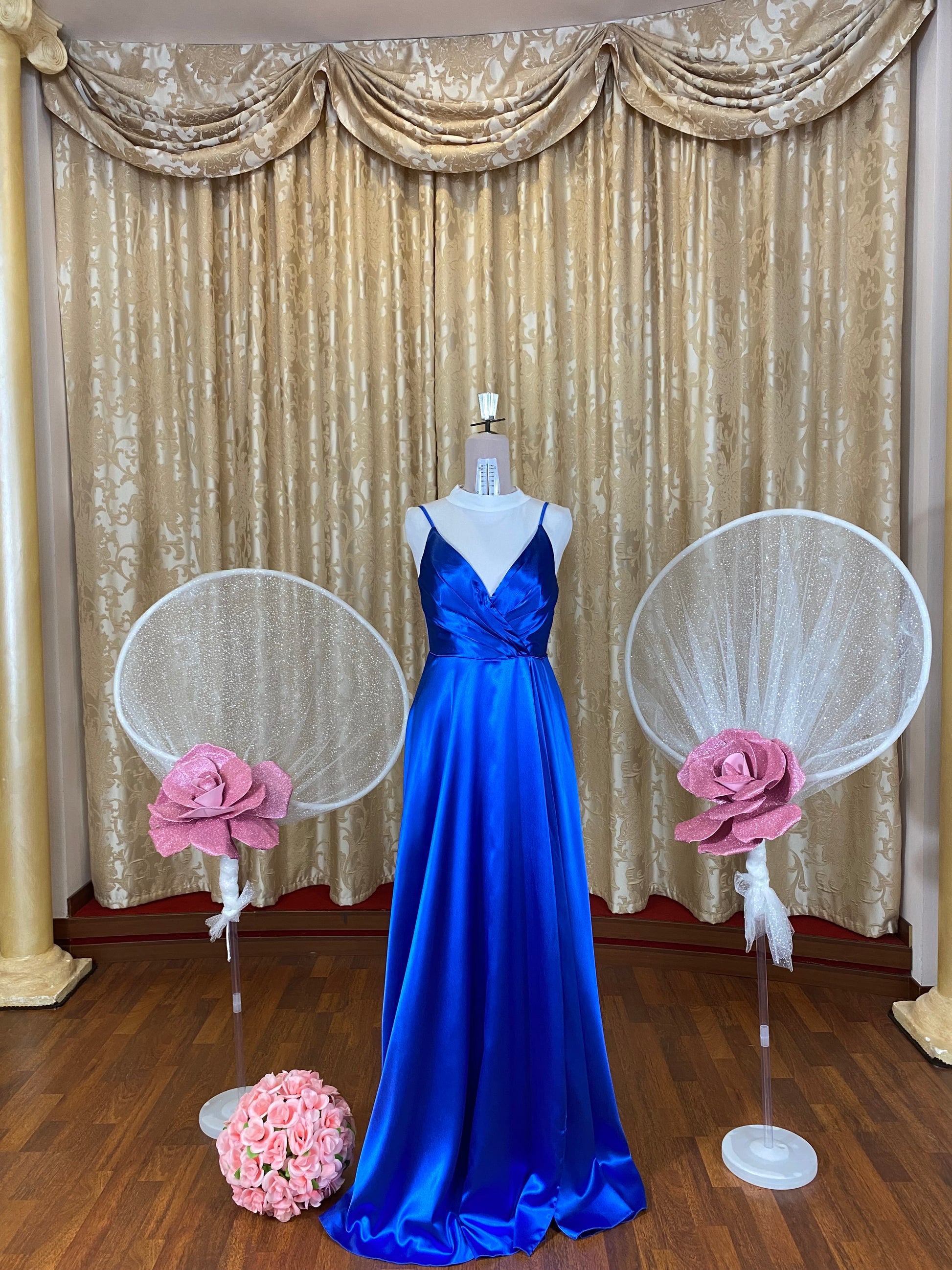 Il **corpino** presenta un delicato **plissé frontale** che slancia la figura e un **sensuale scollo a V** sia sul davanti che sul retro, conferendo femminilità e armonia alle linee. La **gonna a trapezio**, morbida e fluida, si apre in una **coda elegante** che dona movimento e un tocco di regalità ad ogni passo.