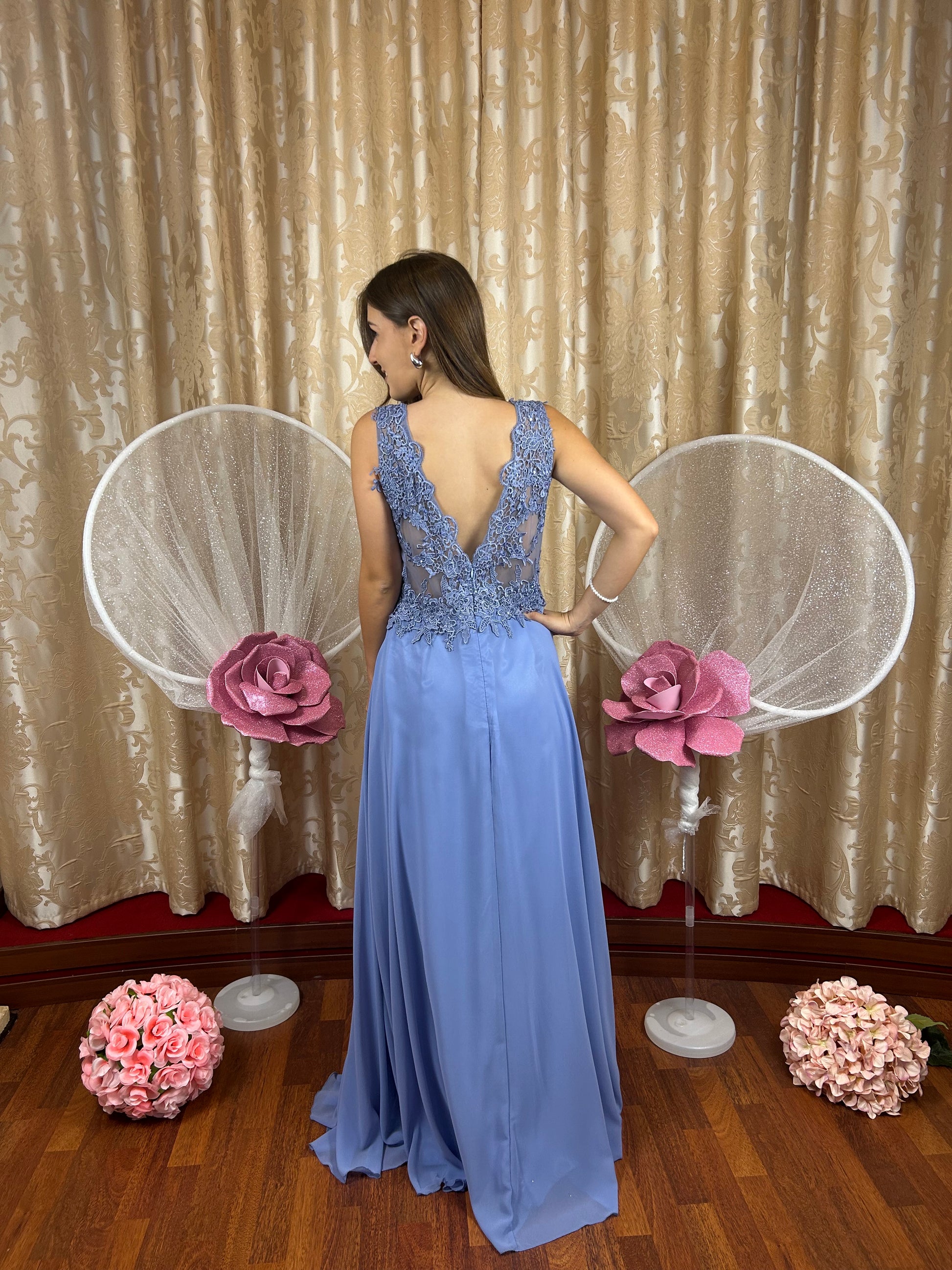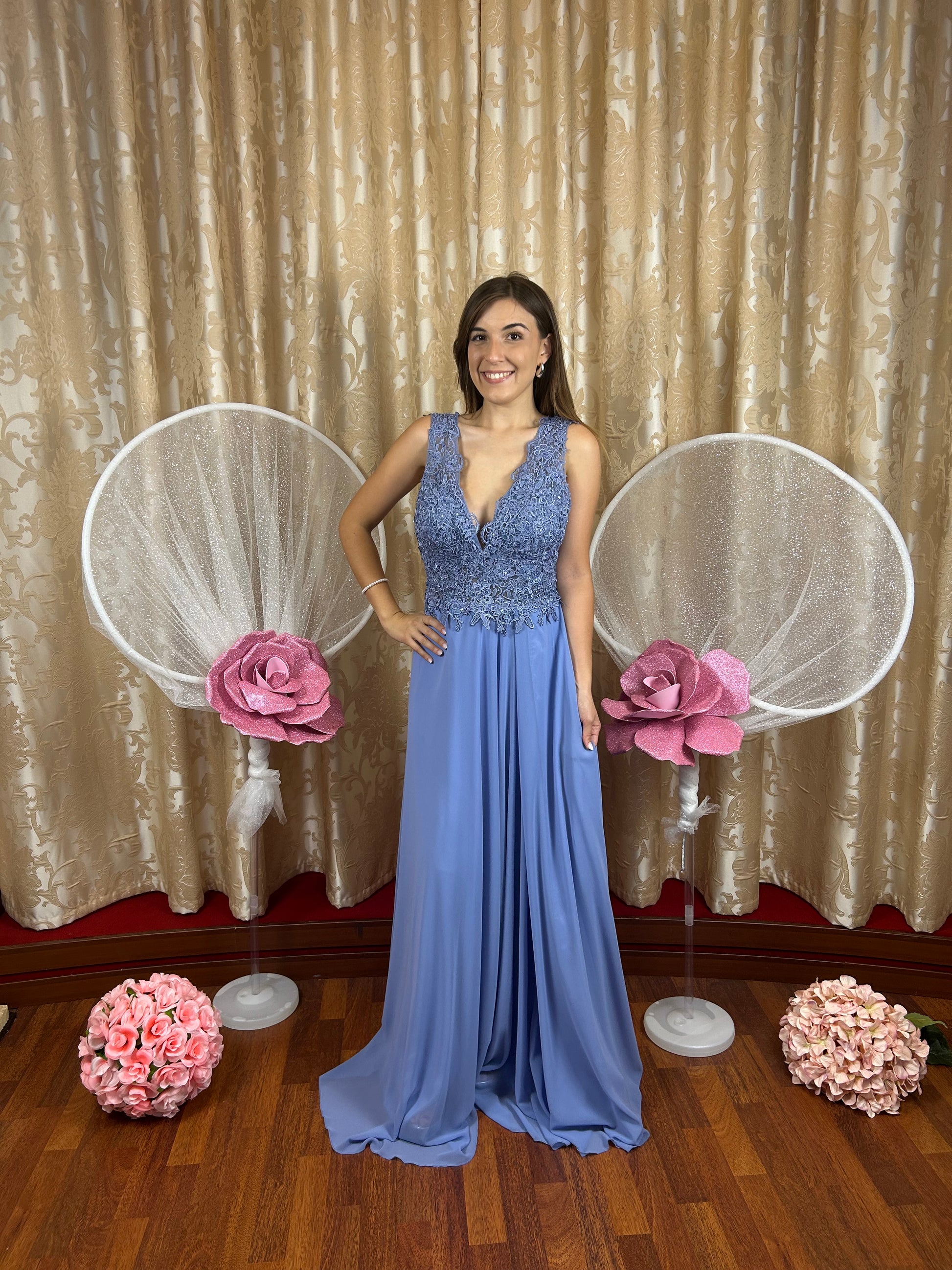 Un abito da cerimonia raffinato e armonioso, realizzato in leggero georgette color avion, pensato per esaltare con dolcezza ogni silhouette. Il corpetto in prezioso pizzo macramè, impreziosito da ricami in cristallo tono su tono, dona luce e carattere senza eccessi, valorizzando la figura con classe.