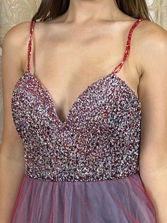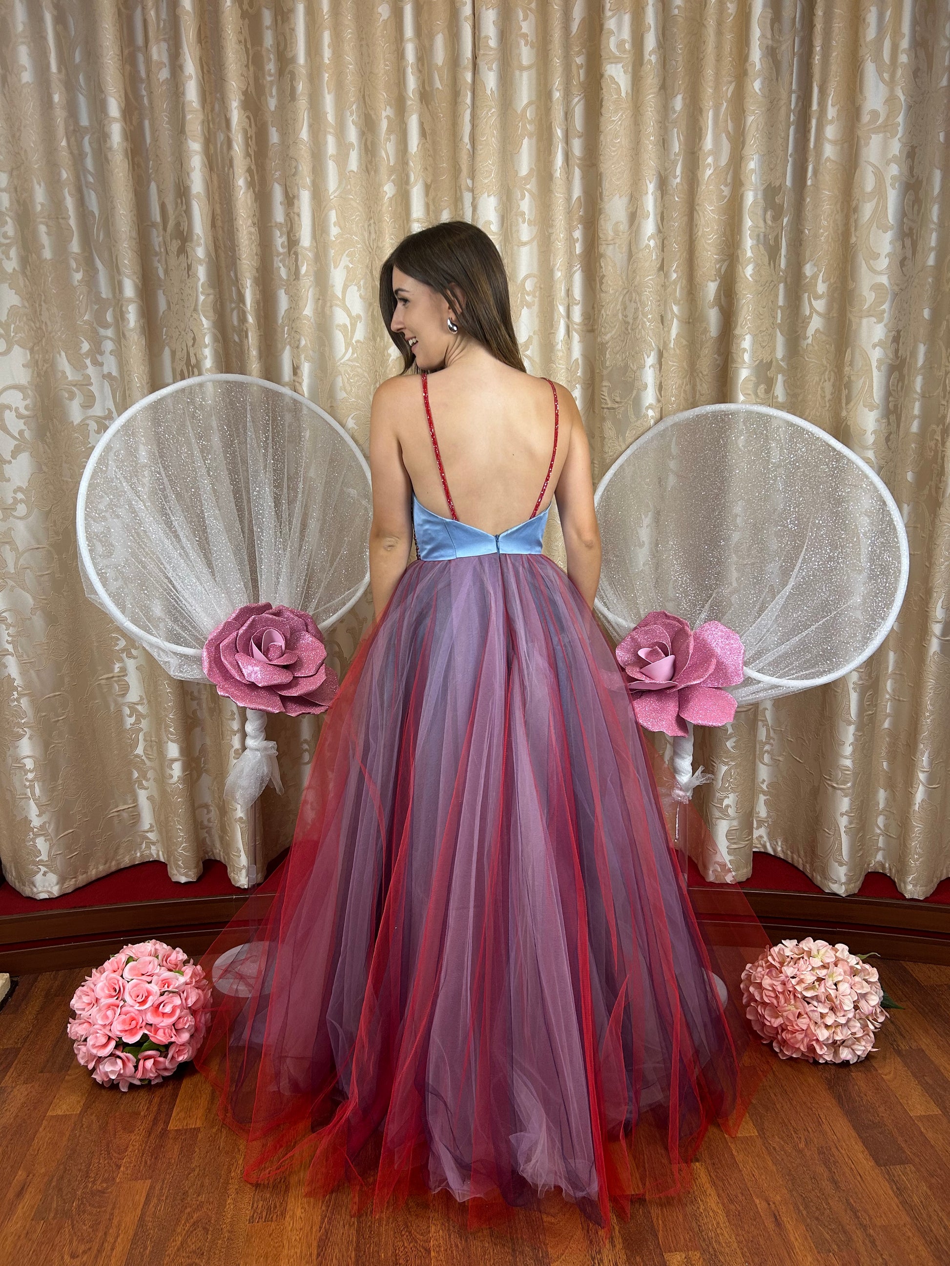 Un sogno di colori e leggerezza prende forma in questo abito da cerimonia unico nel suo genere. Realizzato in tulle sfumato nei toni incantevoli del blu, rosso e celeste, si distingue per la sua eleganza eterea e la raffinata armonia cromatica. Il corpetto a cuore, impreziosito da ricami di perline colorate, abbraccia la silhouette con delicatezza e si apre sul retro con una scollatura profonda, aggiungendo un tocco di femminilità e fascino