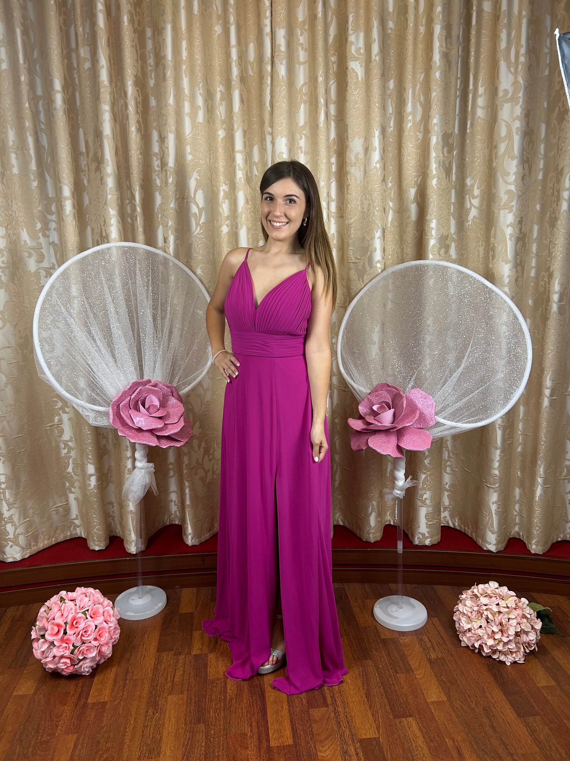 Abito da cerimonia in georgette ciclamino con scollo a V bretelle e gonna svasata con spacco.
