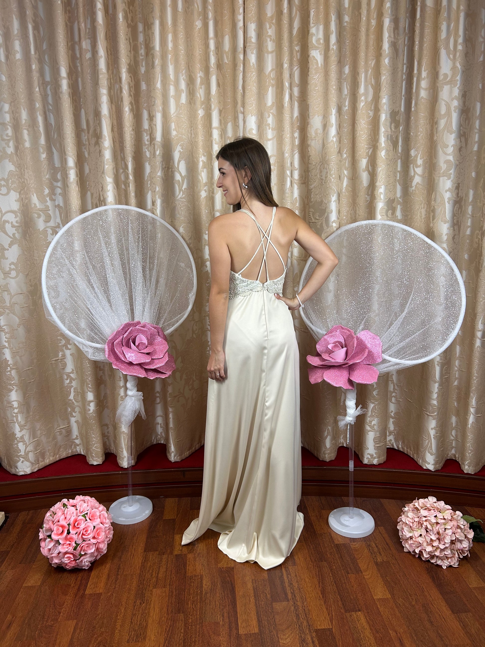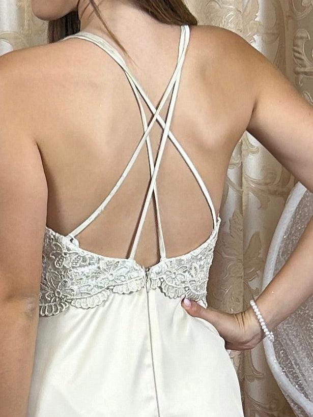 Raffinato abito da cerimonia in cady di seta color beige, caratterizzato da un'elegante linea pulita e dettagli romantici. Il corpino a cuore è impreziosito da ricamato scollo dietro incrociato, che accarezza le forme con grazia, mentre le bretelline sottili donano un tocco di leggerezza e femminilità. La gonna dritta in cady seta scivola con armonia lungo la silhouette e si apre sul retro con una delicata coda, per un effetto sofisticato e di grande impatto scenico