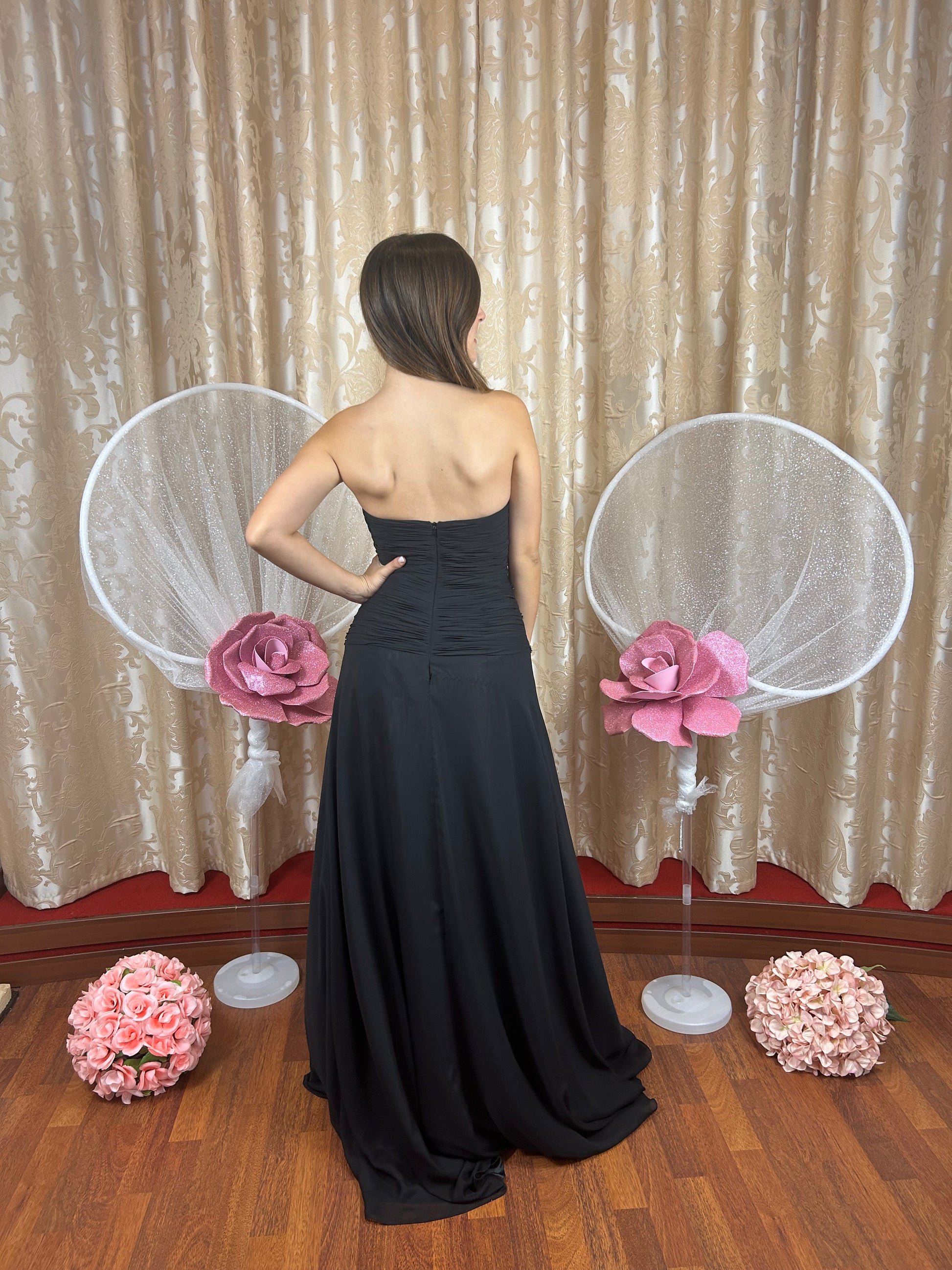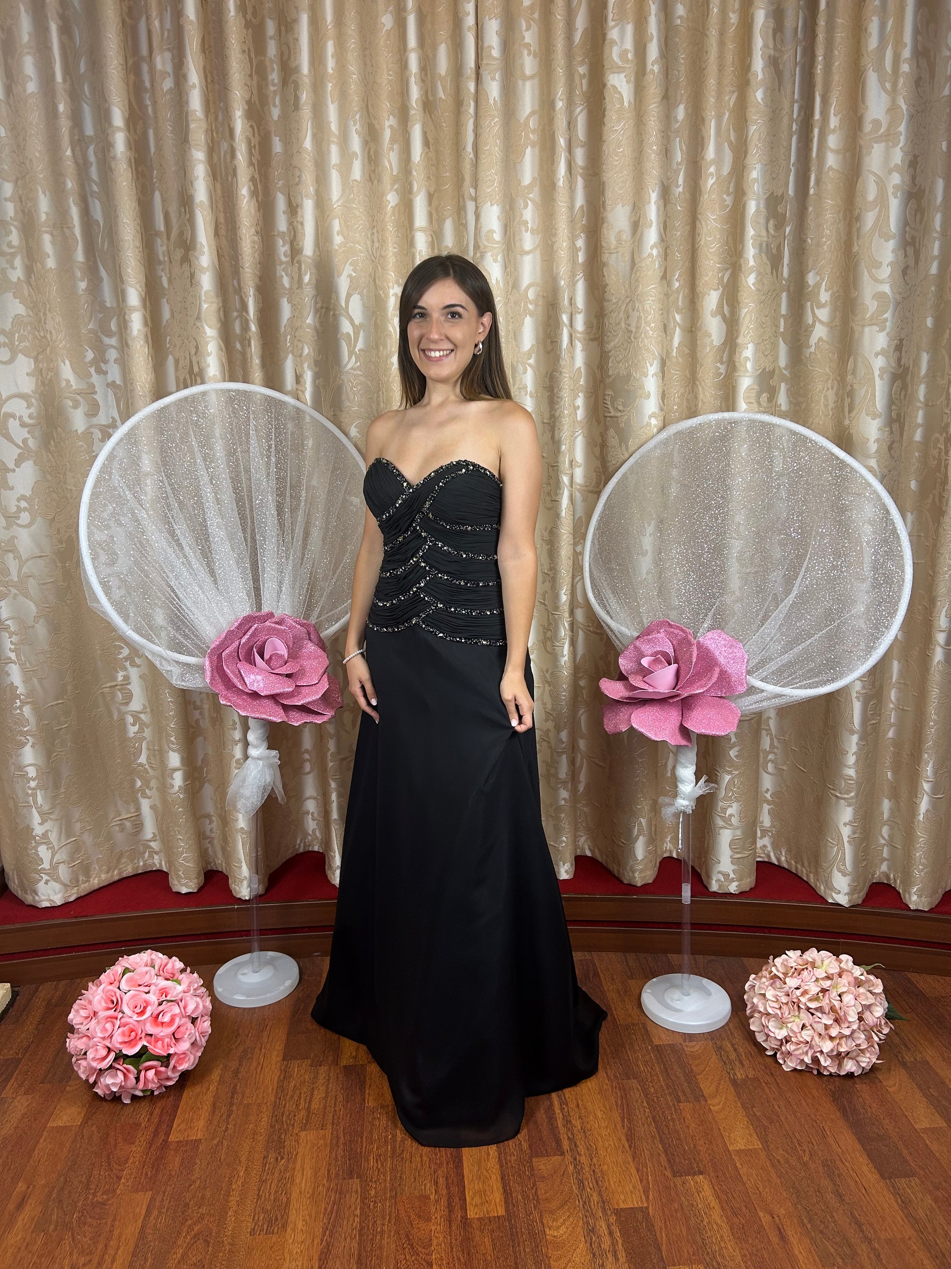 Raffinato e seducente, questo abito in morbida georgette nera avvolge la silhouette con eleganza. Il corpino steccato a cuore, impreziosito da scintillanti cristalli argentati e dettagli tono su tono, dona un tocco di luce sofisticato. La gonna a trapezio, fluida e leggera, scivola armoniosamente accompagnando ogni movimento, per un effetto regale e senza tempo.