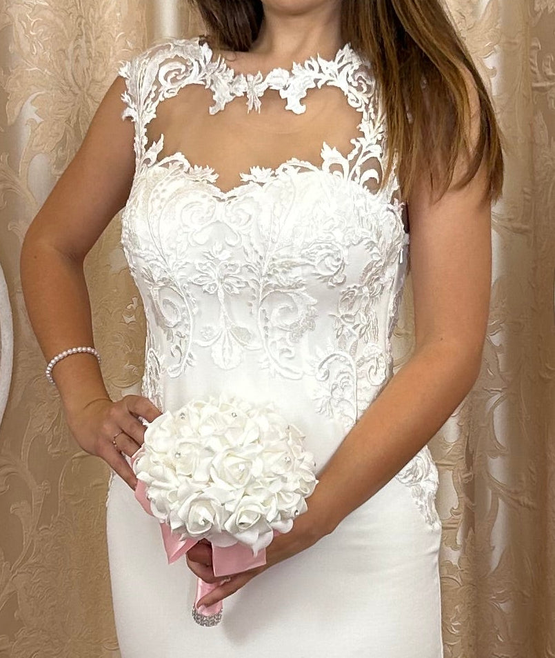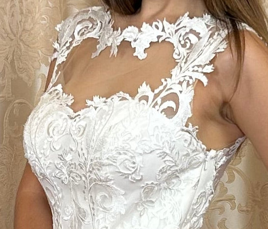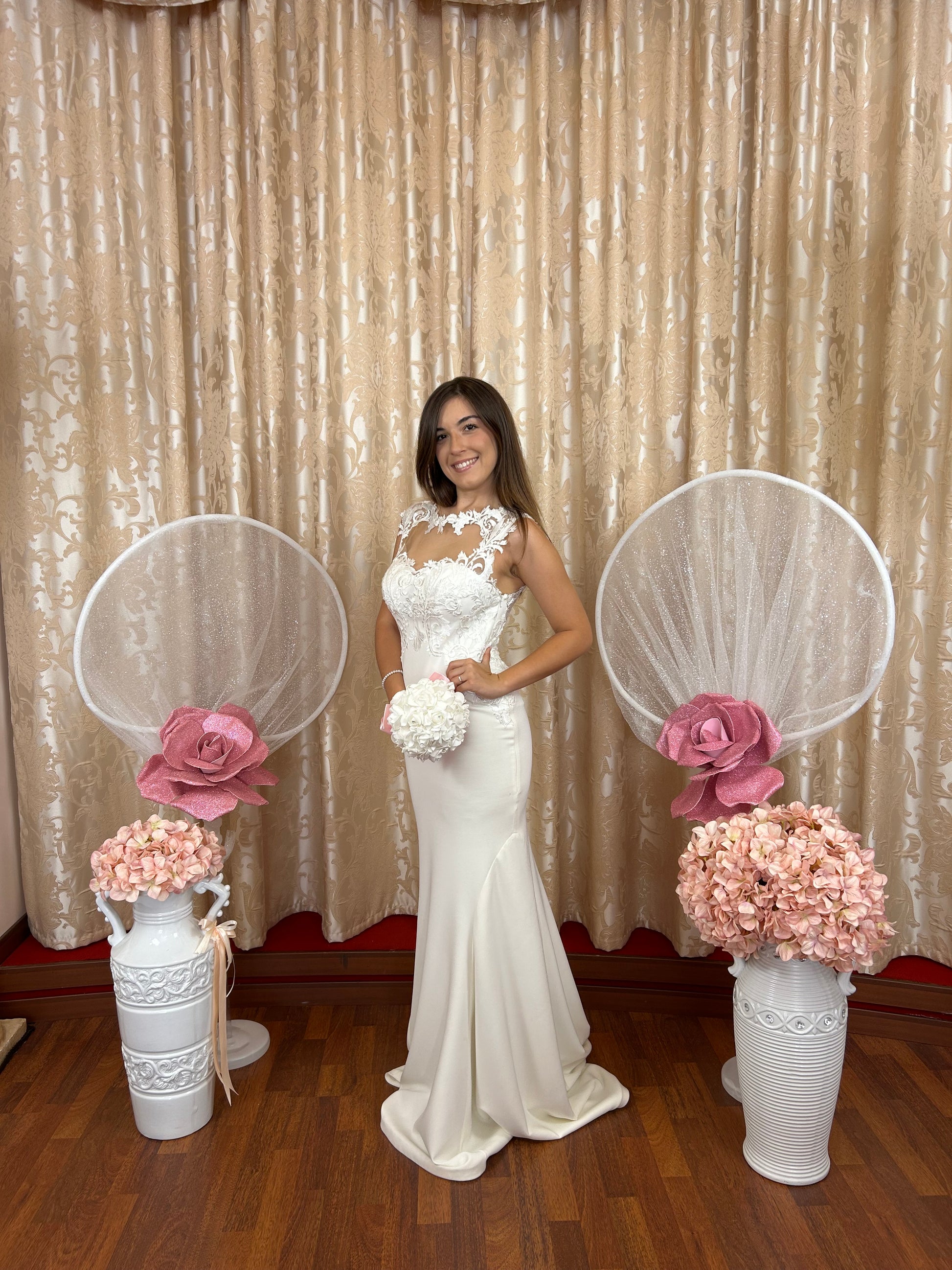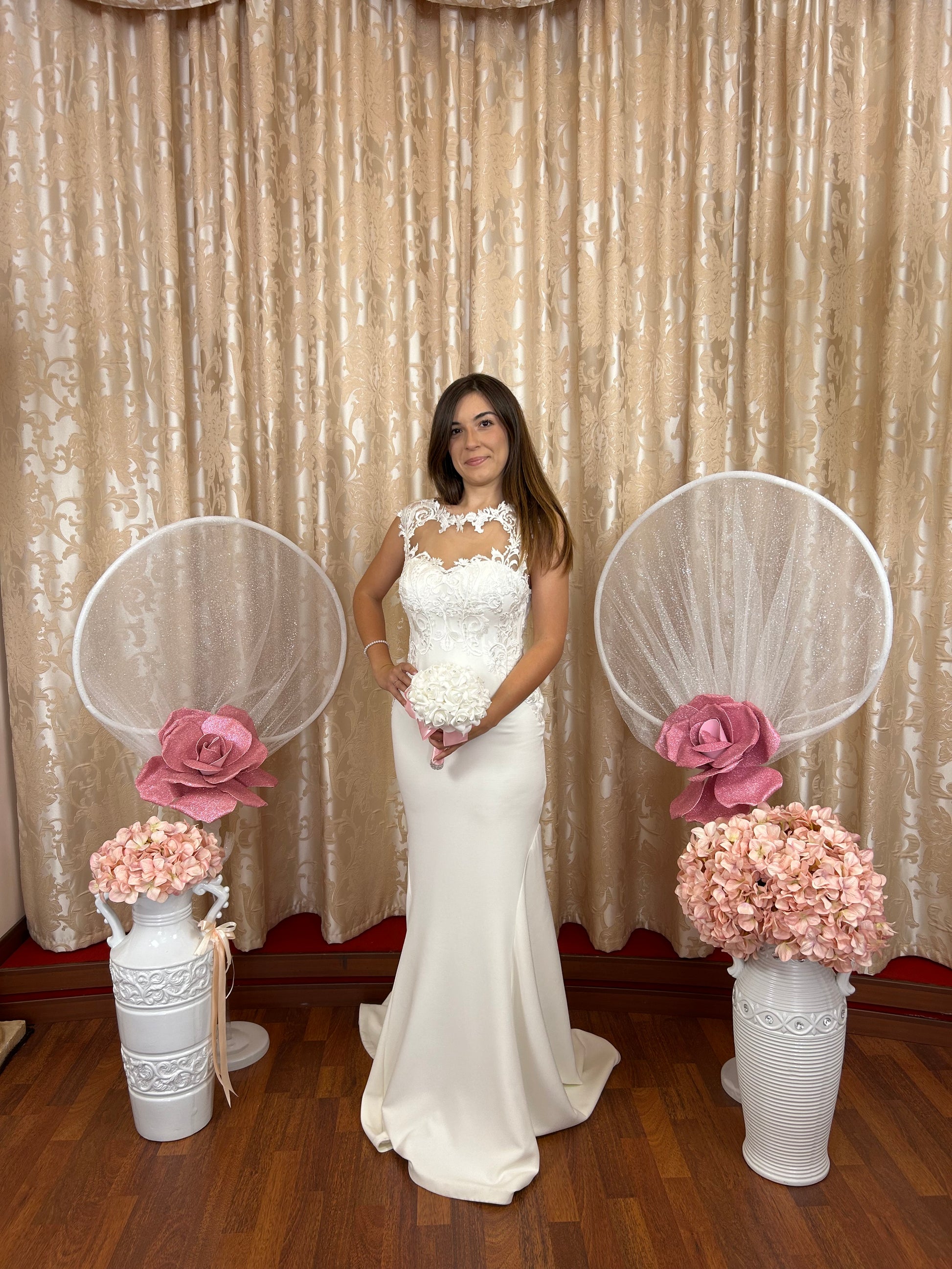 Abito da sposa linea sirena in pregiato cady elasticizzato doppiato, che avvolge la silhouette con raffinatezza. Il corpino è impreziosito da pizzo e tulle in trasparenza, creando un raffinato gioco di vedo-non-vedo sia sul davanti che sul retro. La coda sirena si apre in un’elegante cascata, arricchita da un pizzo centrale che scivola armoniosamente fino alla sua estremità. Un modello che unisce sensualità e classe, perfetto per una sposa che sogna un fascino senza tempo