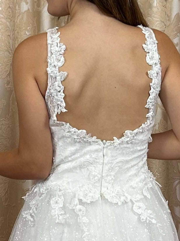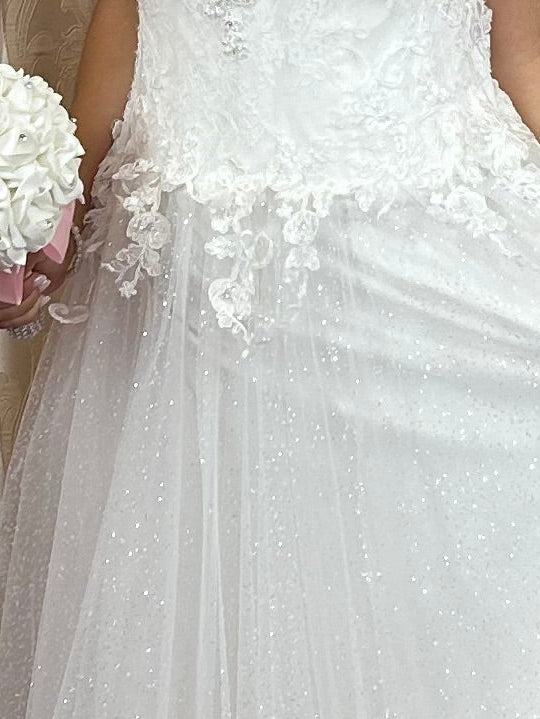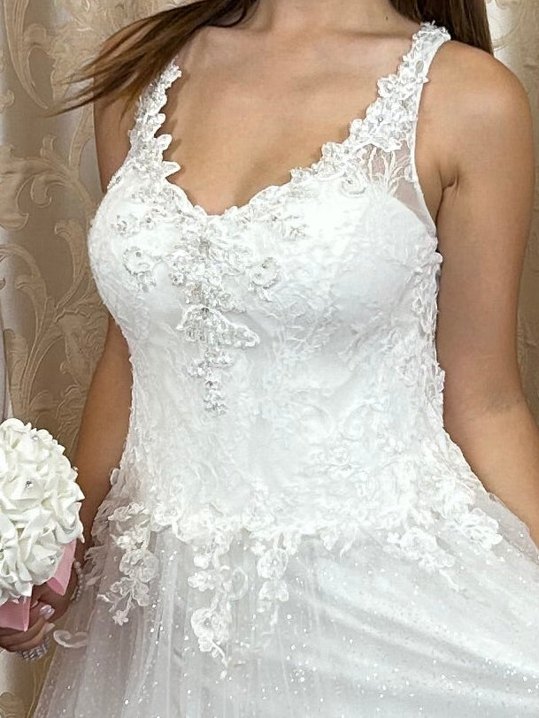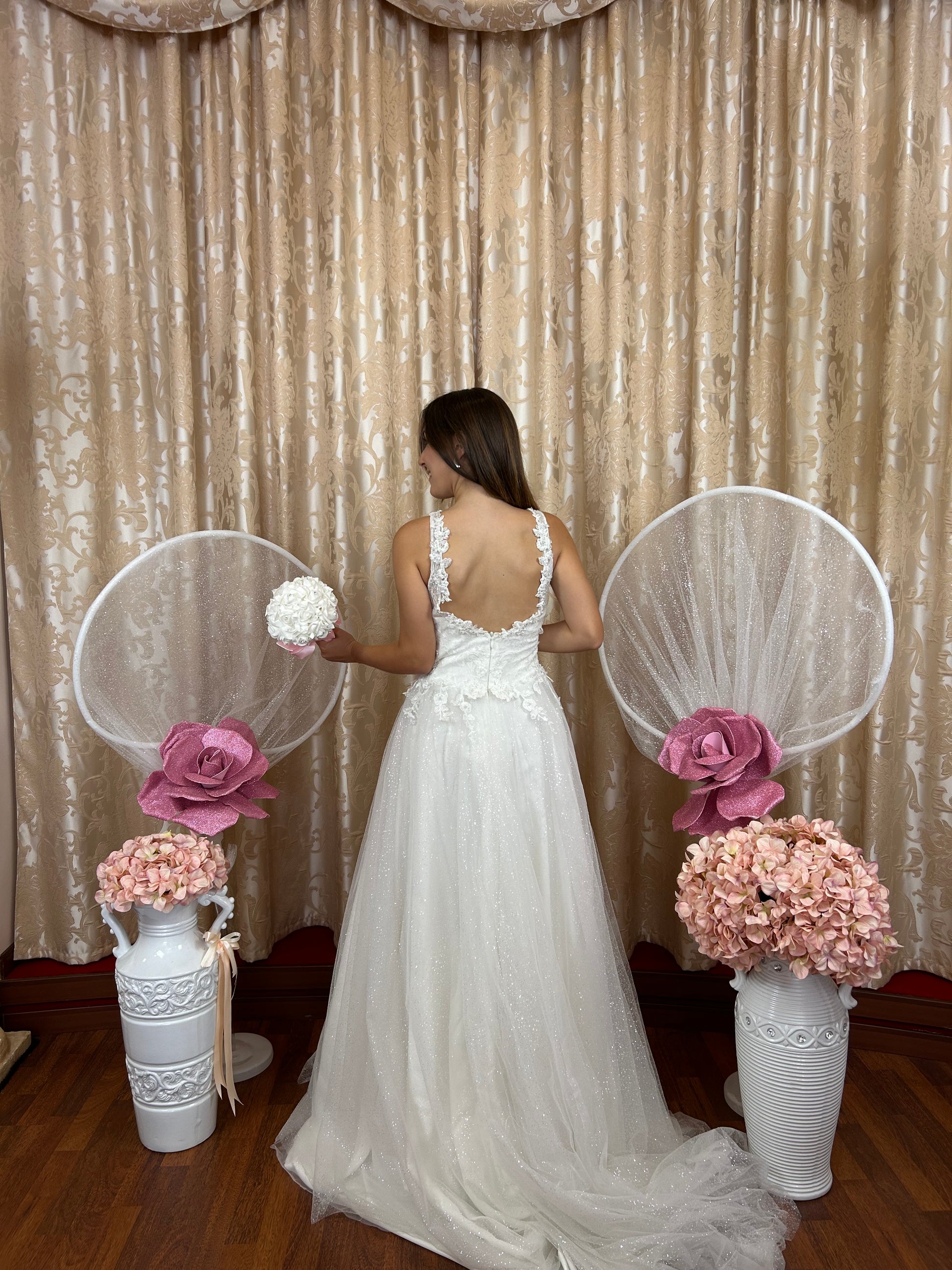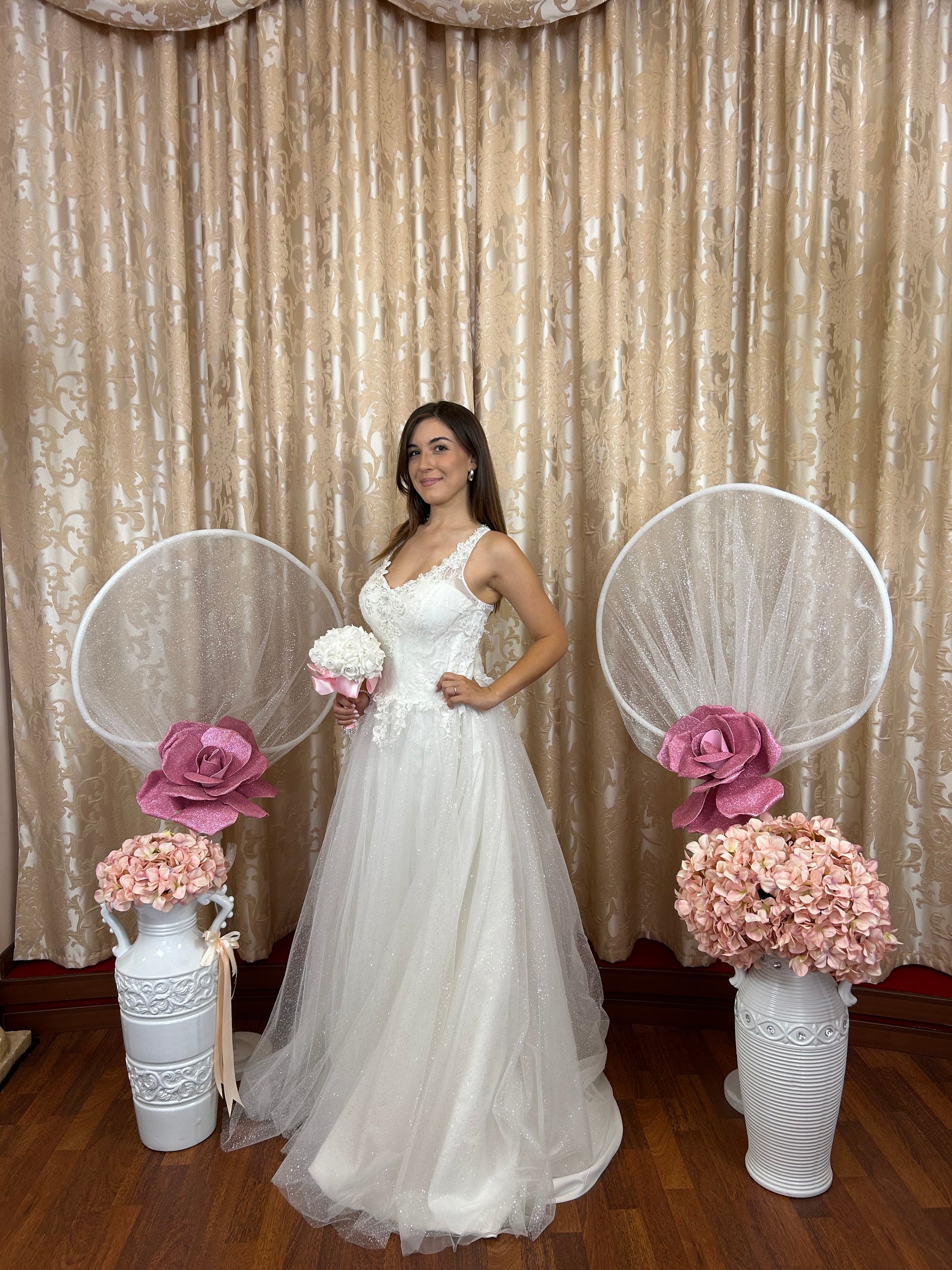Un sogno di luce e romanticismo, questo abito da sposa dal taglio principessa incanta con la sua gonna ampia realizzata in molteplici strati di tulle glitterato, che dona un effetto scintillante ad ogni passo.
