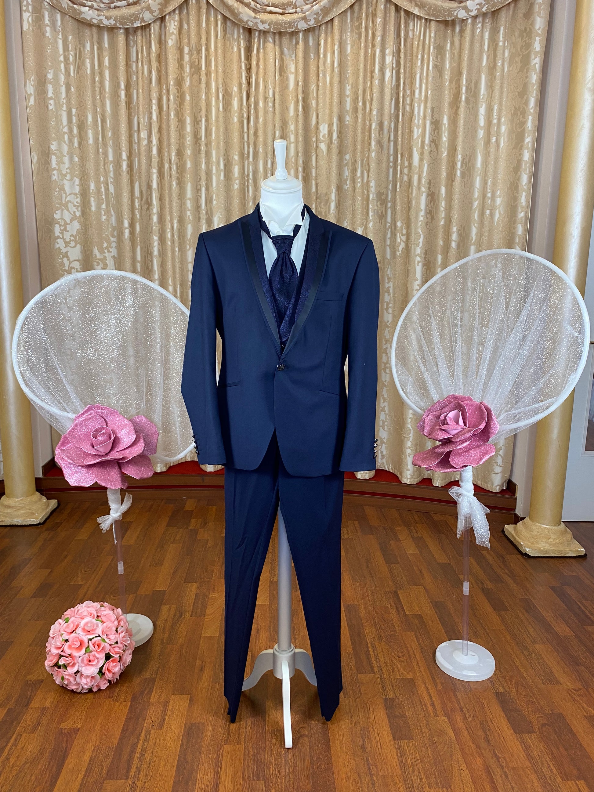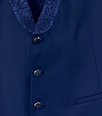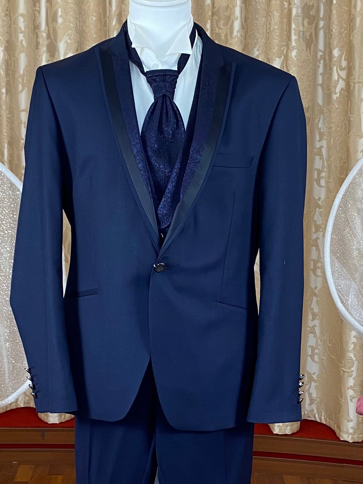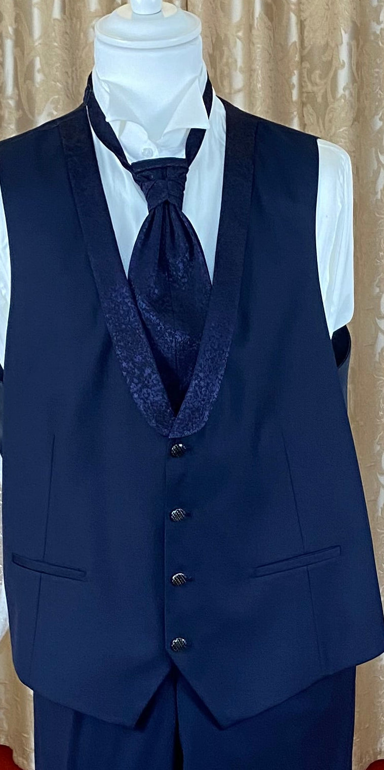 Abito da uomo per sposo o cerimonia, realizzato in tessuto blu scuro. La giacca presenta revers classico e colletto rivestito nello stesso tessuto, con chiusura a uno o due bottoni (a seconda del modello). Il completo include gilet coordinato in tessuto damascato, caratterizzato da motivo jacquard tono su tono, e cravattone dello stesso materiale e disegno. La scelta del blu scuro, tonalità formale e tradizionalmente associata a cerimonie serali o ambienti eleganti, è compatibile con camicie in cotone bianco o avorio. L’insieme è destinato a contesti formali come matrimoni, ricevimenti e altre occasioni di gala.