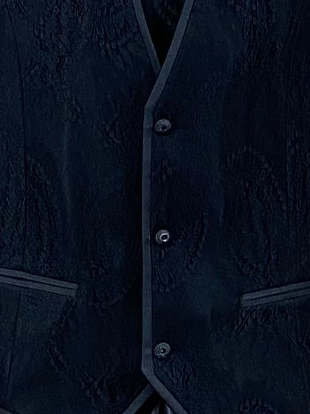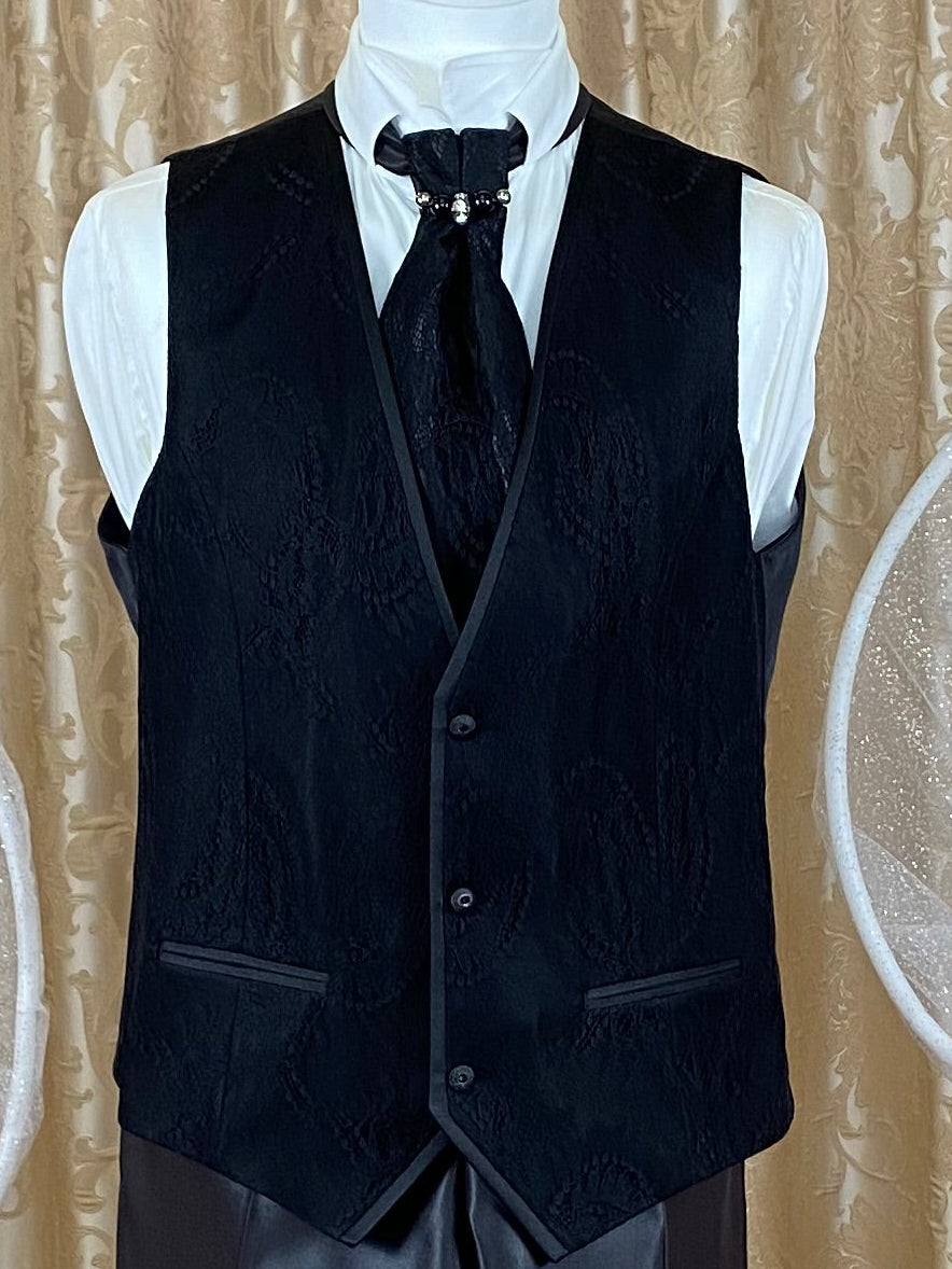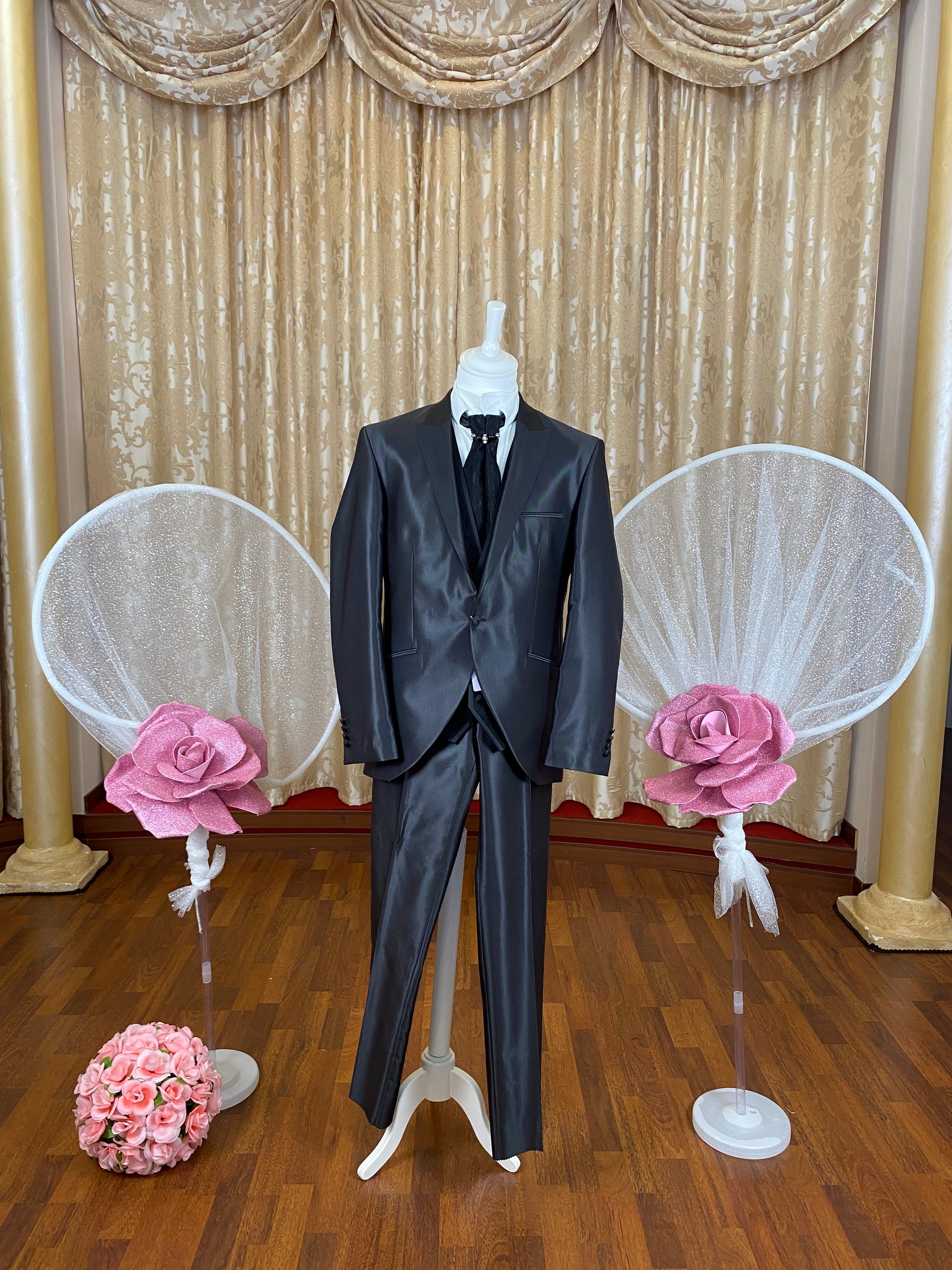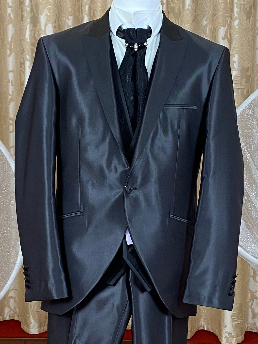 Un completo dallo stile impeccabile, in **prezioso tessuto grigio scuro lucido** con dettagli in nero intenso, pensato per l’uomo che vuole distinguersi con eleganza. La giacca dal taglio sartoriale si abbina a un gilet coordinato che dona un tocco di classe. Il protagonista è il cravattone lavorato con preziosi ricami di perle e cristalli, per un effetto luminoso e sofisticato. Ideale per cerimonie importanti, questo abito unisce raffinatezza, personalità e fascino intramontabile.