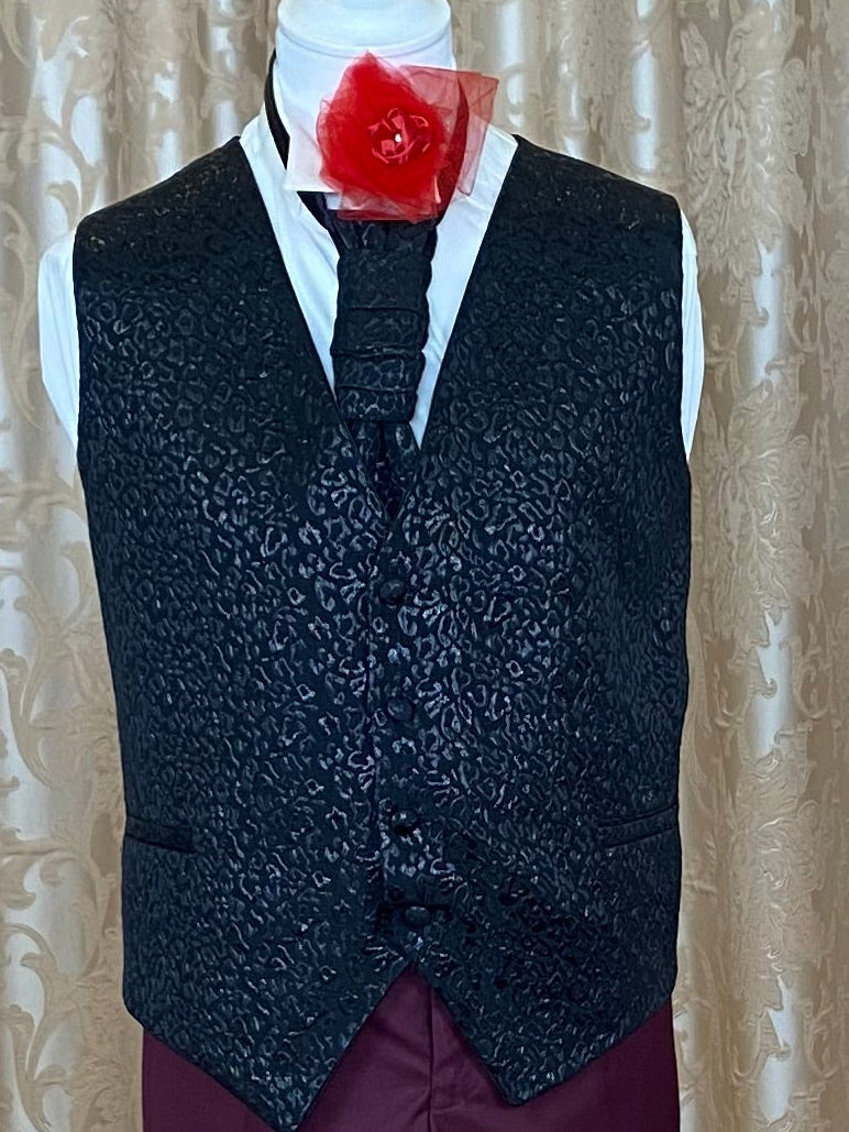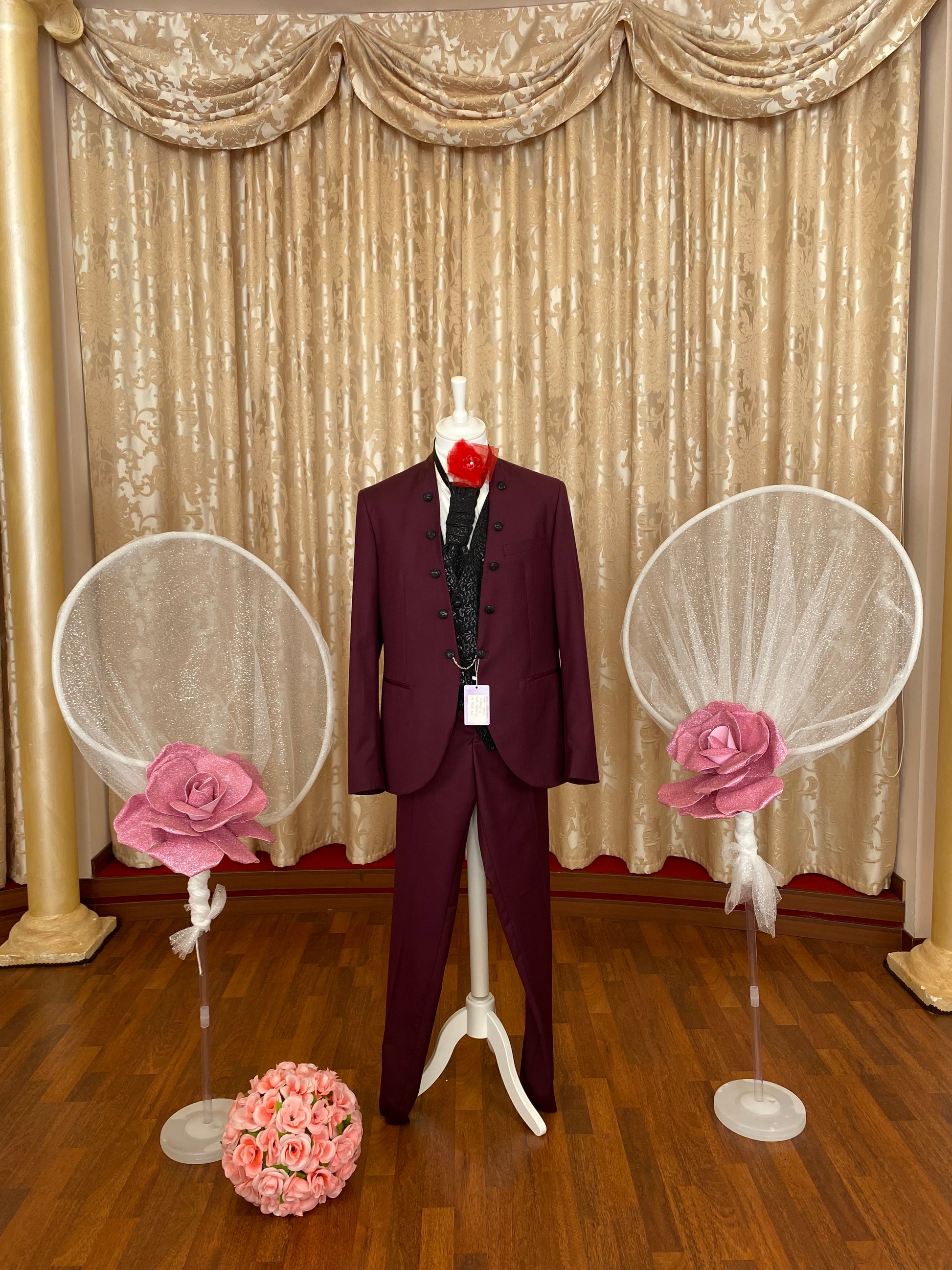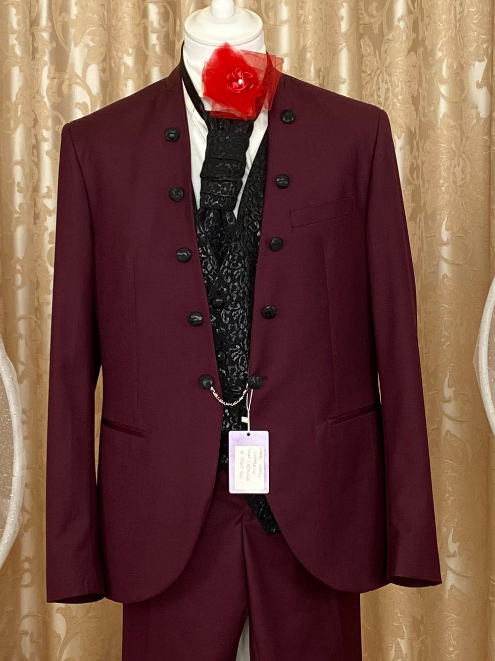 Raffinato completo uomo in tonalità **bordeaux intenso**, caratterizzato da **giacca alla coreana** dal taglio moderno e sofisticato. Il **gilet nero a rilievo** impreziosisce l’insieme con dettagli materici, mentre i **bottoni a rilievo** aggiungono un tocco di stile sartoriale. La giacca è arricchita da una **catenella decorativa**, per un effetto ricercato e distintivo. Ideale per cerimonie ed eventi speciali, questo abito unisce **tradizione e modernità** con una vestibilità impeccabile.