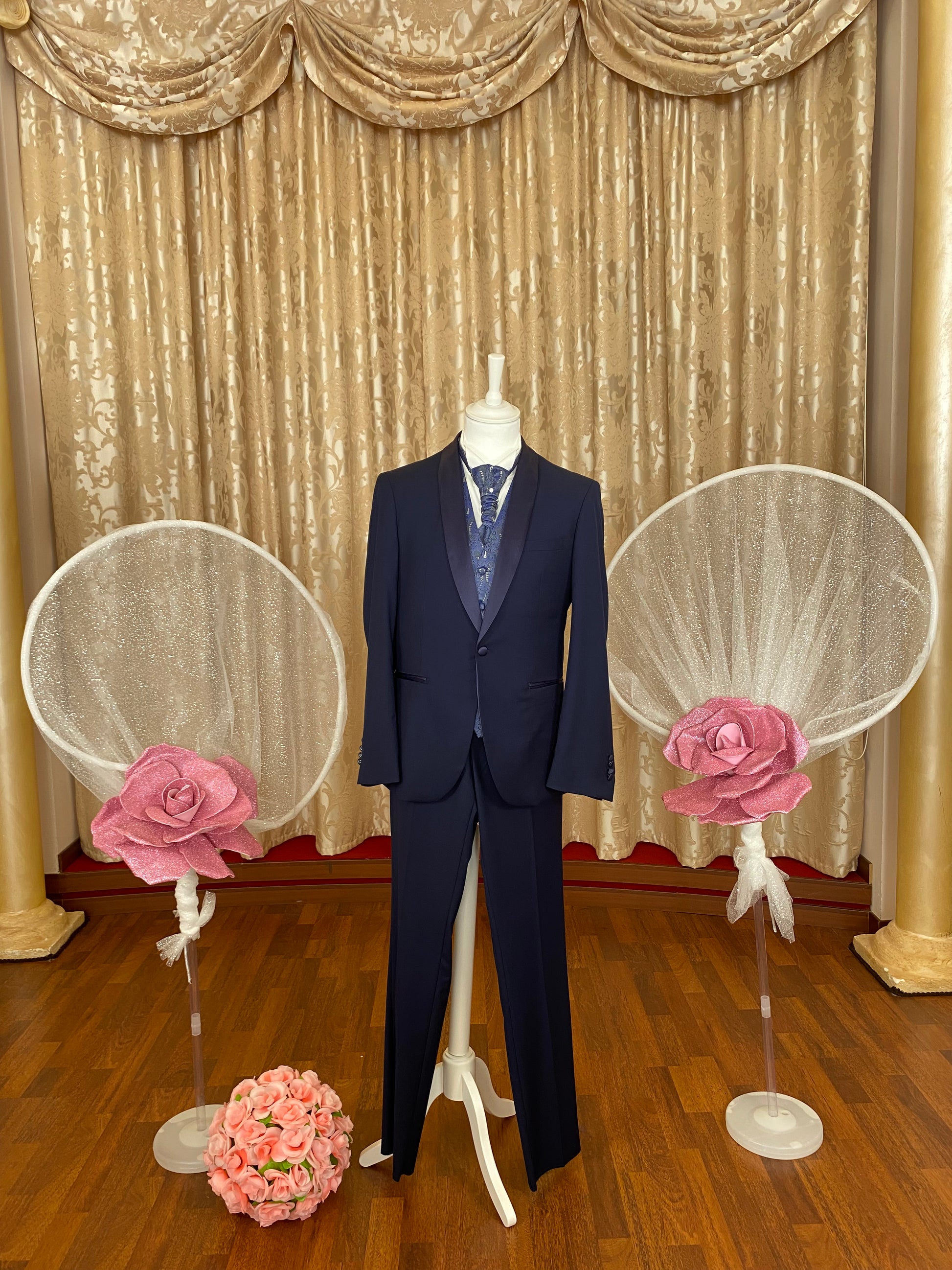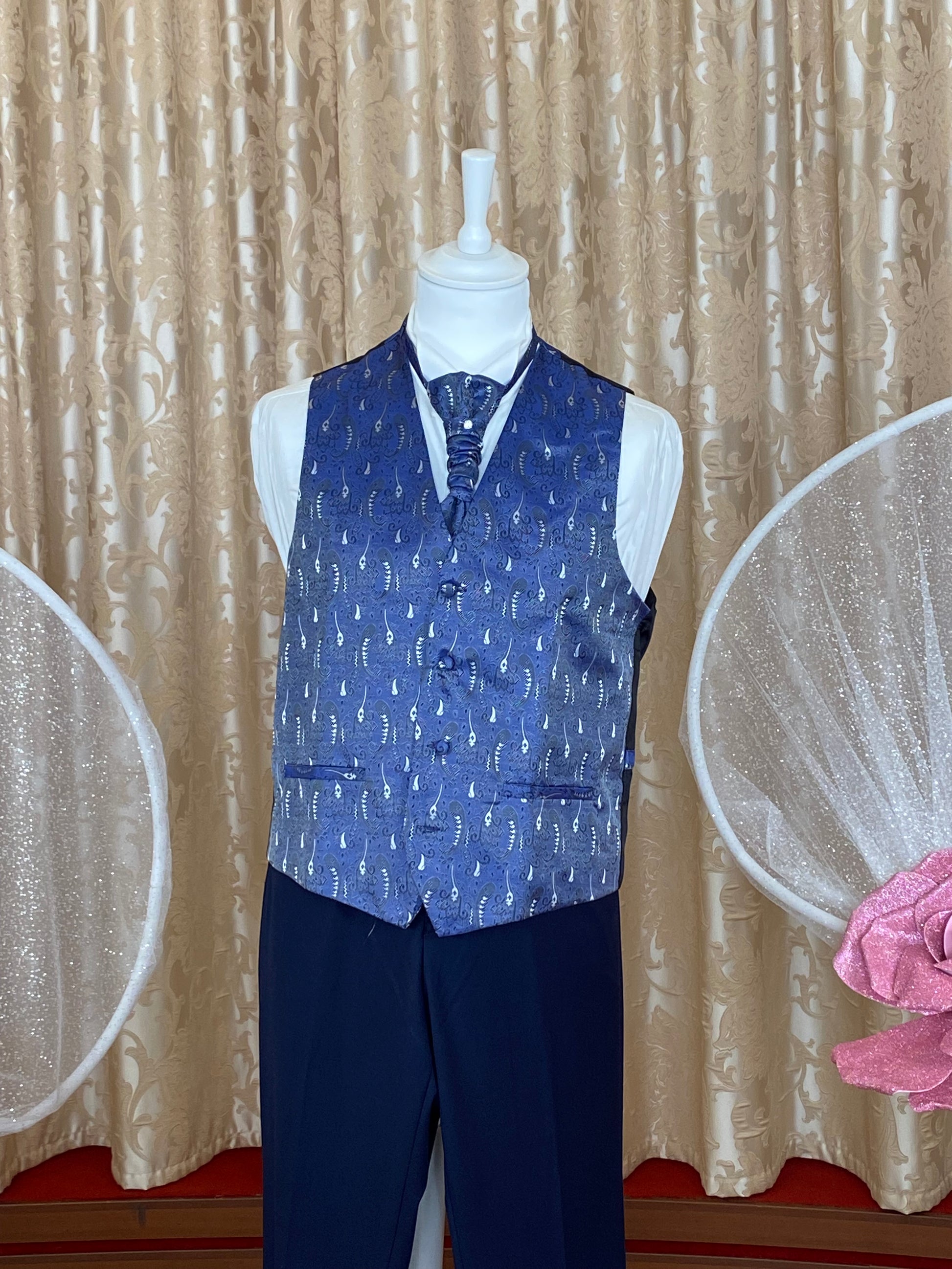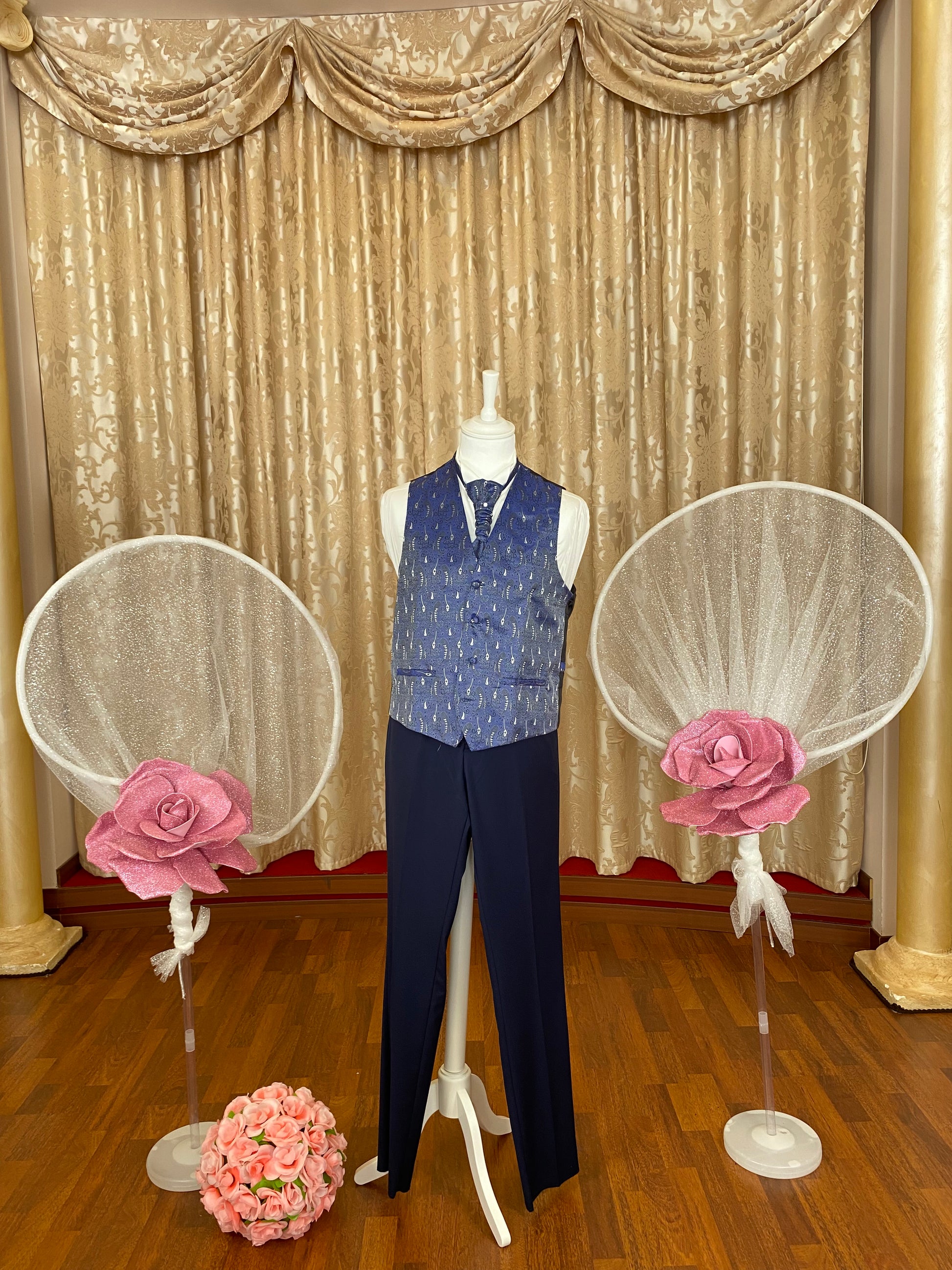 *Abito smoking blu** dallo stile raffinato e contemporaneo, realizzato in tessuto di alta qualità con una vestibilità impeccabile. Completo di **gilet coordinato** e **cravattone** per un tocco cerimoniale di classe, arricchito da un **papillon decorato** in tonalità **avion**, che dona luminosità e carattere all’insieme. Perfetto per eventi formali, questo completo esprime fascino e personalità in ogni dettaglio.