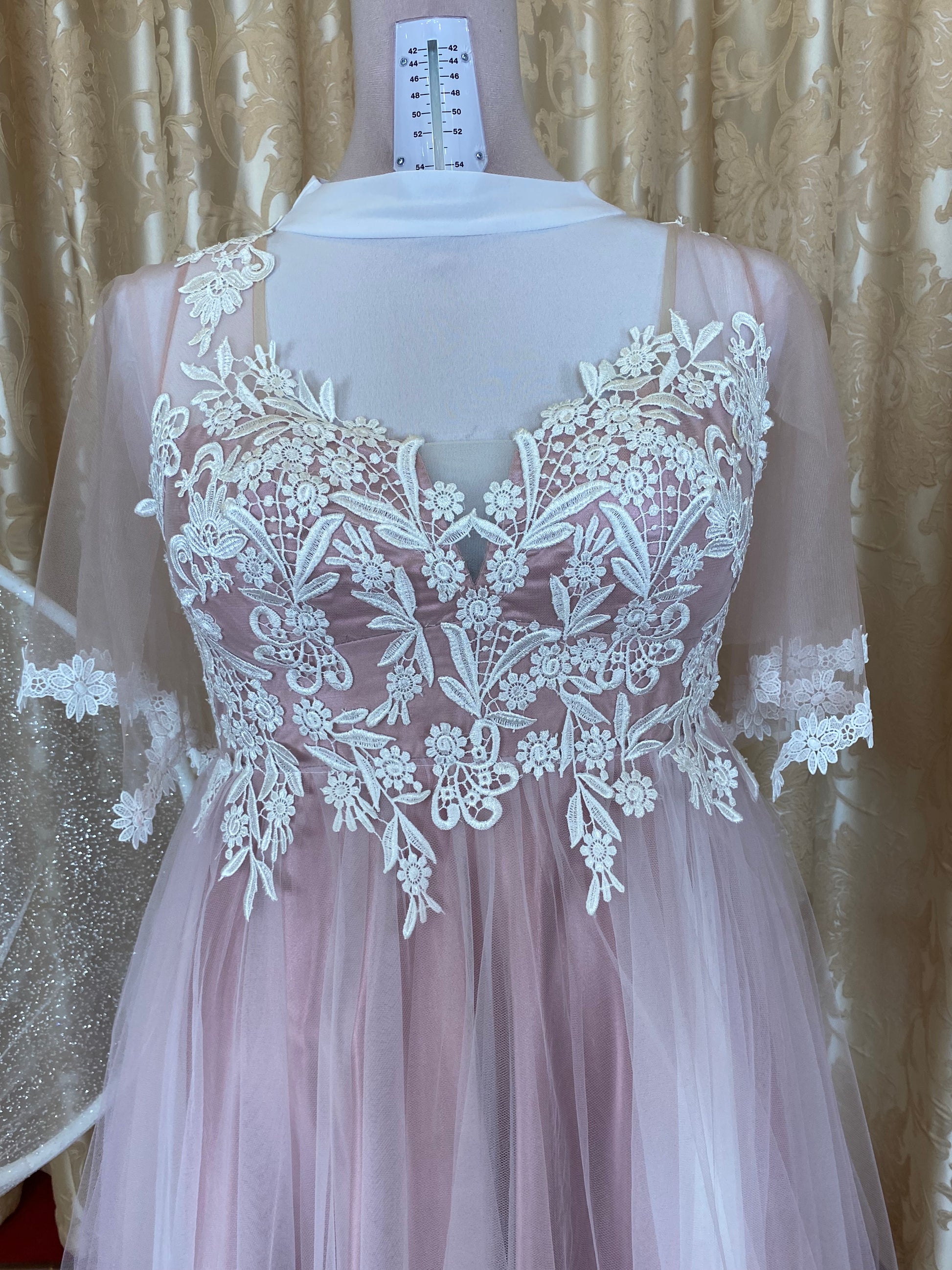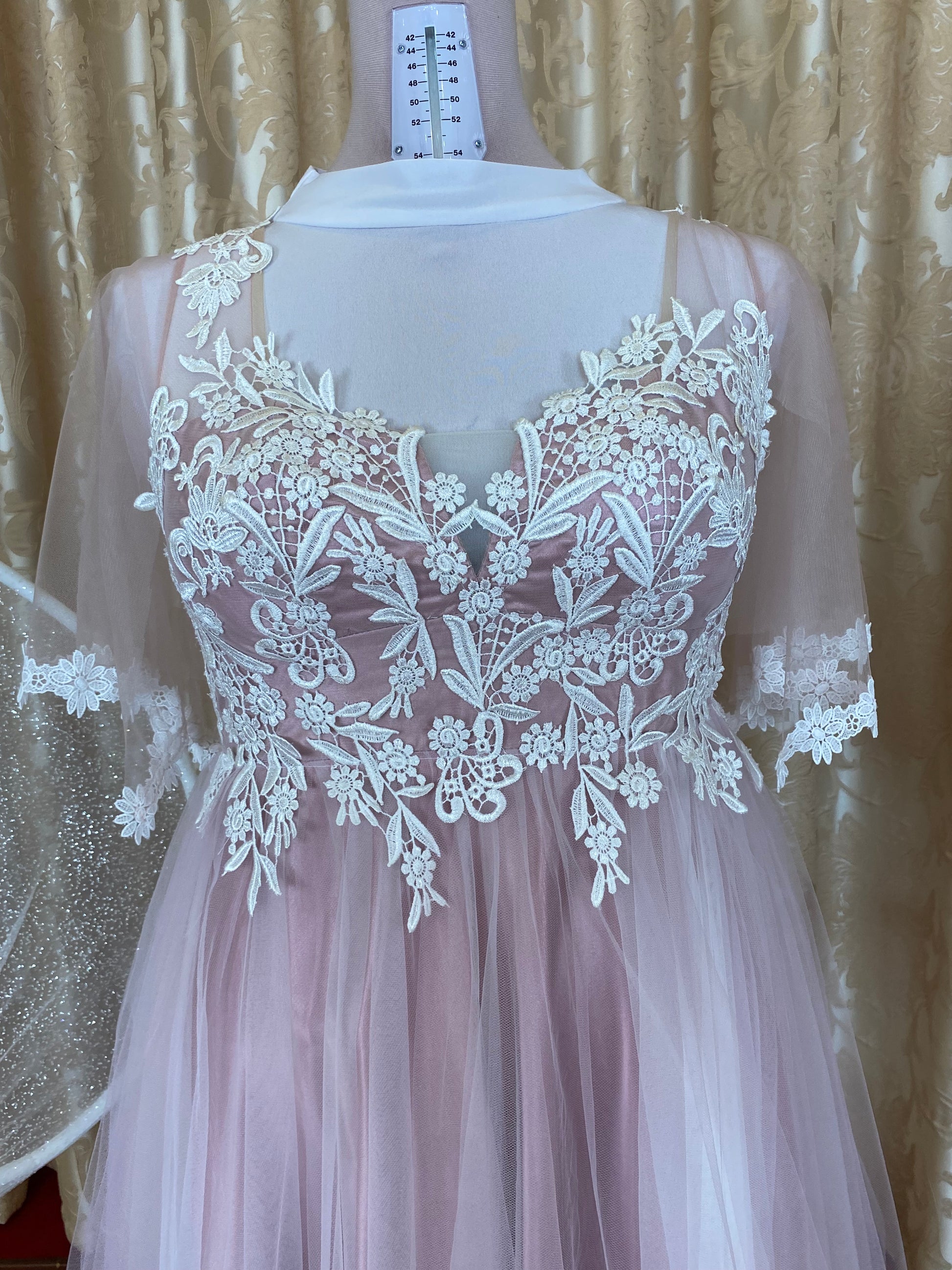 Un sogno di eleganza e raffinatezza, questo abito da sposa creazione sartoriale Made in Italy è pensato per valorizzare le forme con grazia e armonia. Il **corpino a cuore** abbraccia delicatamente la silhouette, arricchito da **maniche in tulle impreziosite da pizzo macramè** nei toni **bianco seta** e **rosa cipria**, creando un effetto romantico e senza tempo. 🌸