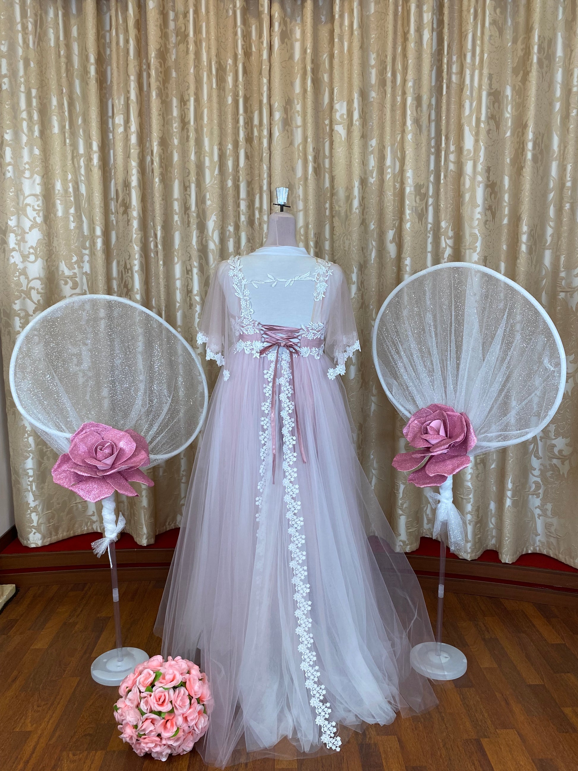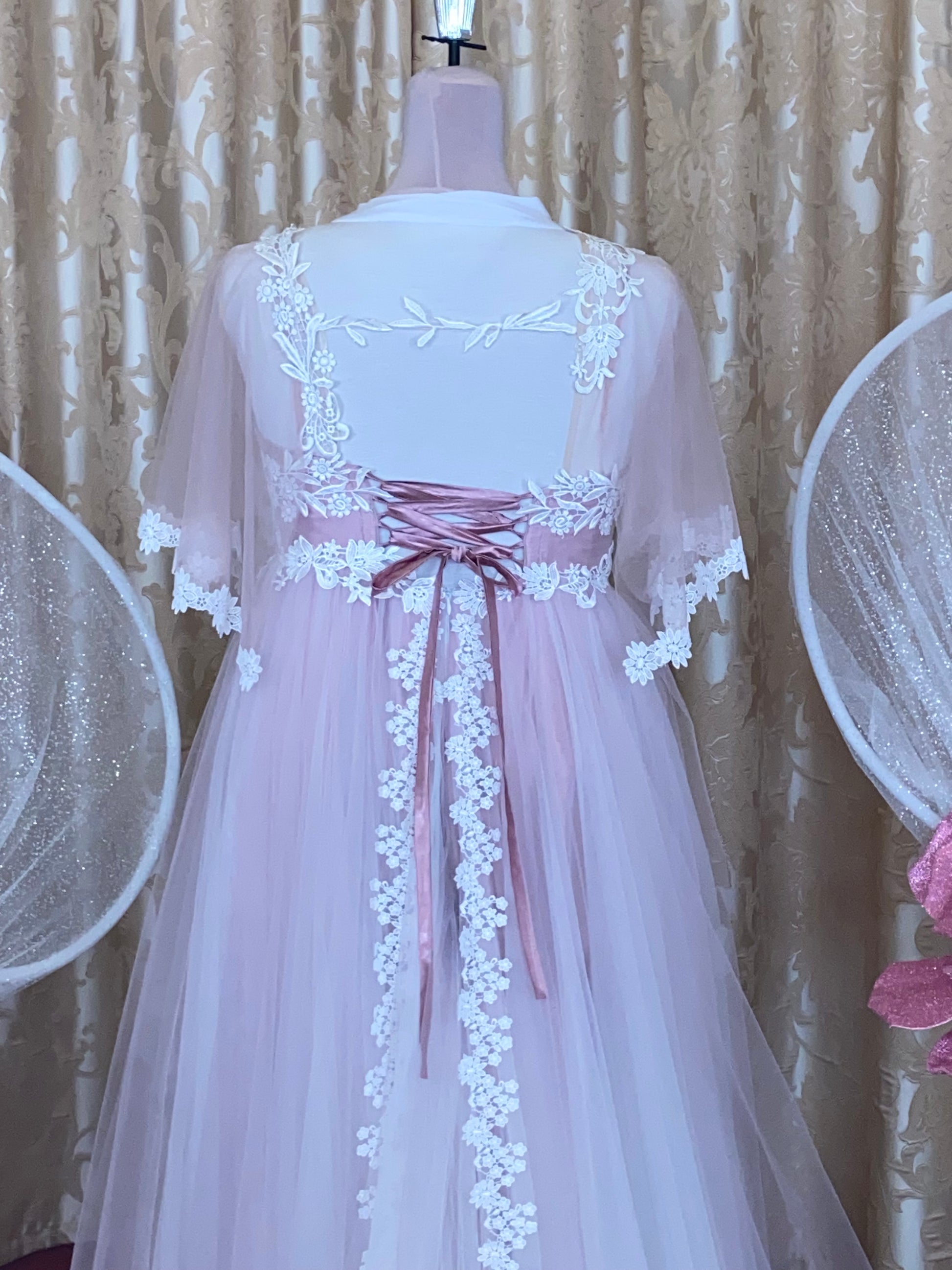 La **gonna stile principessa** scivola morbida e maestosa, donando volume e leggerezza ad ogni passo. Sul retro, **stringhe e laccetti regolabili** permettono di adattare l’abito **fino a due taglie in più**, garantendo comfort e vestibilità perfetta.