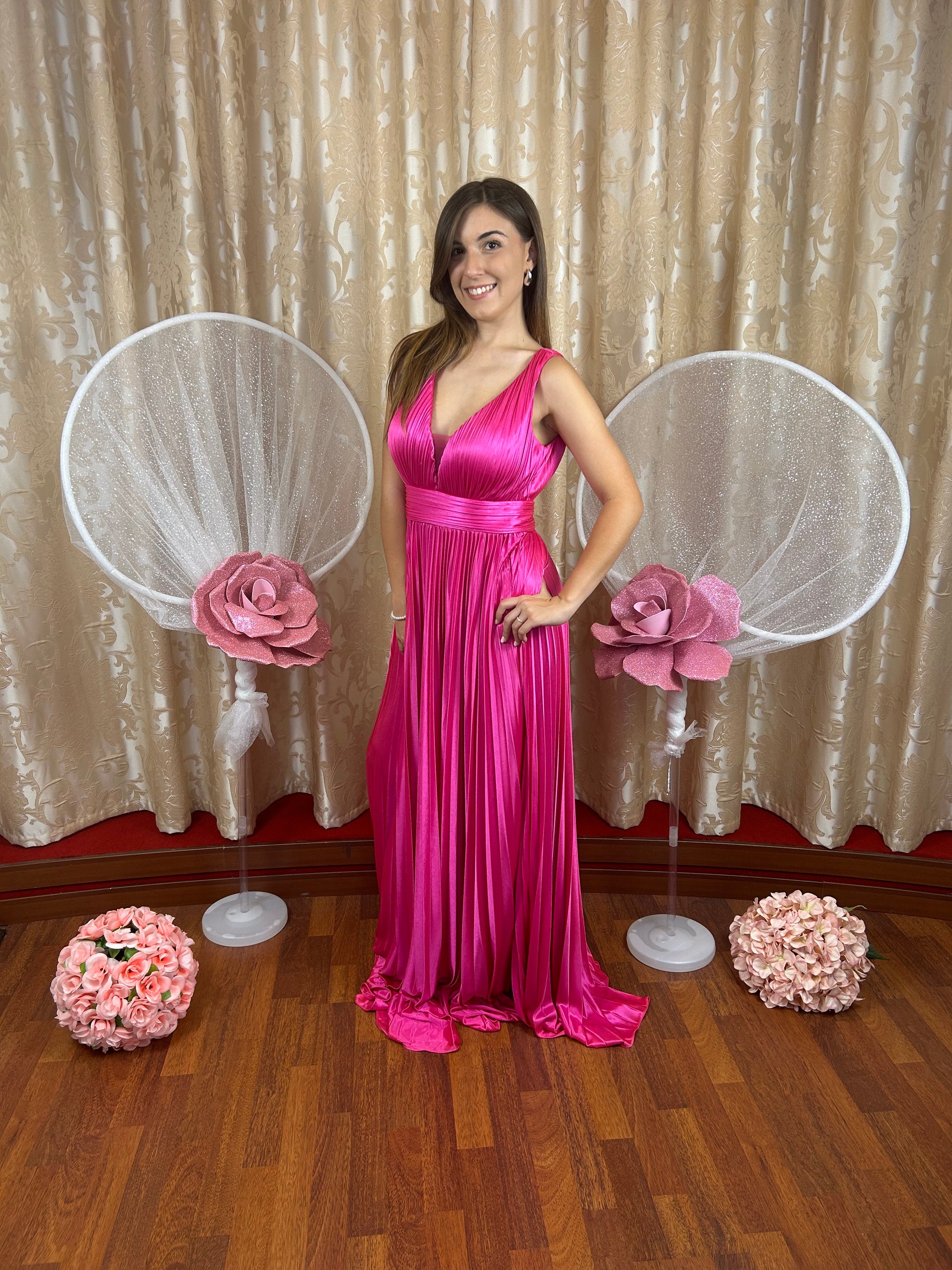 Un’eleganza senza tempo per questo abito da cerimonia in una vibrante tonalità ciclamino, pensato per valorizzare ogni figura con grazia. Il corpino plissettato con scollo a V sia sul davanti che sul retro dona al décolleté e alla schiena un tocco raffinato e femminile.