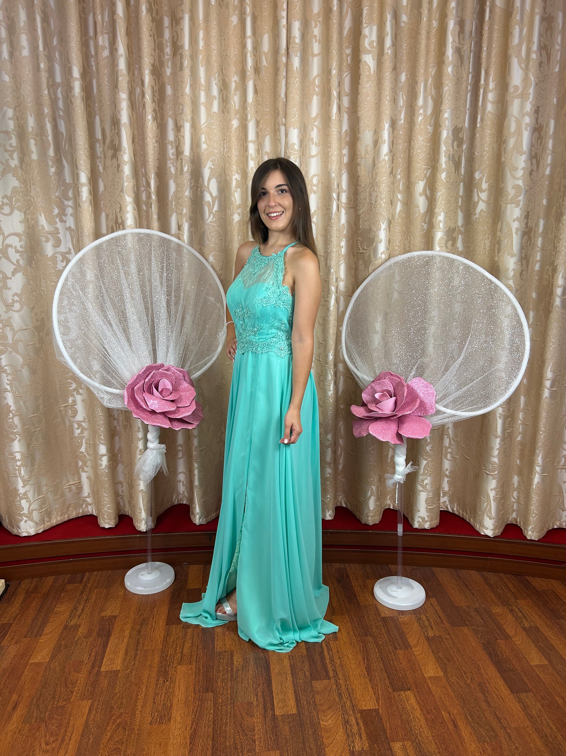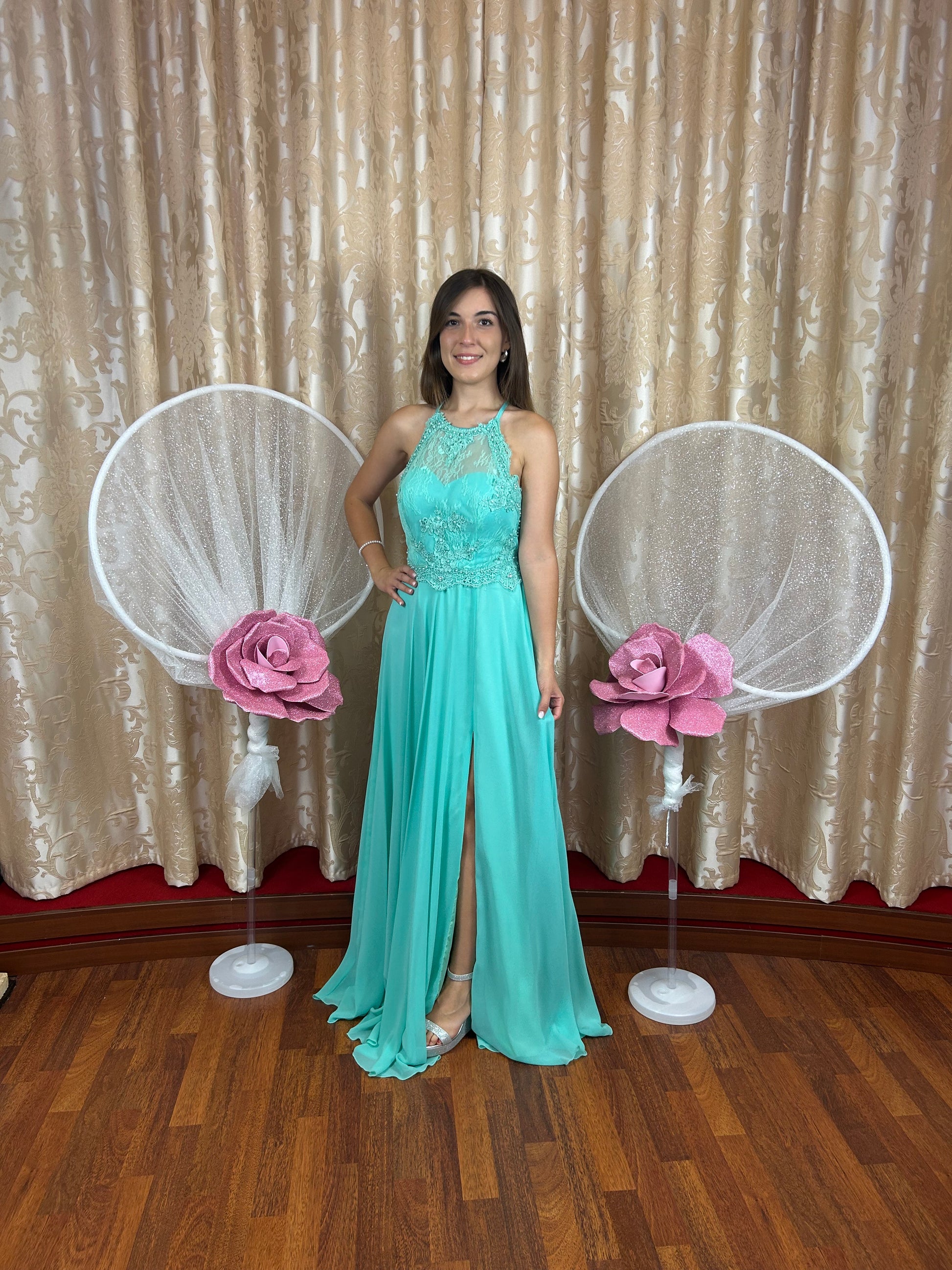 Un’eleganza senza tempo per questo raffinato abito da cerimonia verde Tiffany, impreziosito da un corpino con scollo all’americana, delicatamente lavorato in pizzo Chantilly e decorato con applicazioni in macramè e cristalli tono su tono che aggiungono luminosità e raffinatezza senza eccessi.