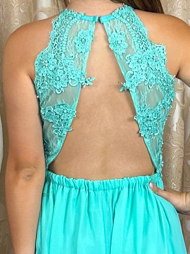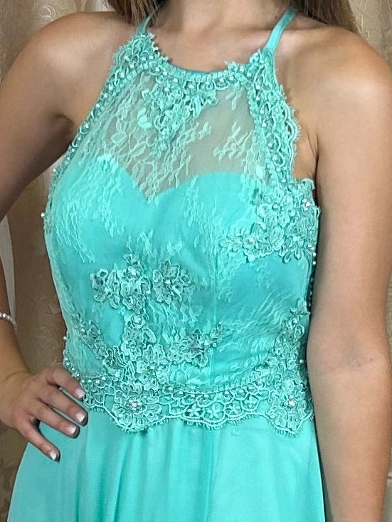 Abito da cerimonia verde Tiffany con scollo all’americana e dettagli in pizzo