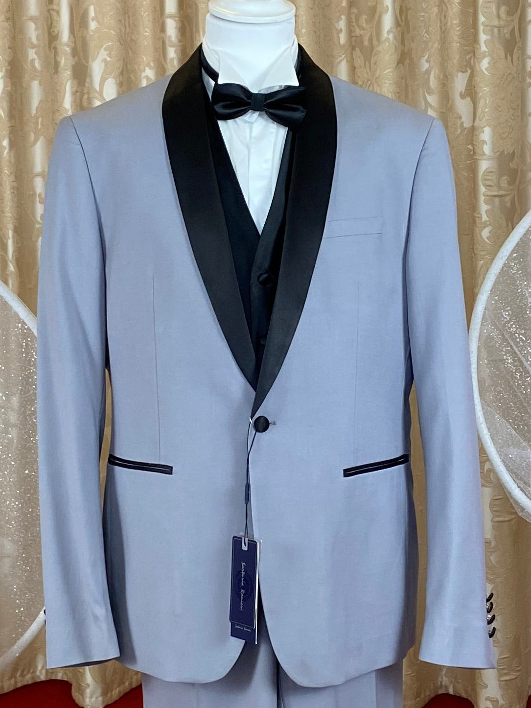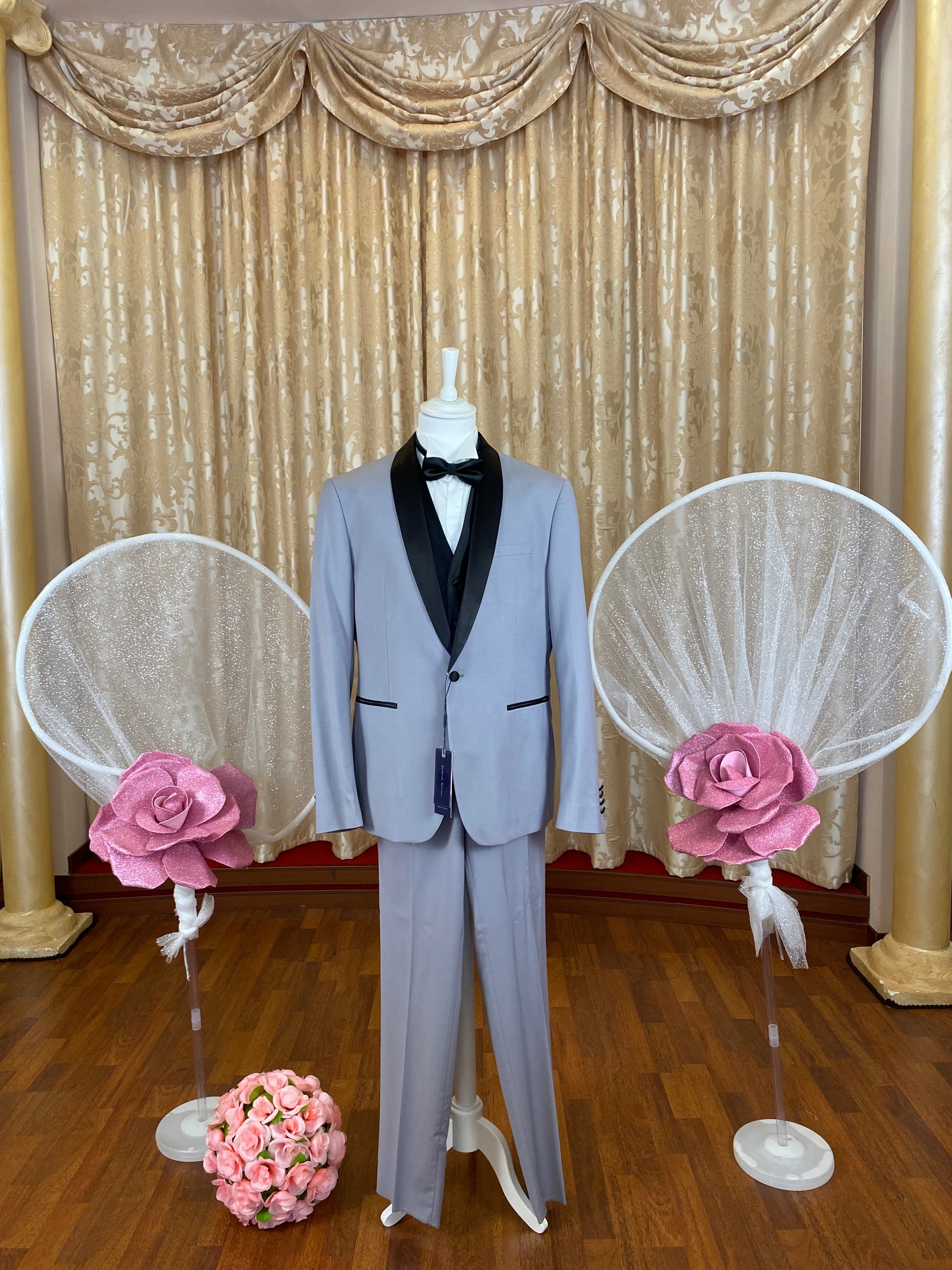 Prestigioso smoking in raffinato grigio chiaro, realizzato con tessuti di alta qualità che assicurano comfort e portamento impeccabile. Il gilet nero aggiunge un elegante contrasto cromatico, mentre il cravattone dona un tocco di solennità. Per un look più contemporaneo, è incluso anche il papillon, perfetto per personalizzare lo stile in base al momento della cerimonia. Un capo che unisce tradizione e modernità, dedicato allo sposo che vuole distinguersi con sobria raffinatezza.