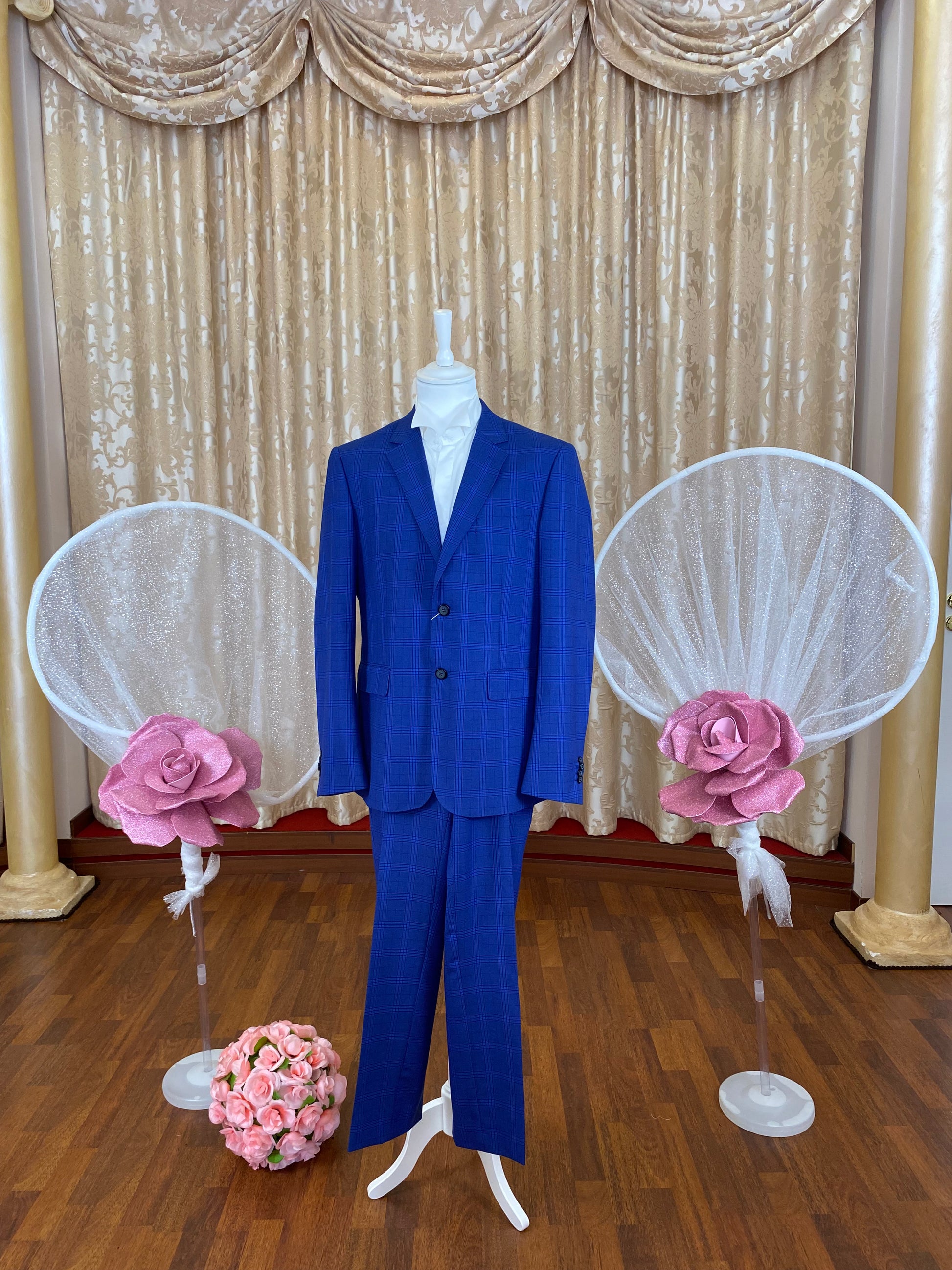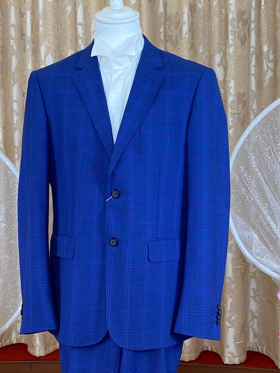 Eleganza senza tempo per questo **abito uomo stile Principe del Galles** in raffinato tessuto **bluette** con iconici **quadrettoni** dal carattere deciso. La giacca monopetto, dalla linea sartoriale, presenta rever classico e tasche a filetto, mentre il pantalone dritto completa il look con equilibrio e sobrietà. Un completo ideale per chi ama unire **tradizione e modernità**, perfetto per cerimonie, eventi formali o momenti in cui si vuole lasciare il segno con stile impeccabile