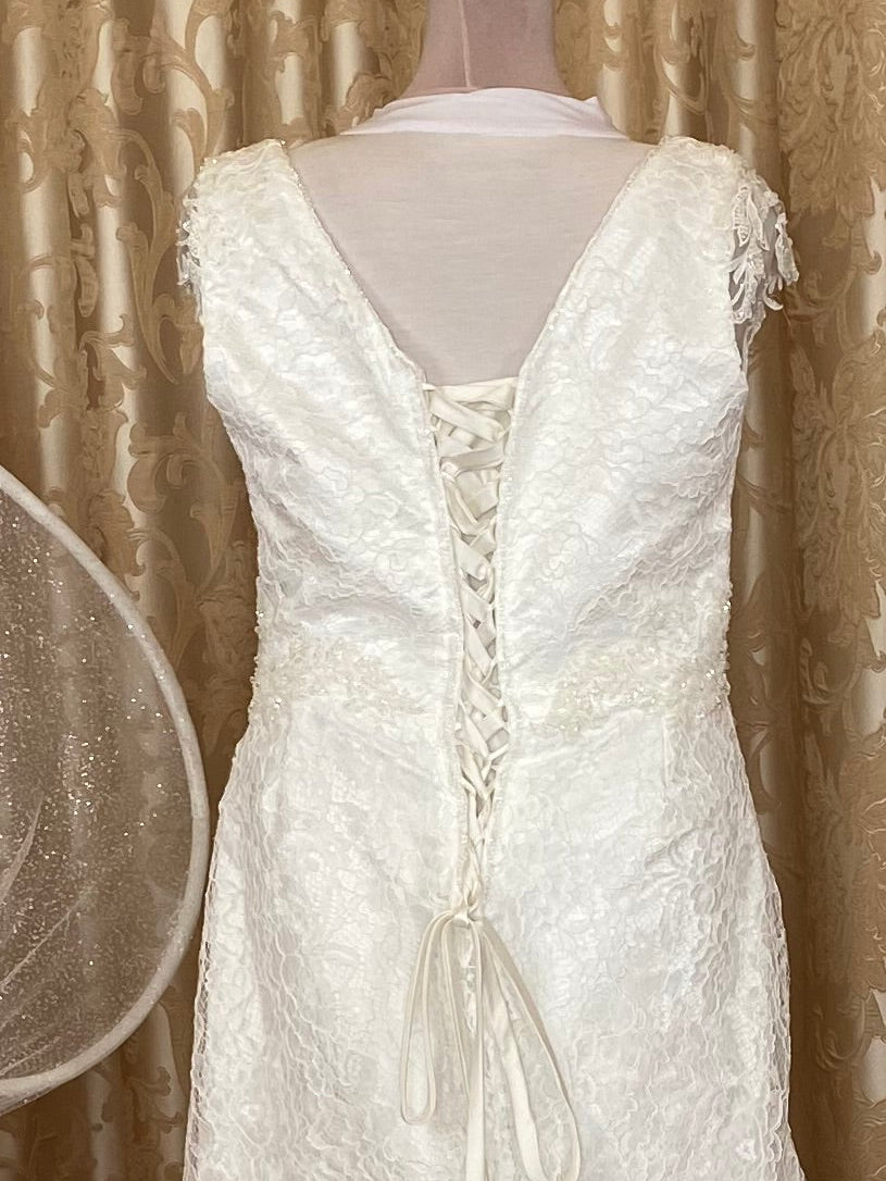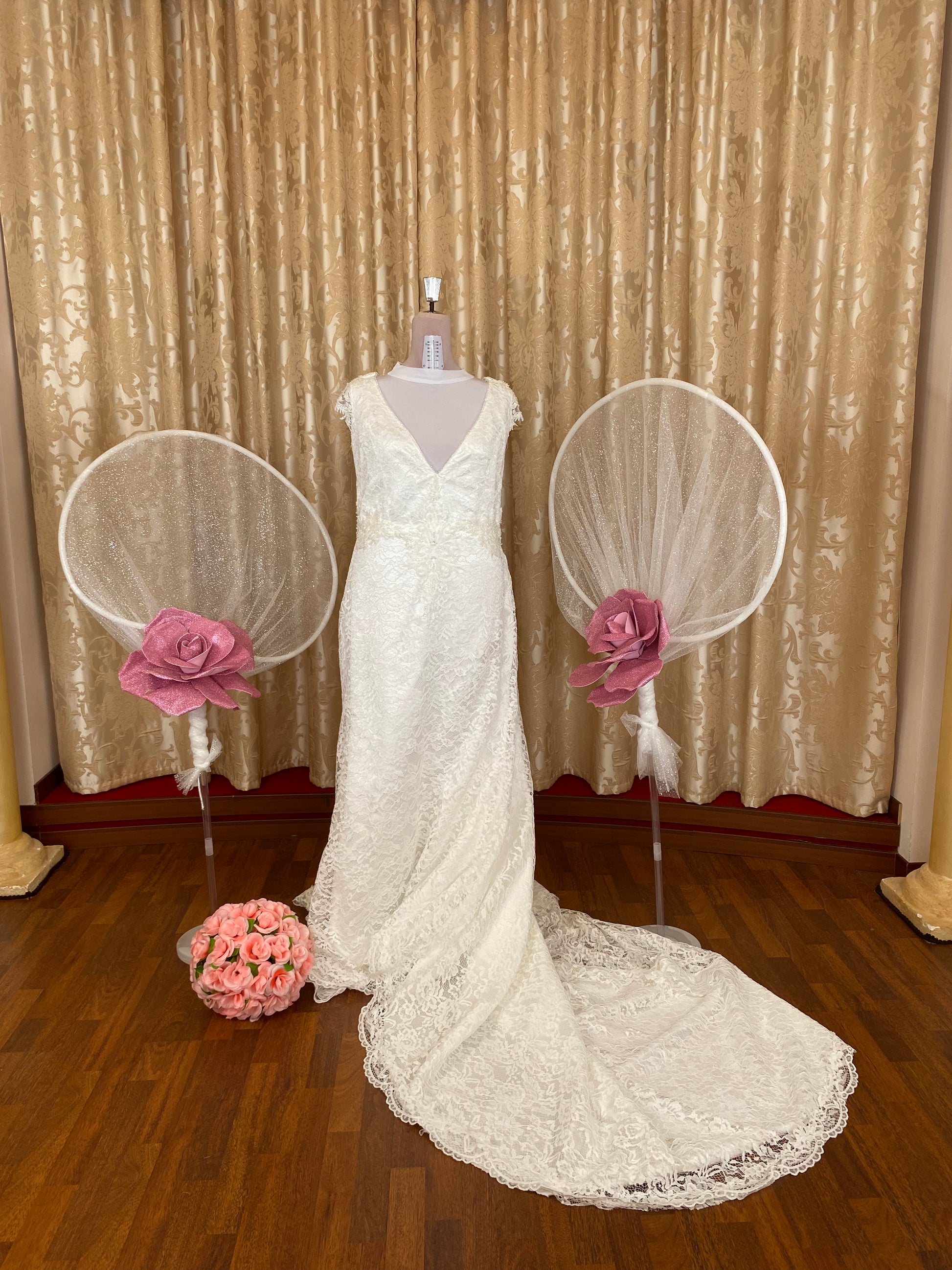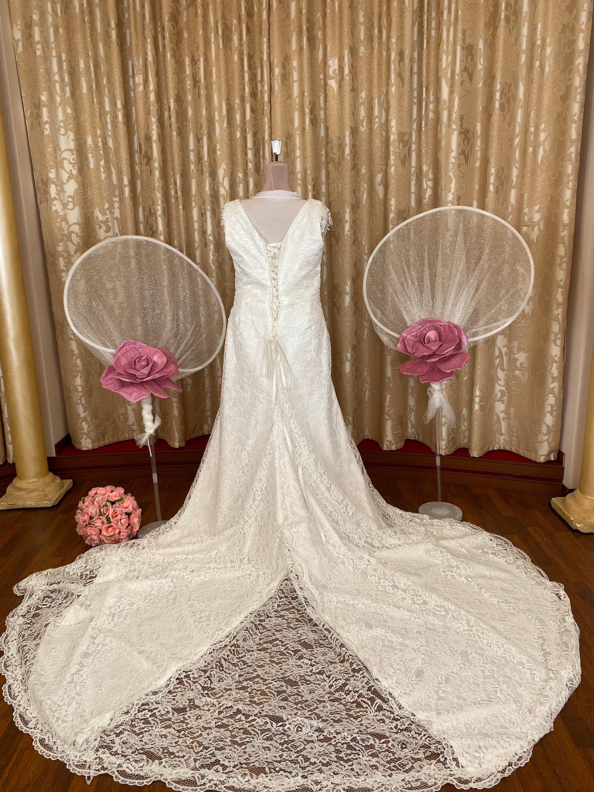 Torace 126 cm, vita 112 cm, fianchi 130 cm. Altezza gonna davanti 125 cm coda 285 cm
