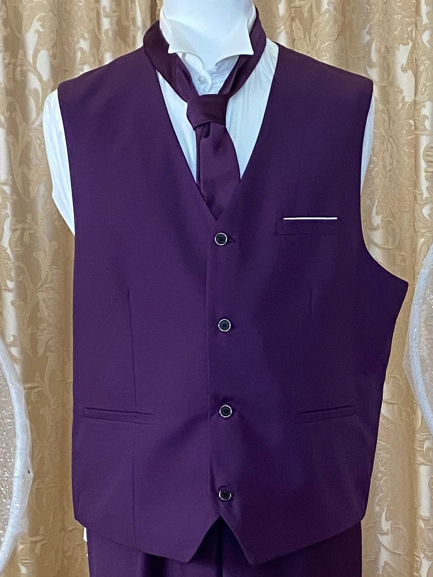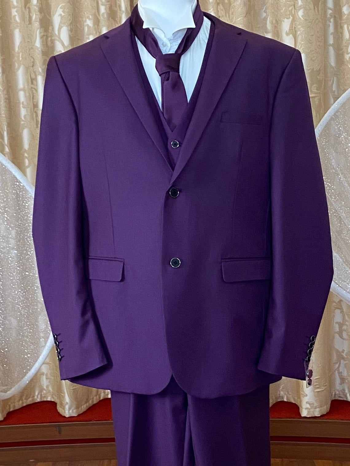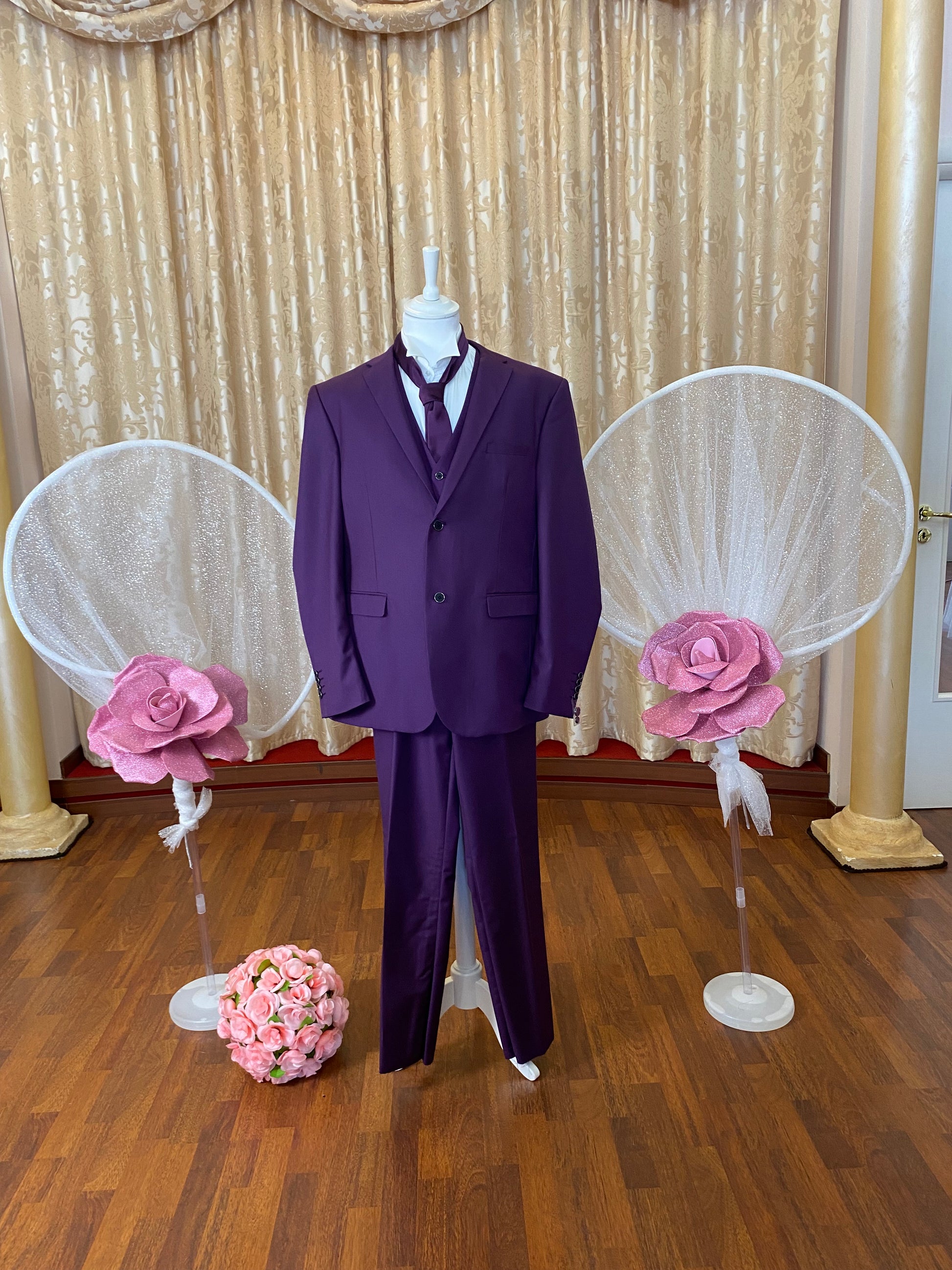 **Abito da sposo e cerimonia** dal fascino regale, realizzato in tessuto di alta qualità dal taglio sartoriale impeccabile. Il completo è proposto in un raffinato **colore porpora**, tonalità intensa e sofisticata che esprime personalità e classe. Il **gilet coordinato** e il **cravattone nello stesso porpora** aggiungono armonia cromatica e ricercatezza all’insieme. Linee eleganti e proporzioni perfette valorizzano la figura, rendendolo ideale per cerimonie, matrimoni e occasioni speciali dove distinguersi con stile.